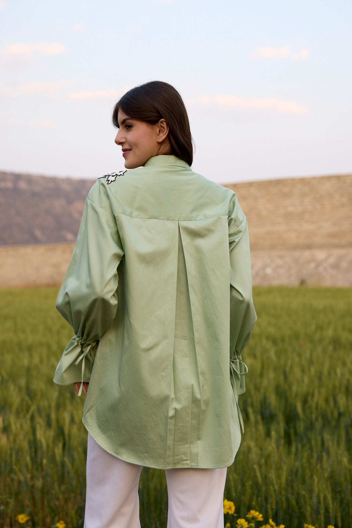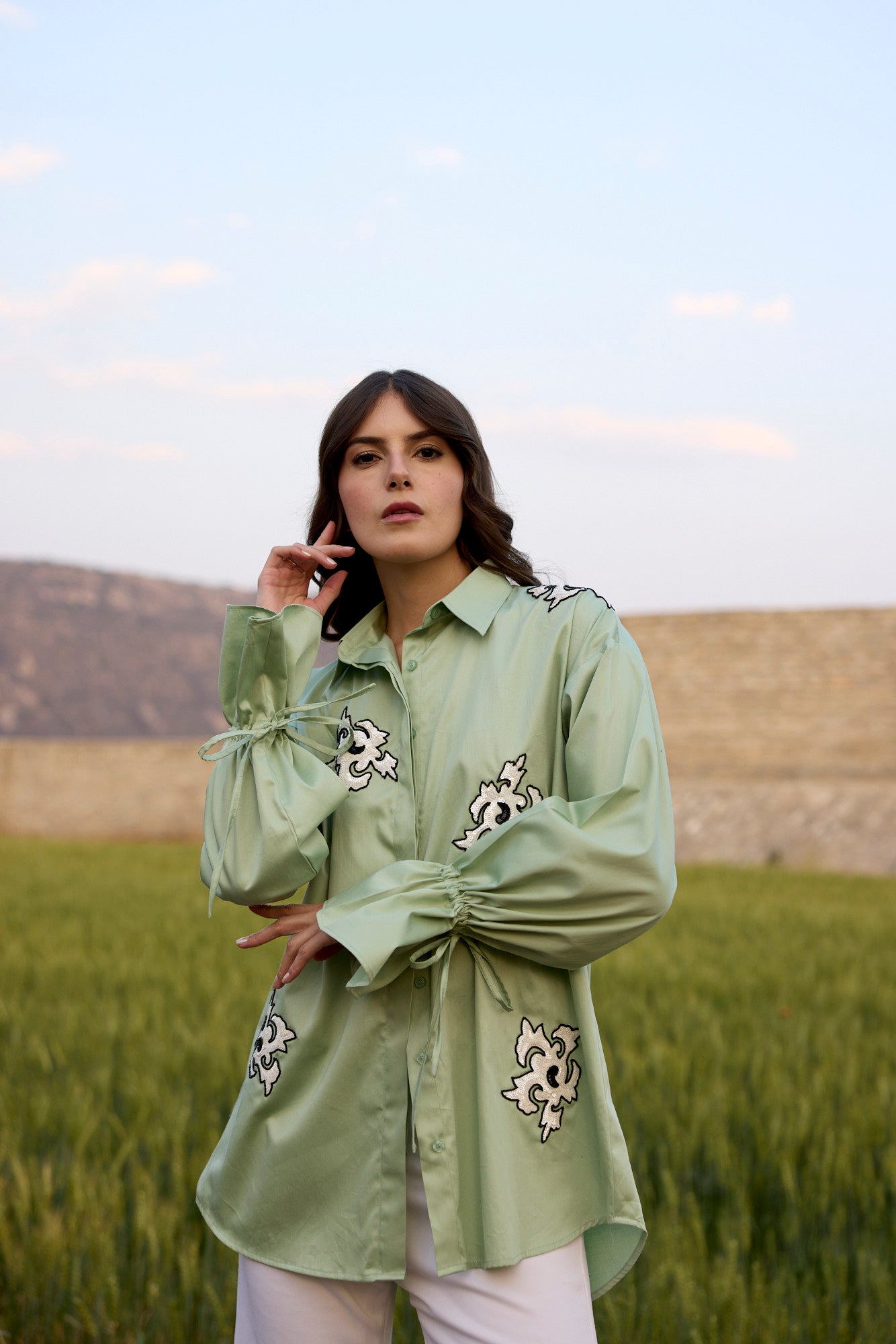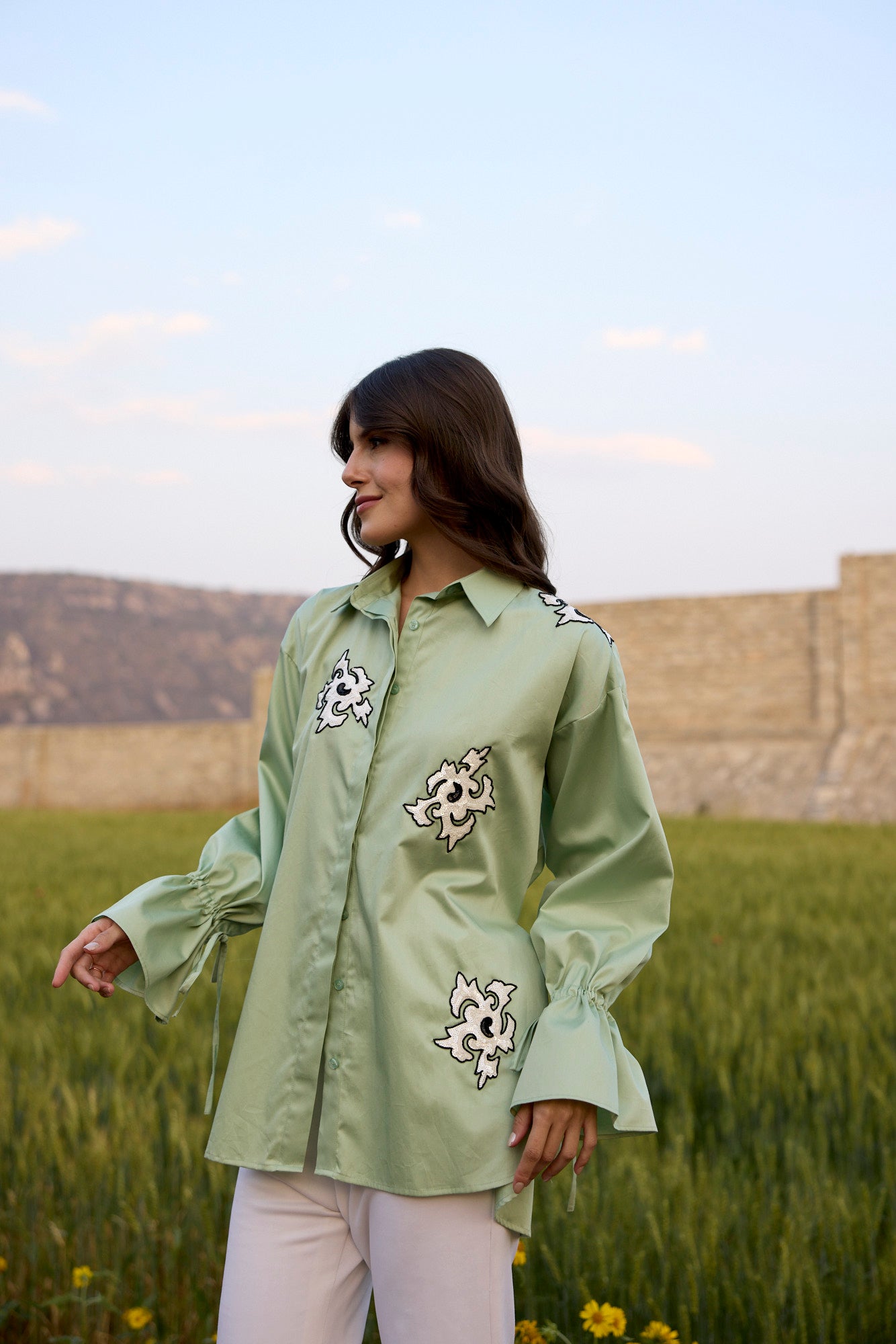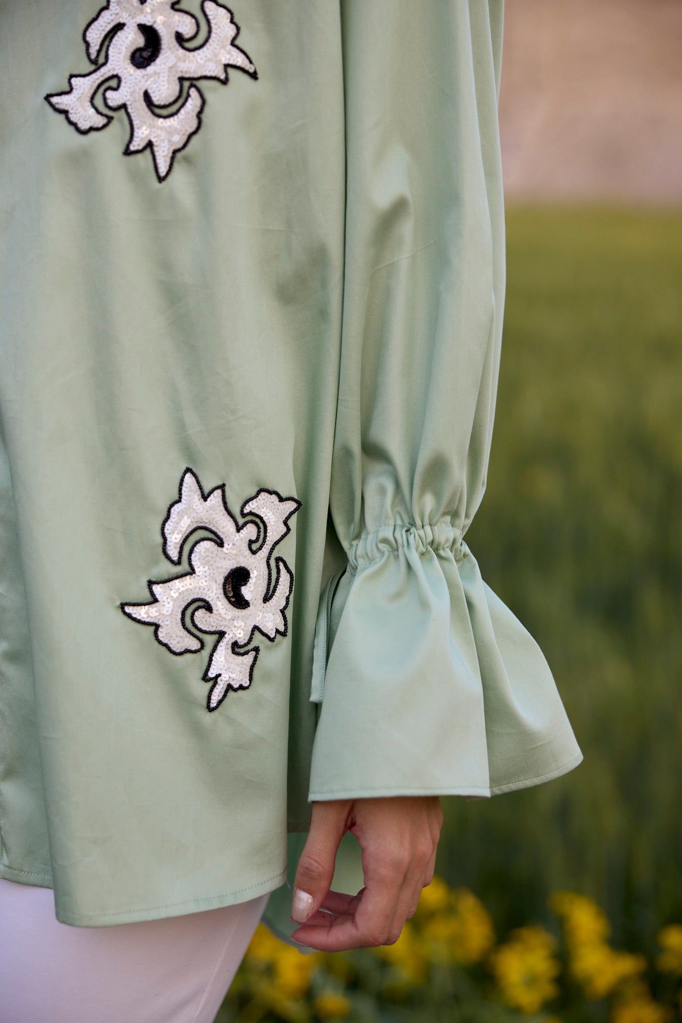 PISTACHIO GREEN SHIRT WITH WHITE ABSTRACT SEQUIN EMBROIDERY PATCH AND DRAWSTRING SLEEVES