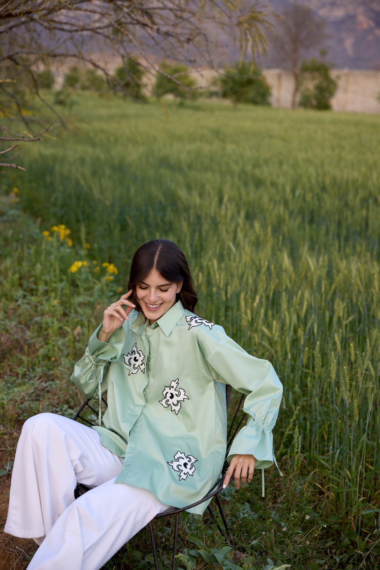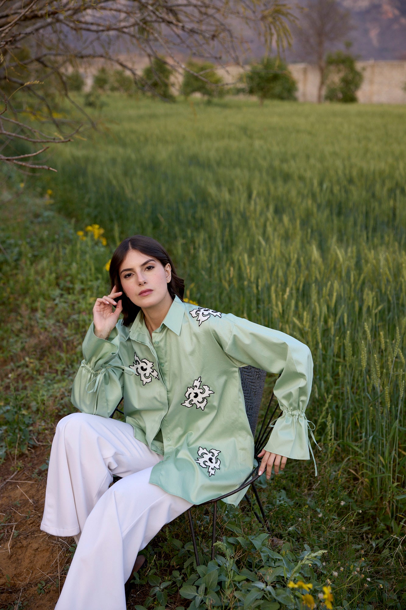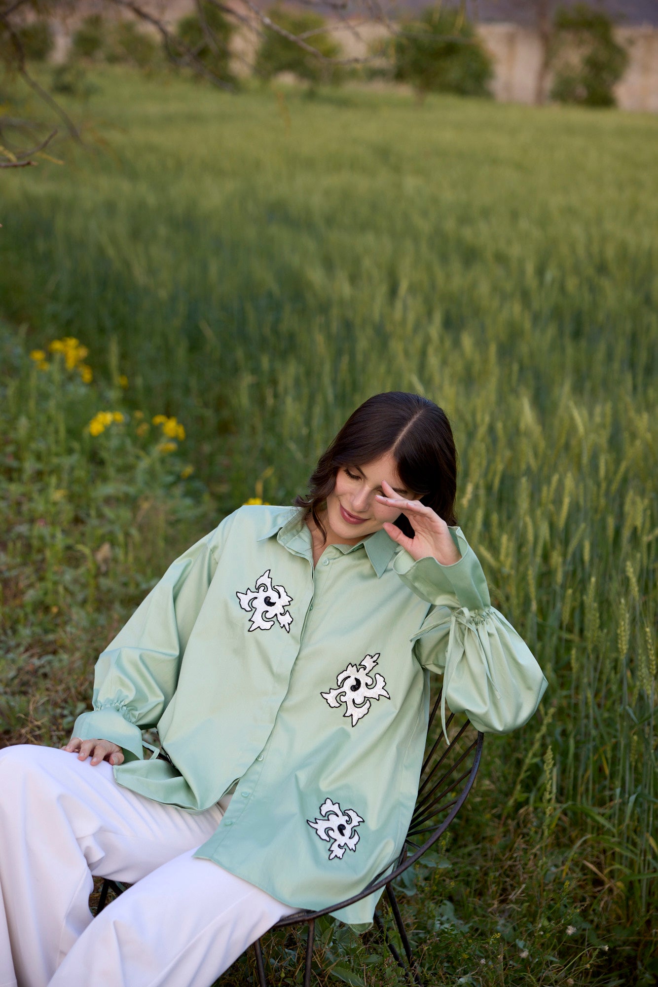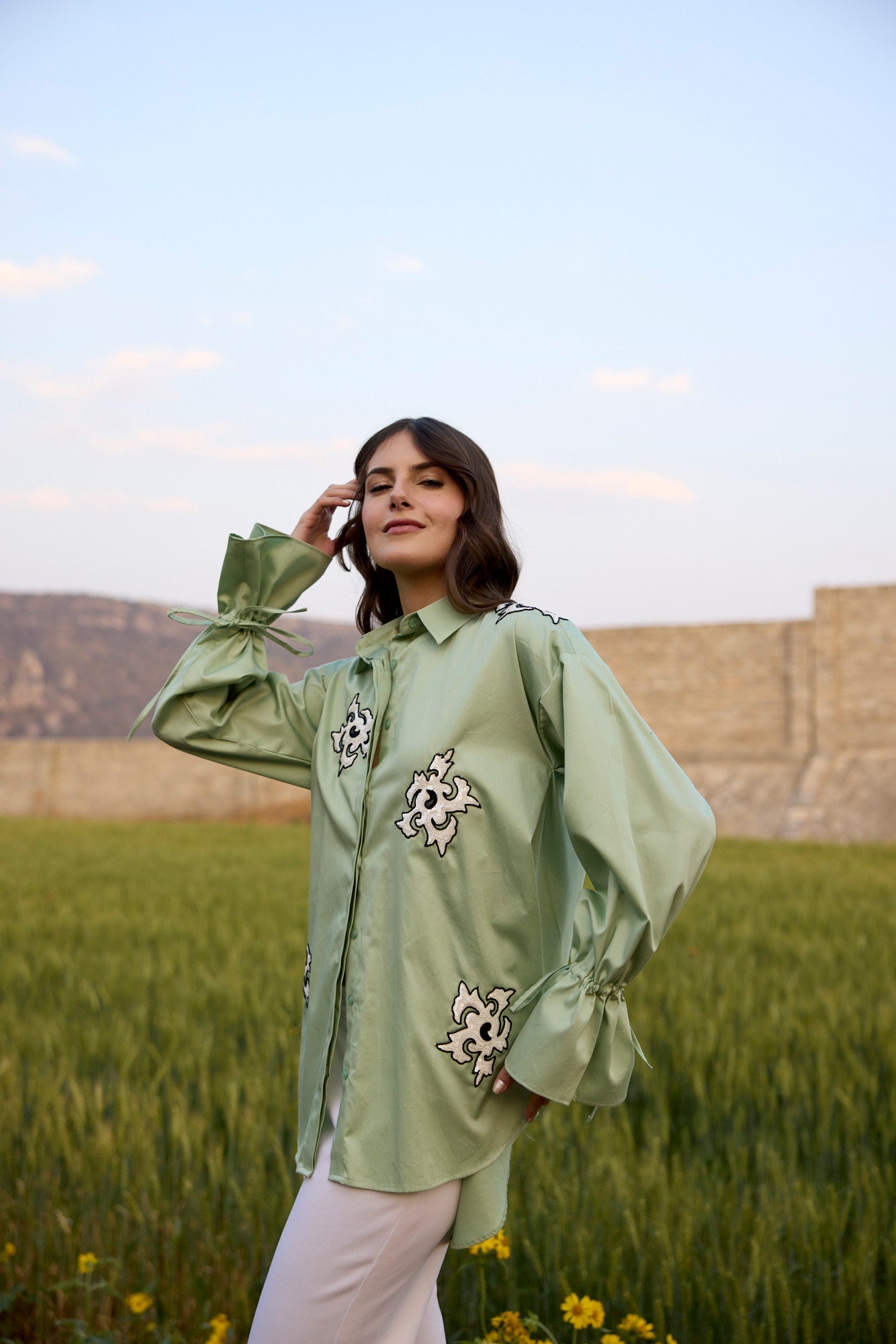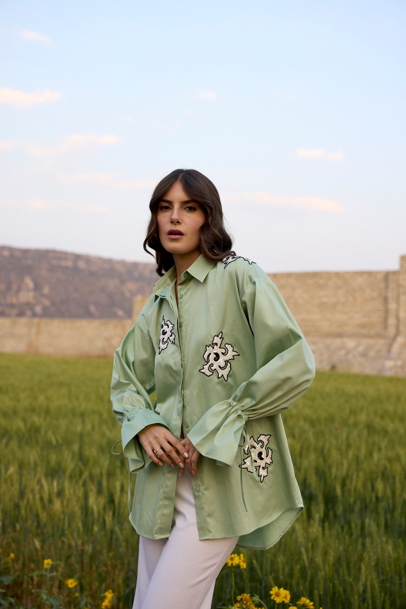 PISTACHIO GREEN SHIRT WITH WHITE ABSTRACT SEQUIN EMBROIDERY PATCH AND DRAWSTRING SLEEVES