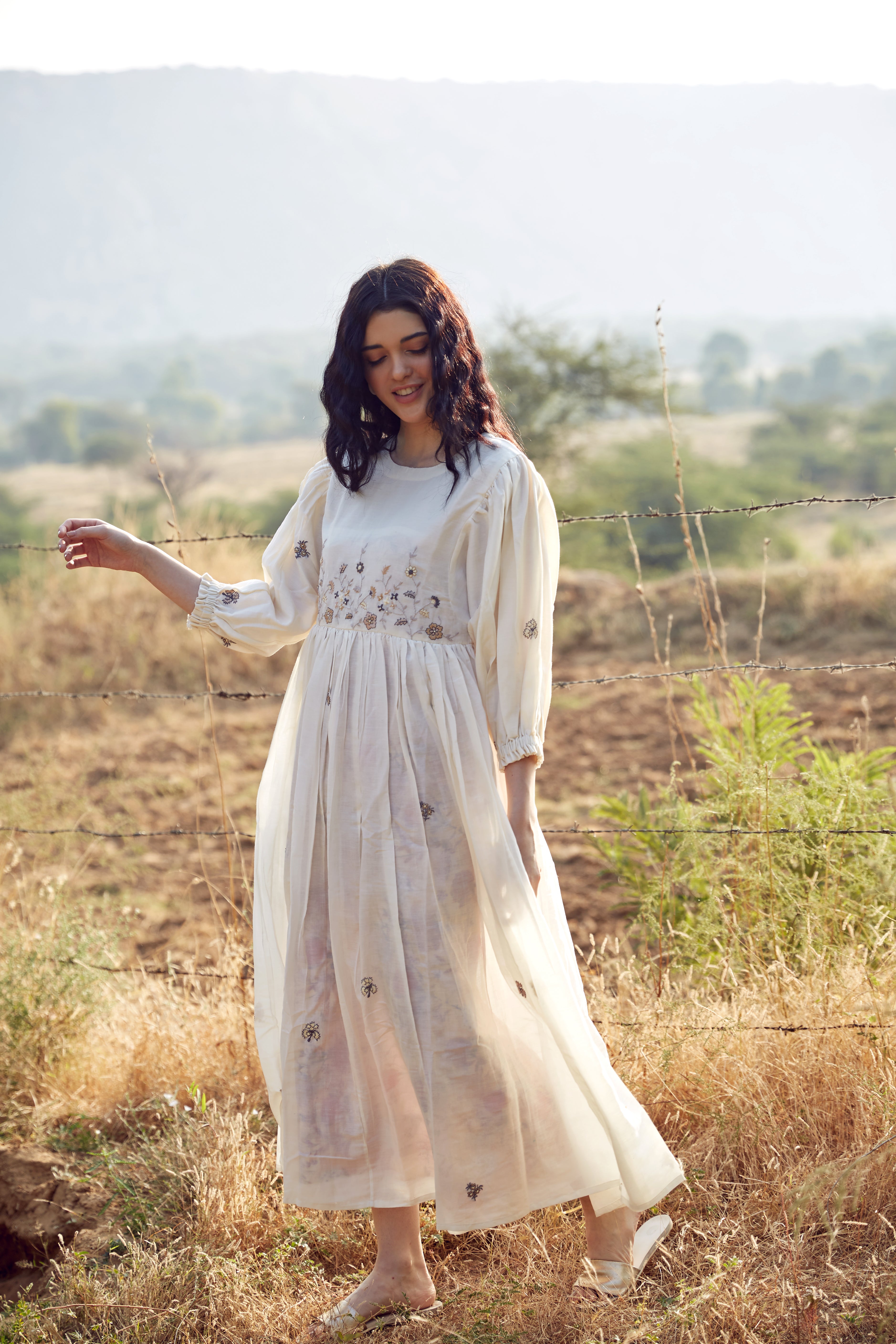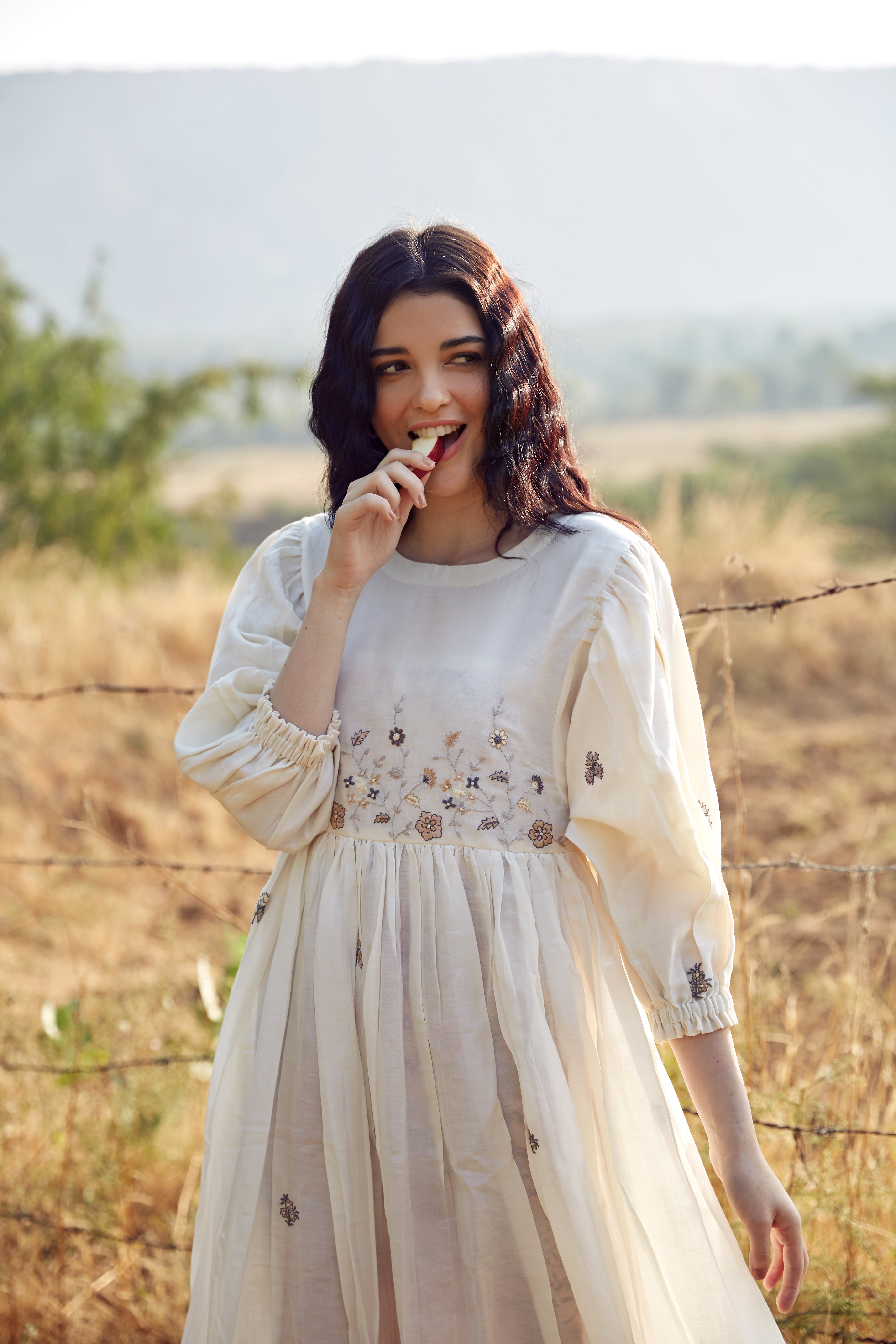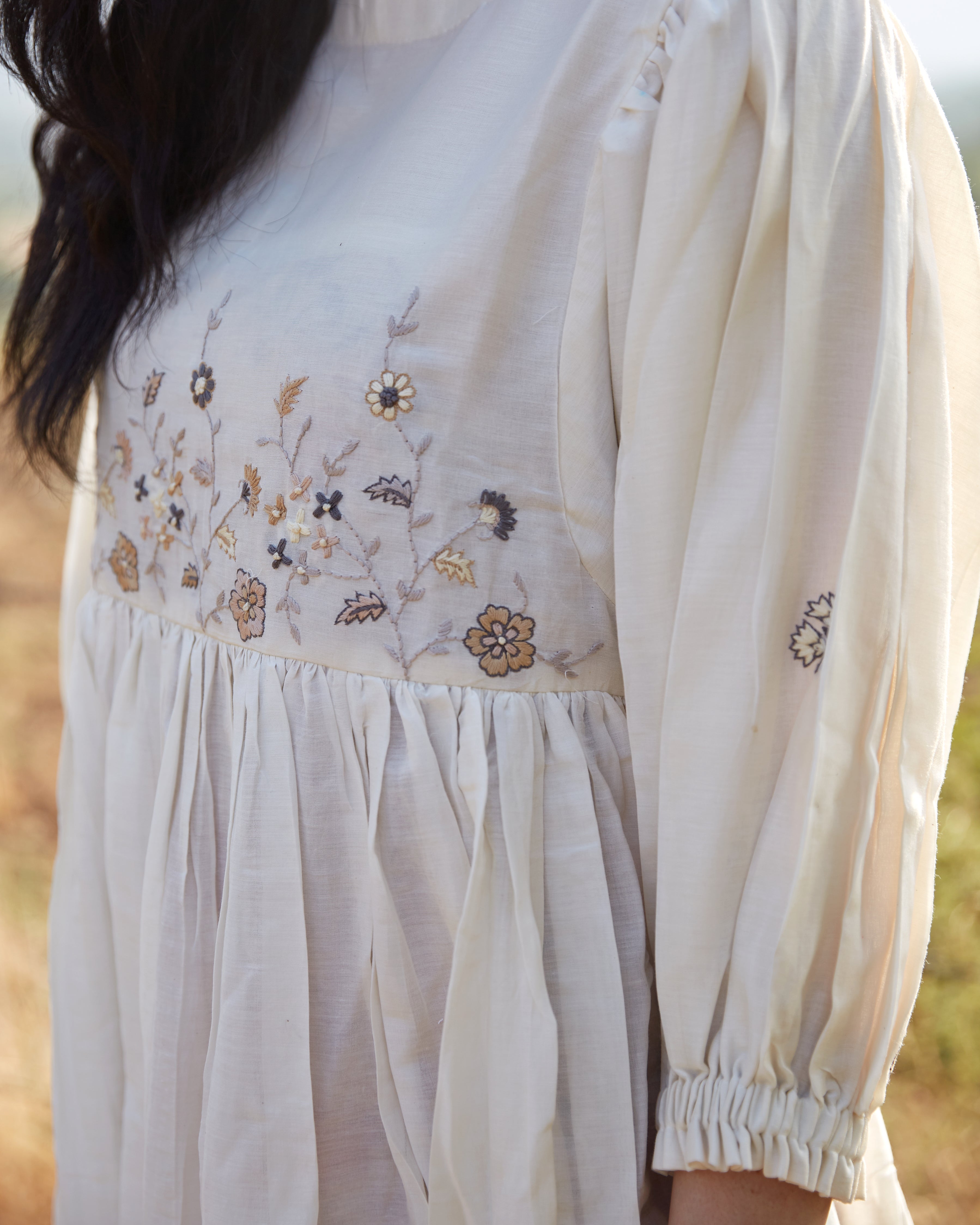 IVORY COTTON SILK ROUND NECK HAND EMBROIDERED...