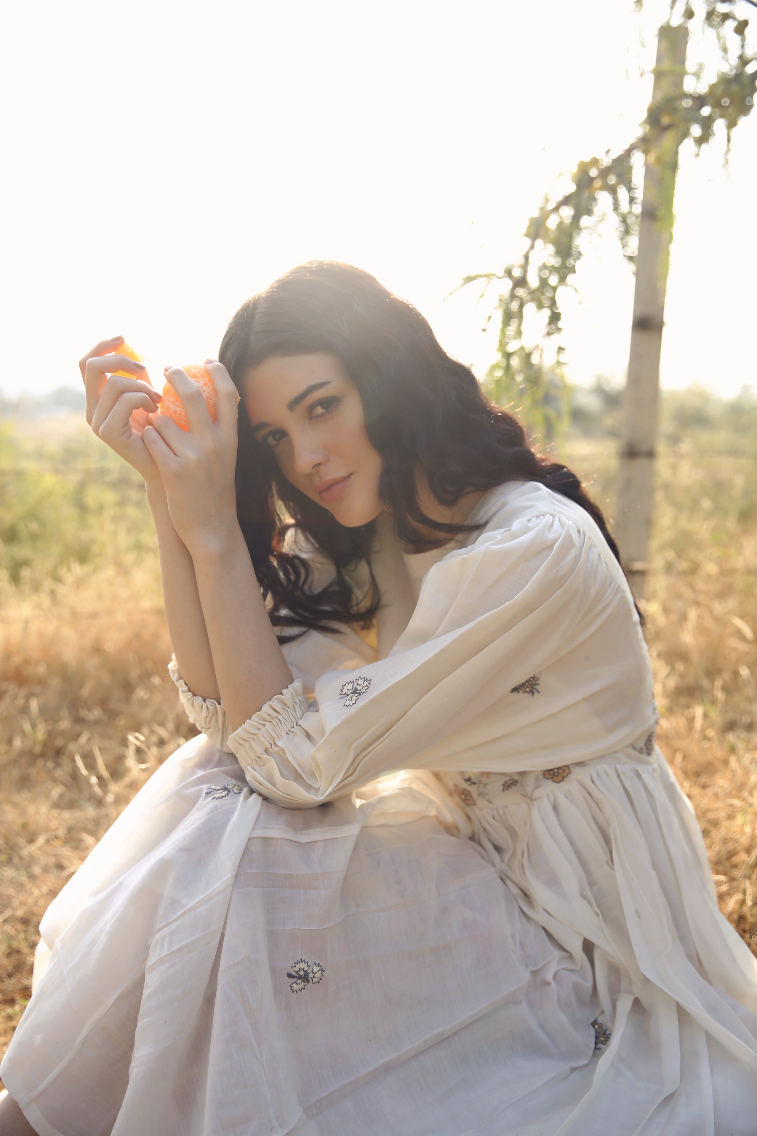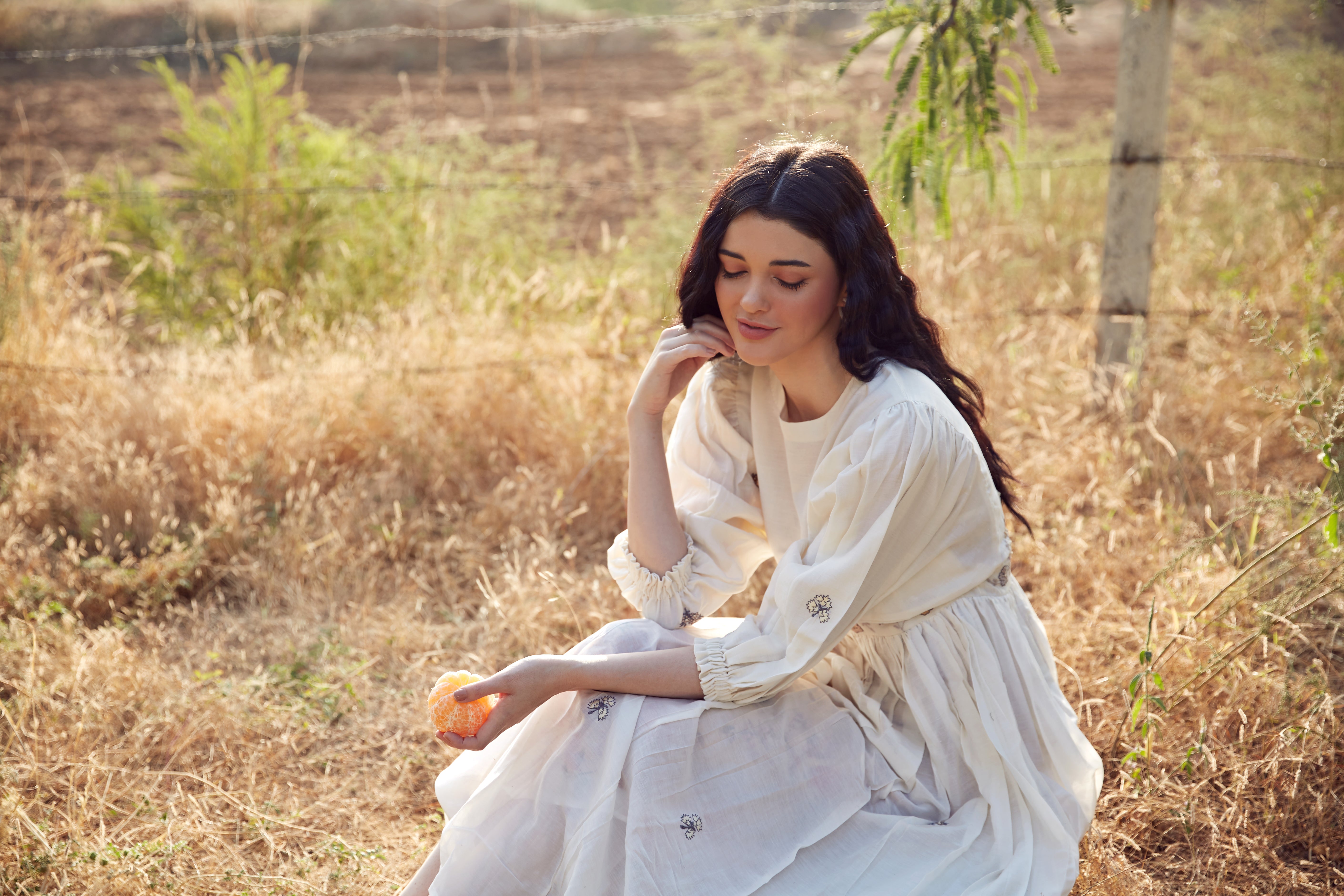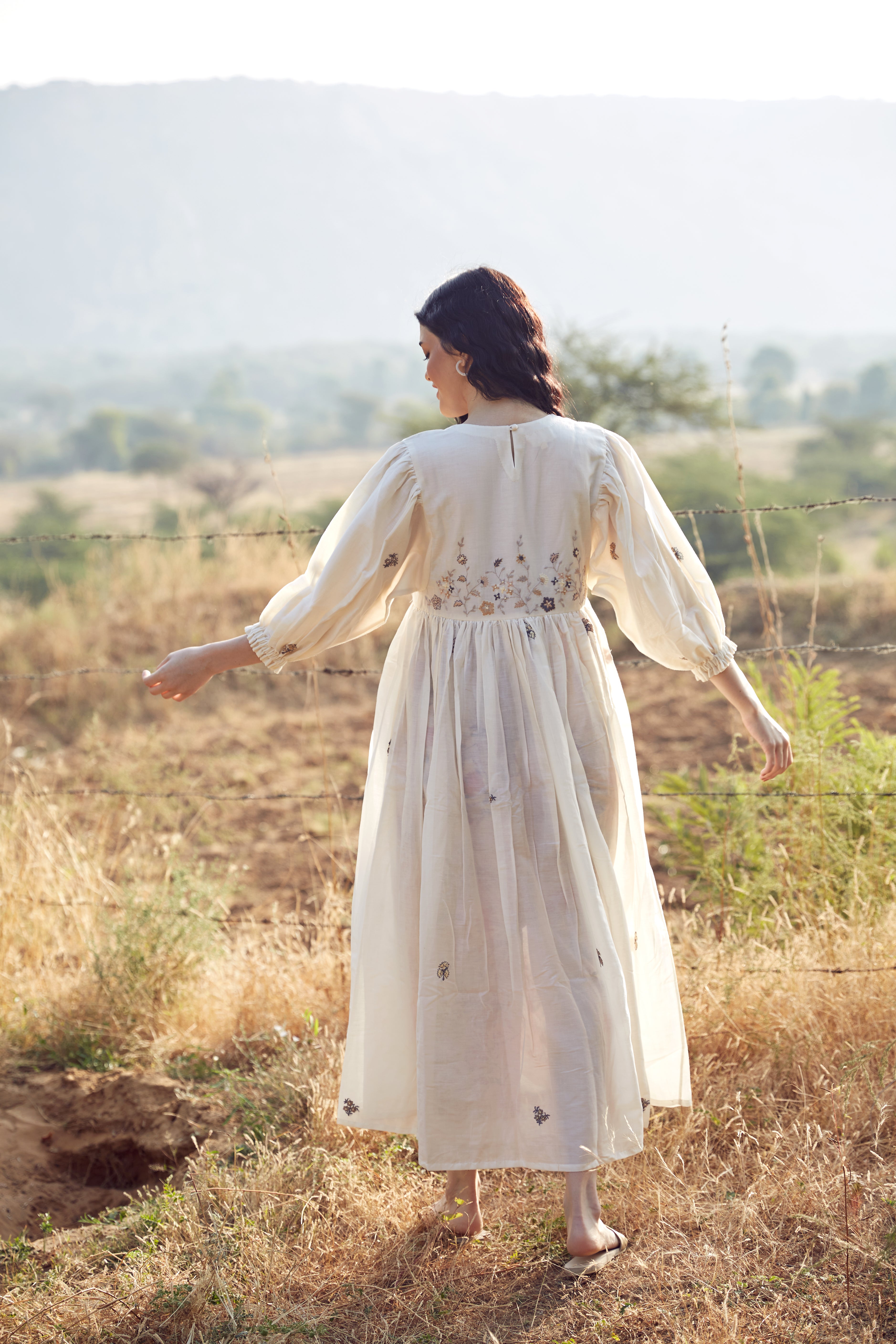 IVORY COTTON SILK ROUND NECK HAND EMBROIDERED...