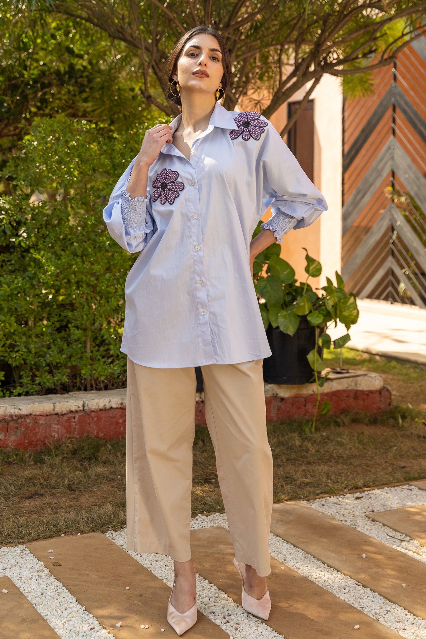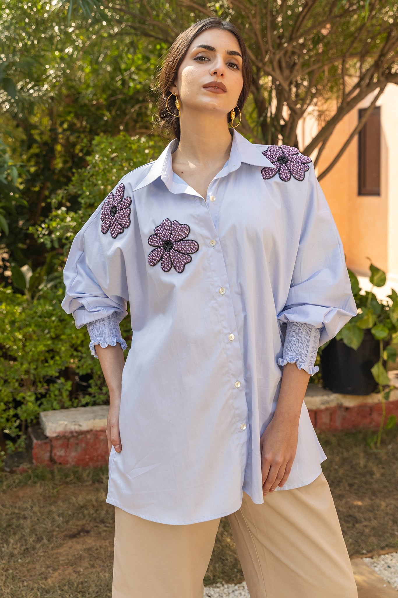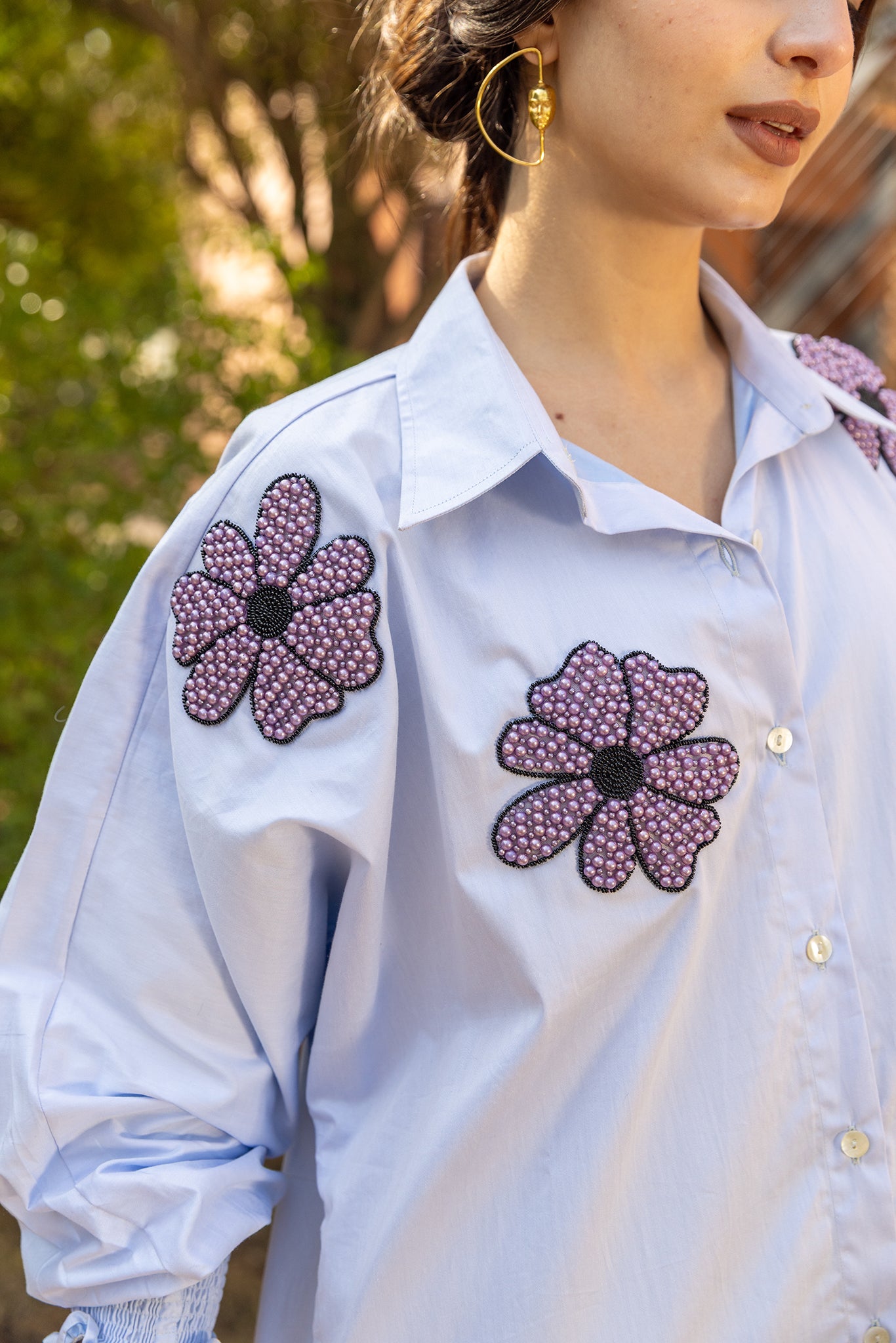 BLUE SHIRT WITH PURPLE PEARL FLOWER EMBROIDERY