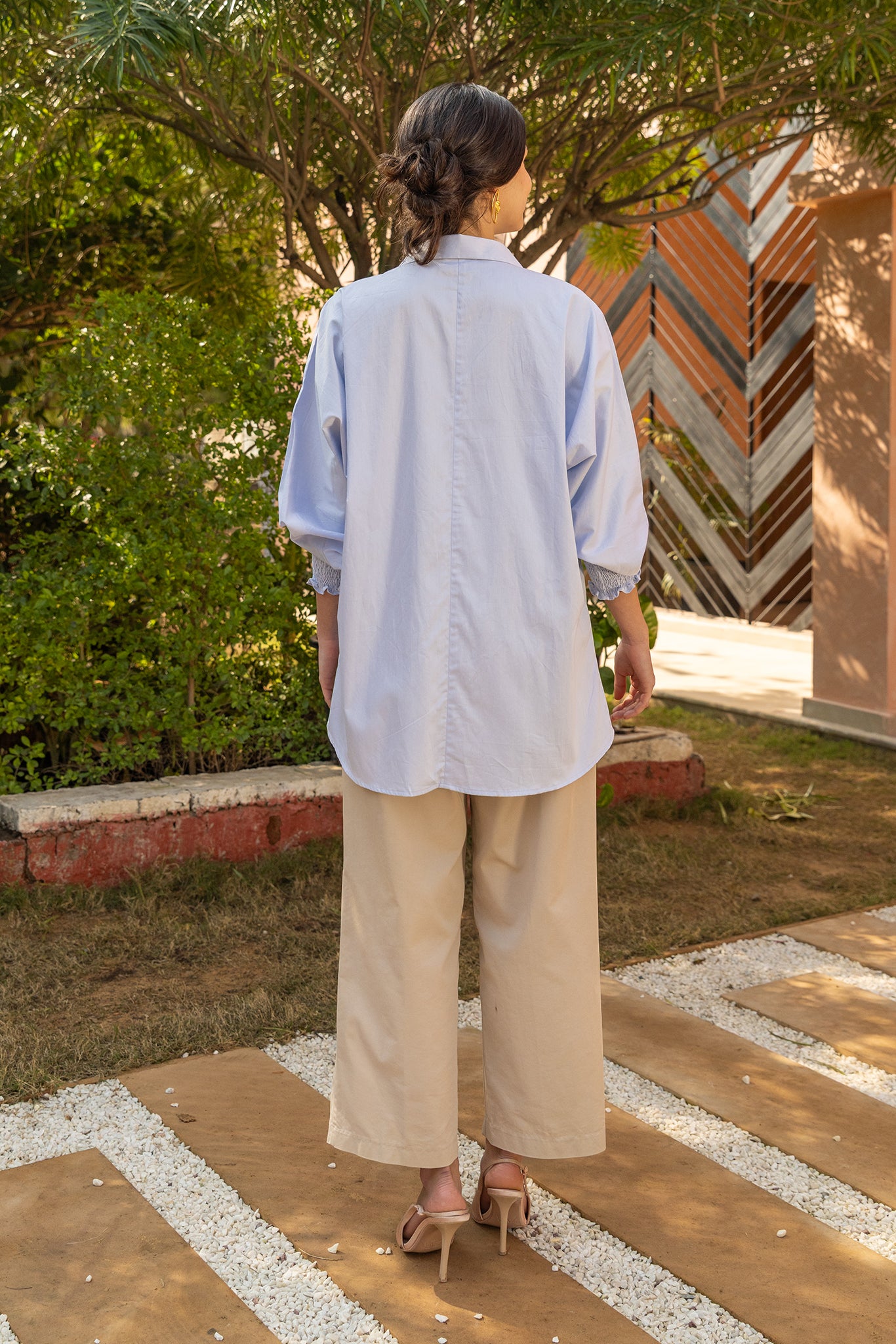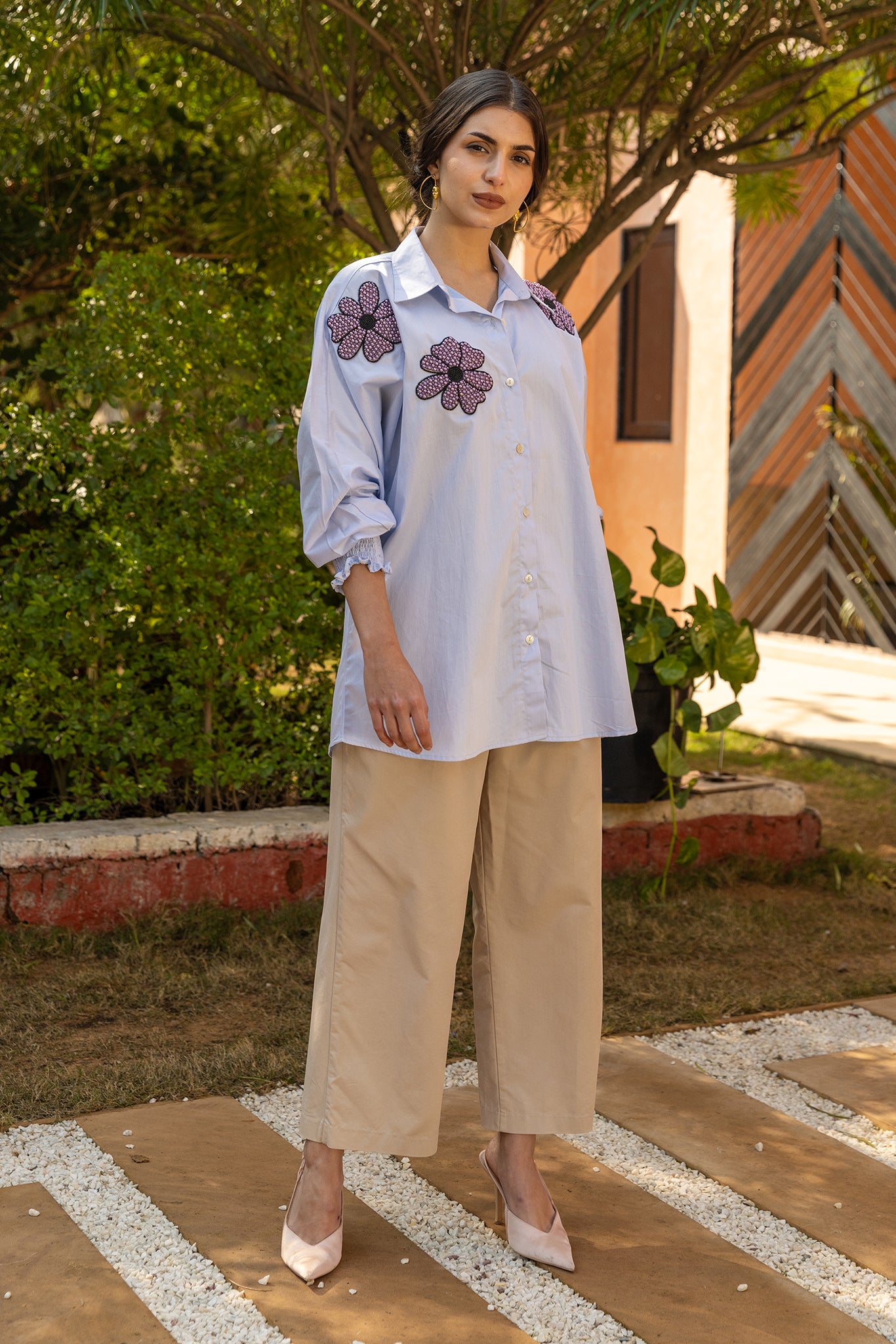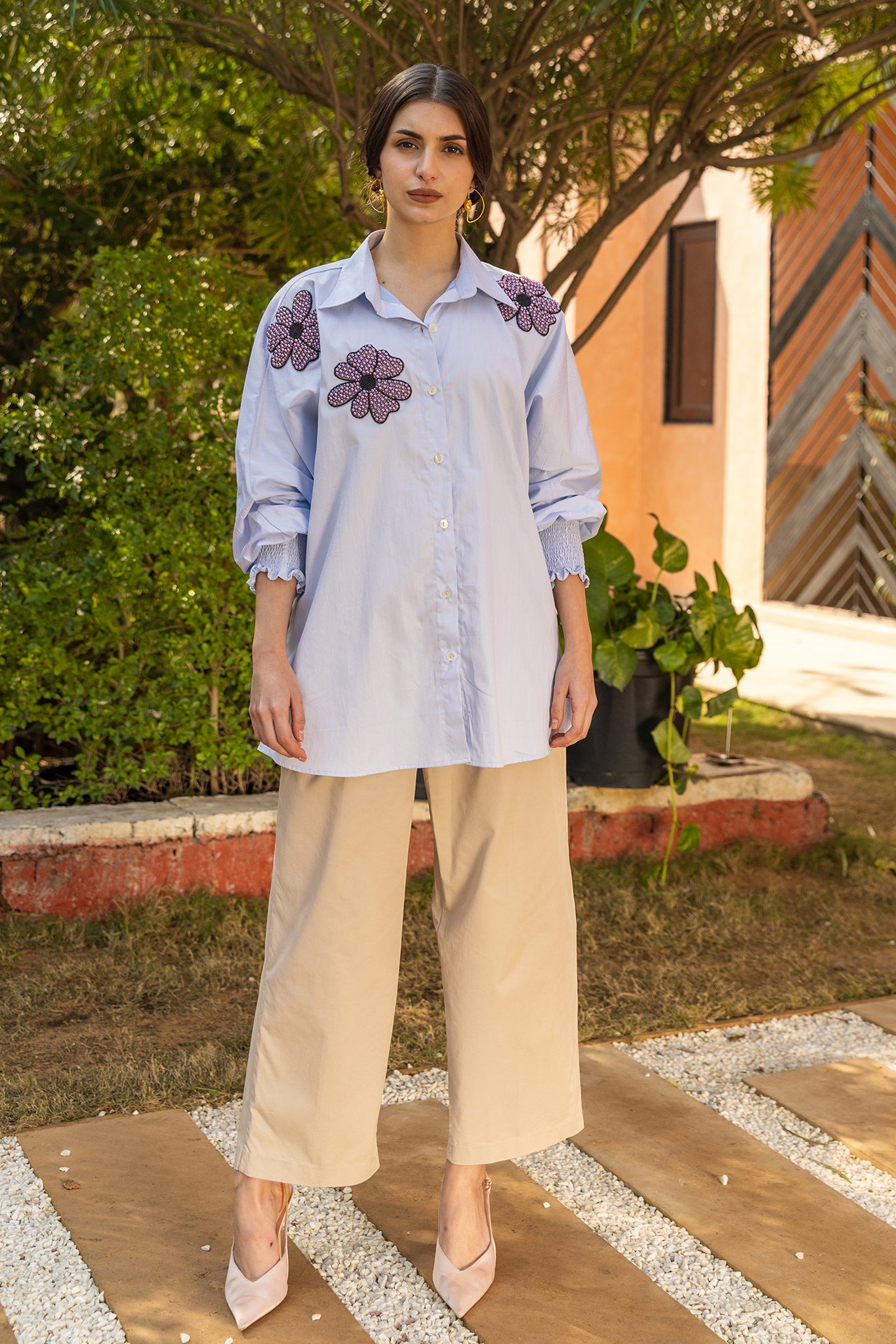 BLUE SHIRT WITH PURPLE PEARL FLOWER EMBROIDERY