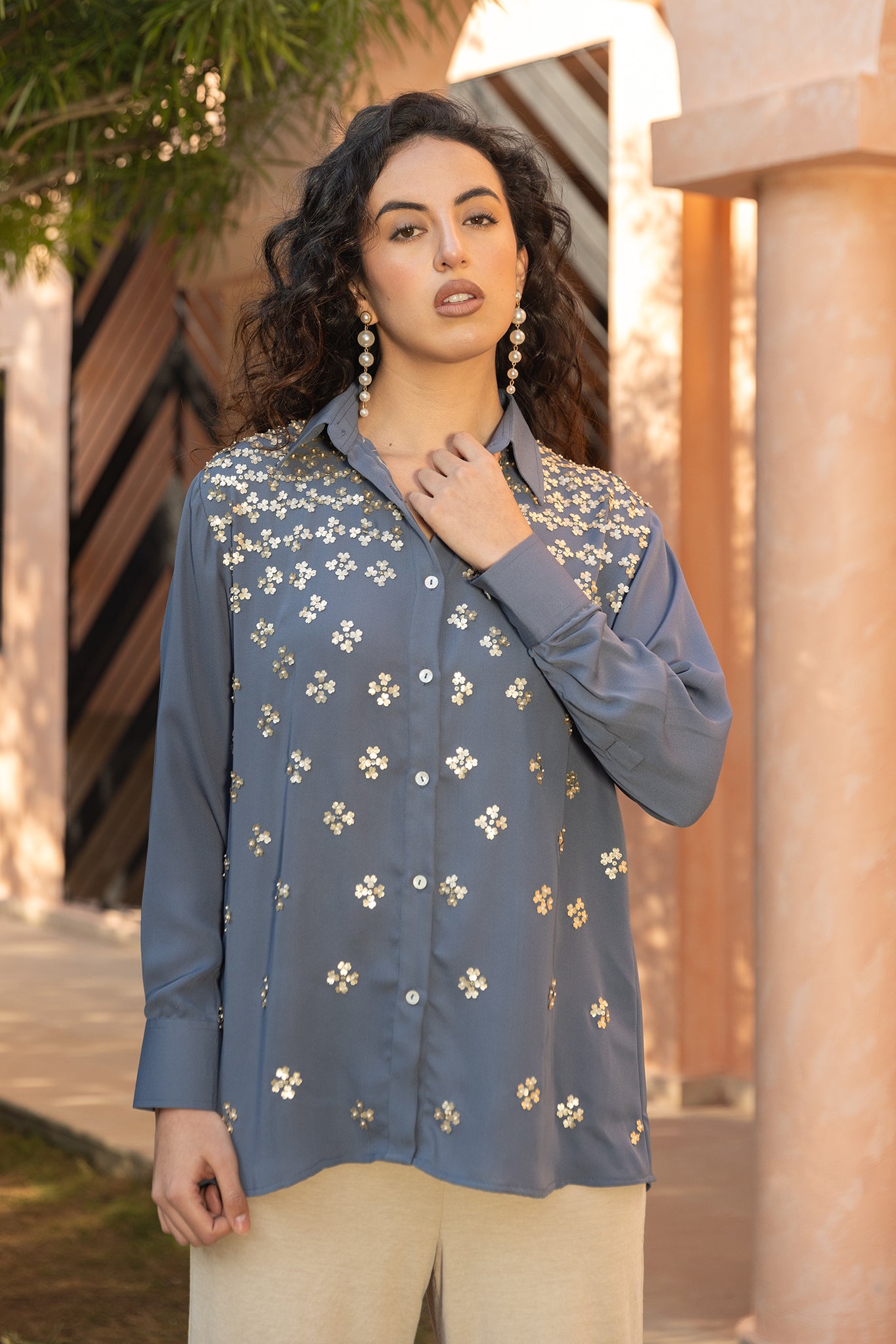 BLUE SHIRT WITH GOLDEN SCATTERED EMBROIDERY