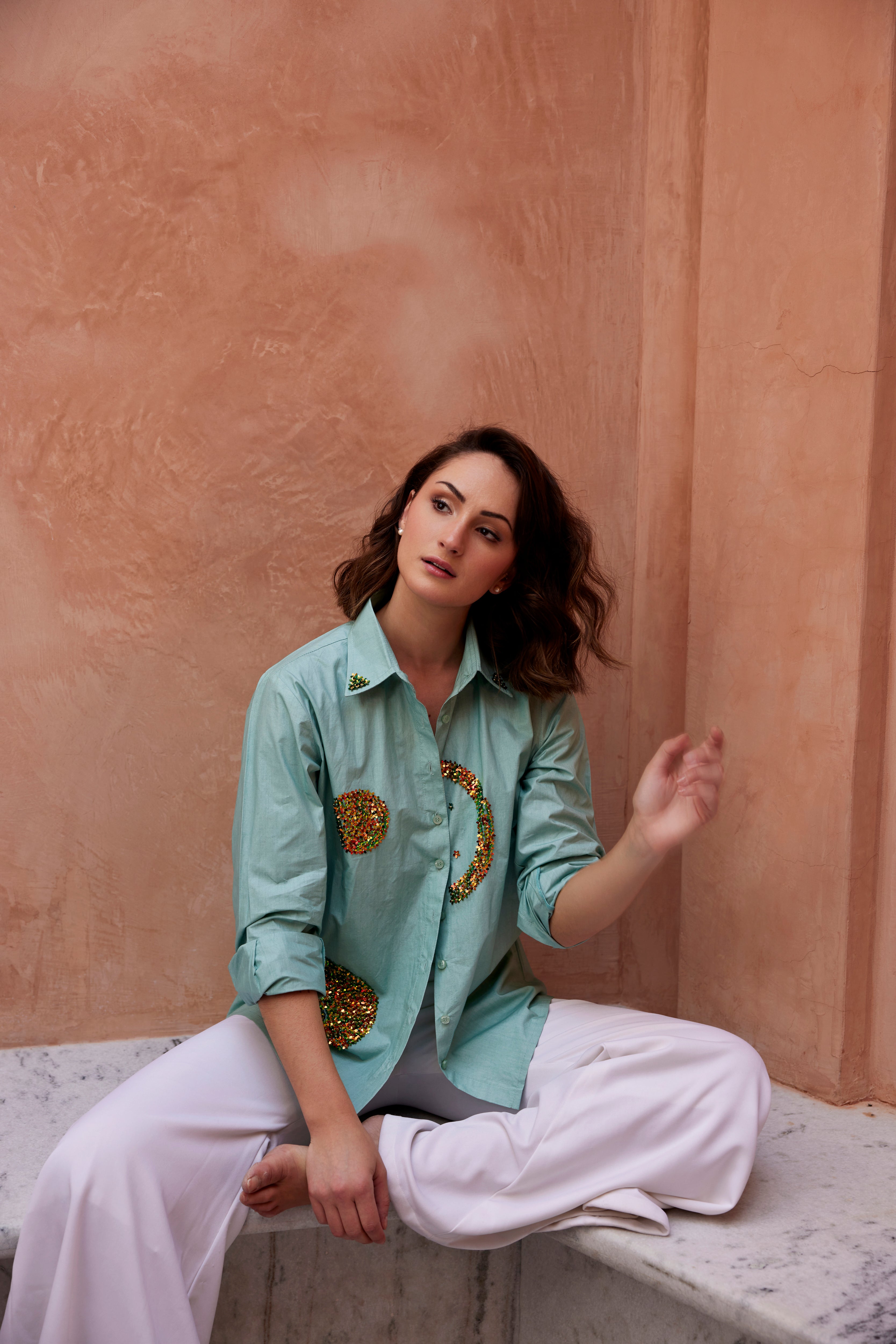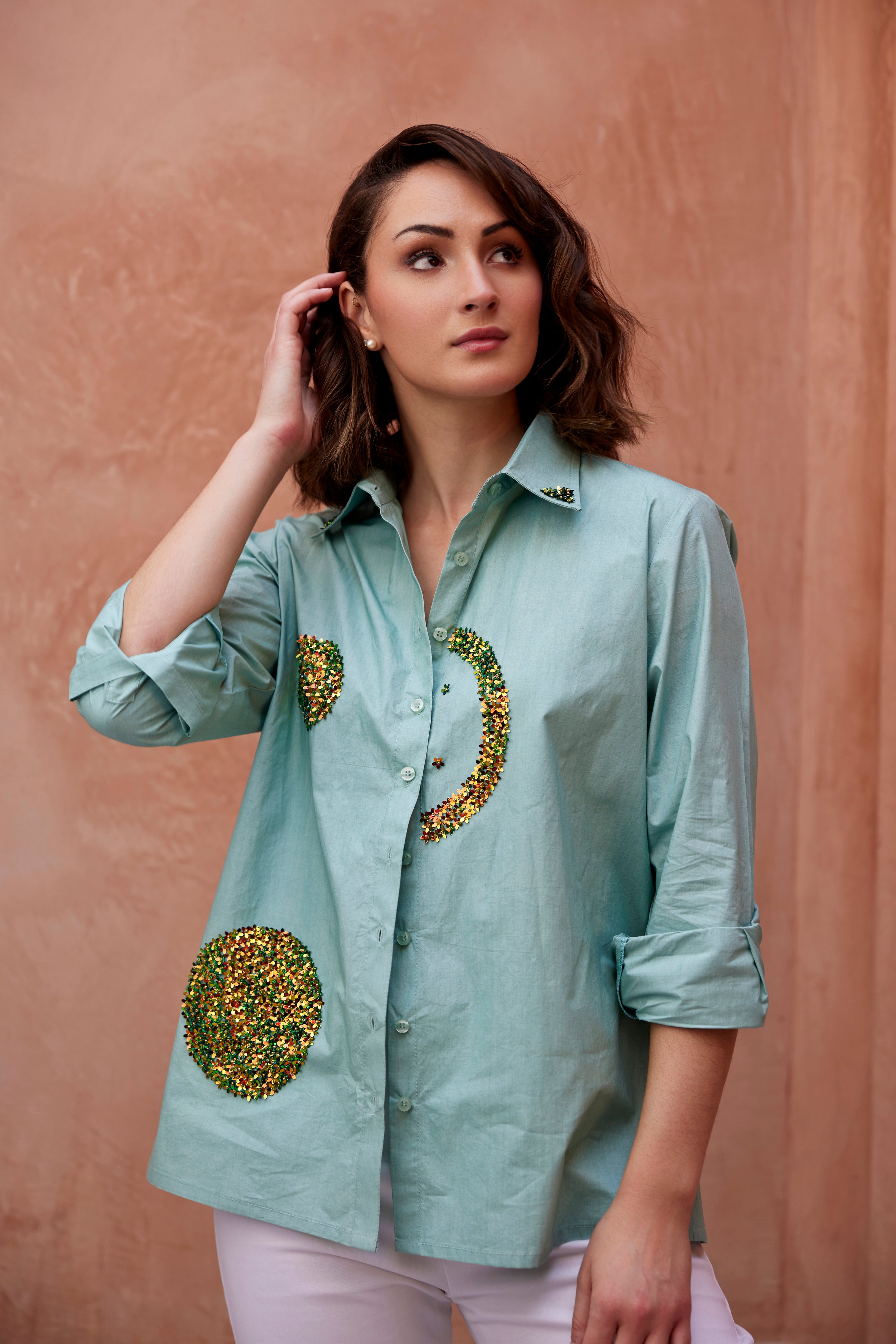 MINT GREEN SHIRT WITH CHROME SEQUIN ABSTRACT