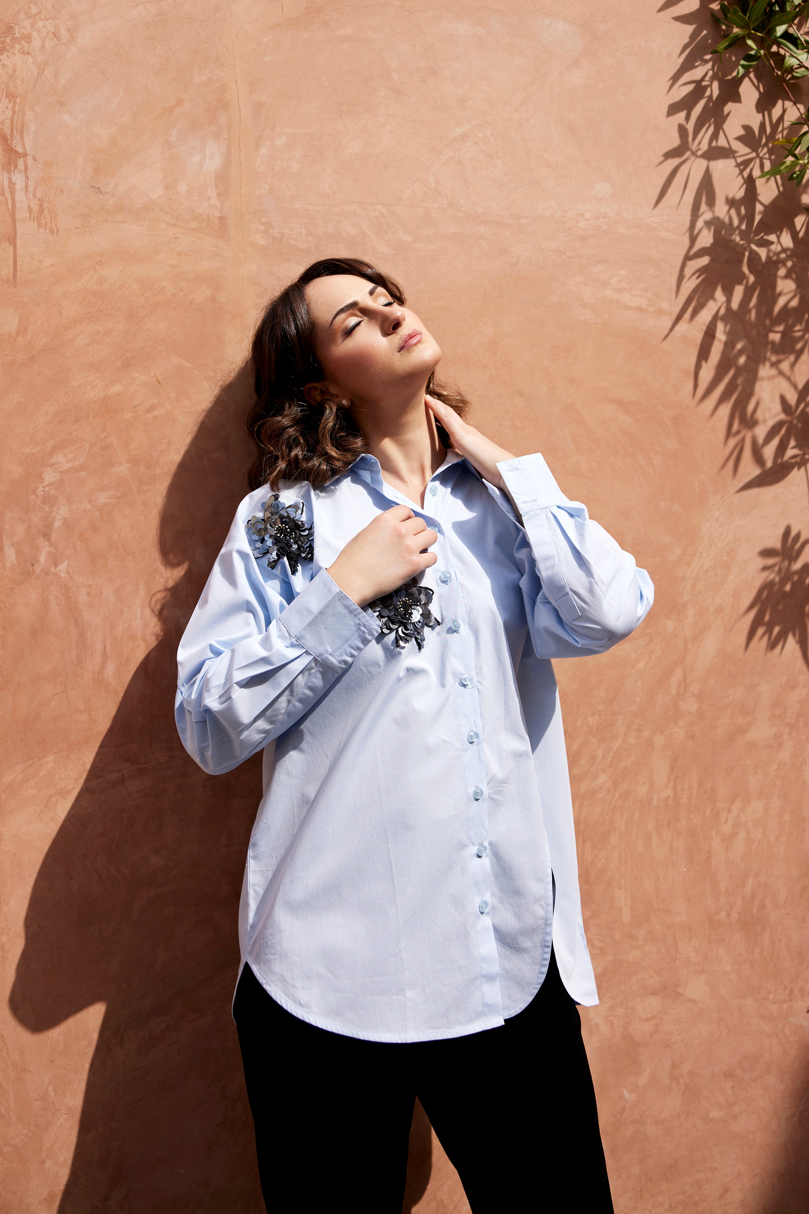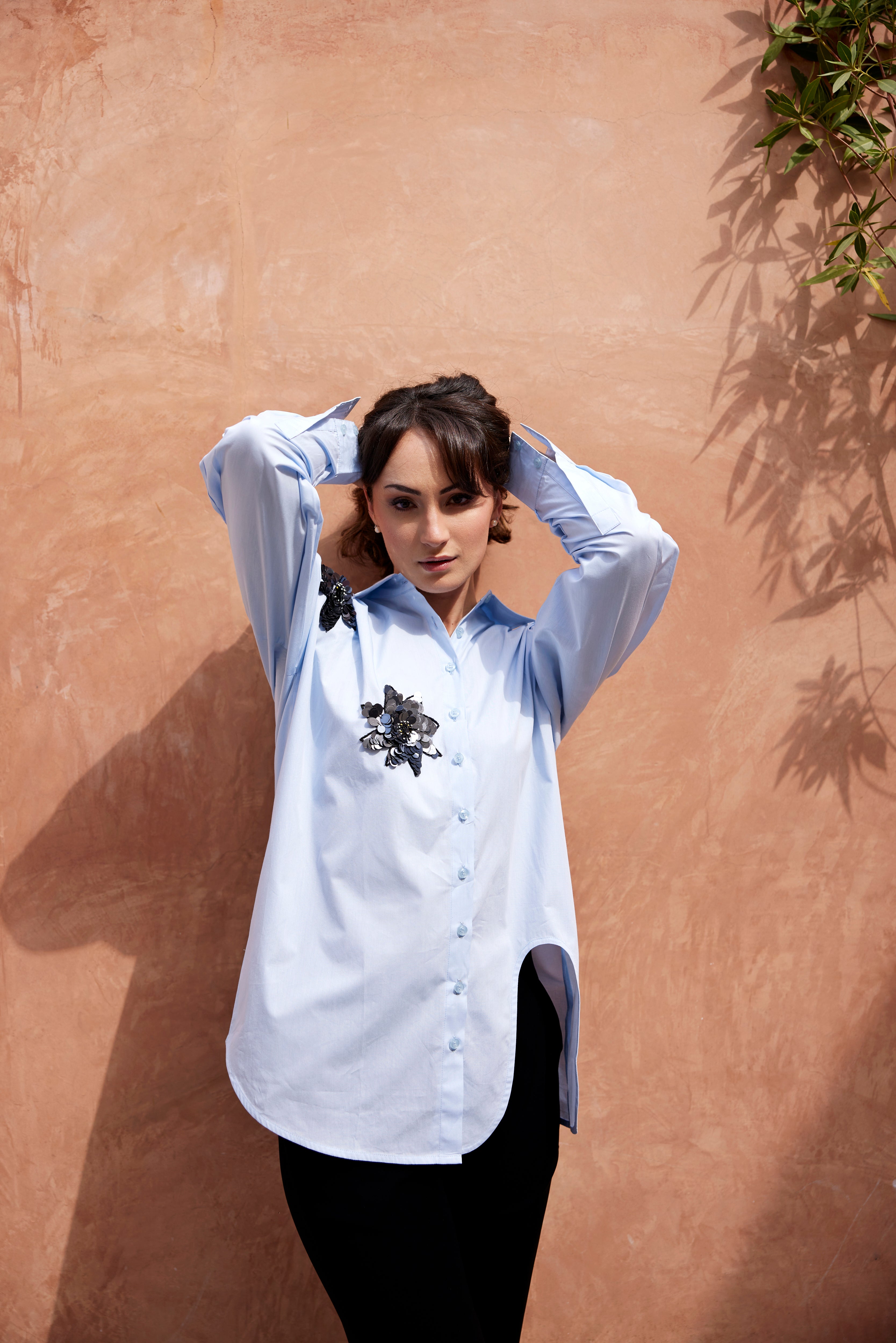 SKYLIGHT BLUE SHIRT WITH BLACK FLOWER PATCHES...