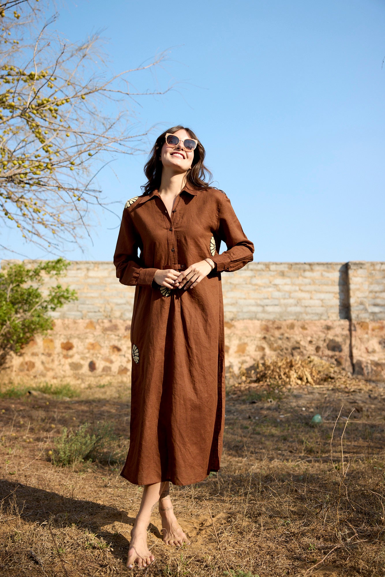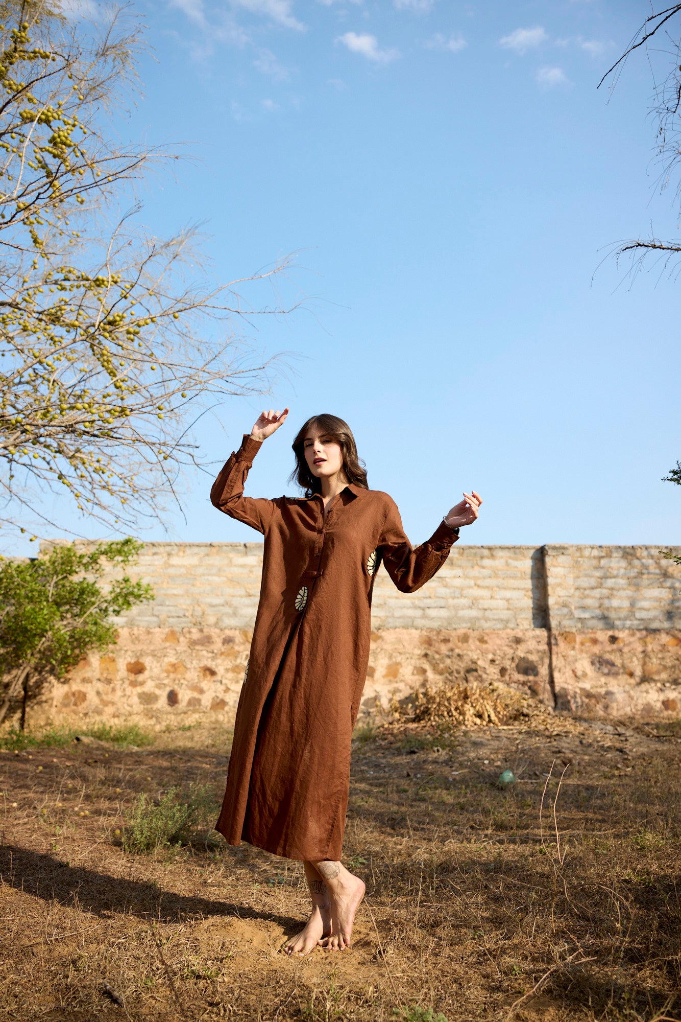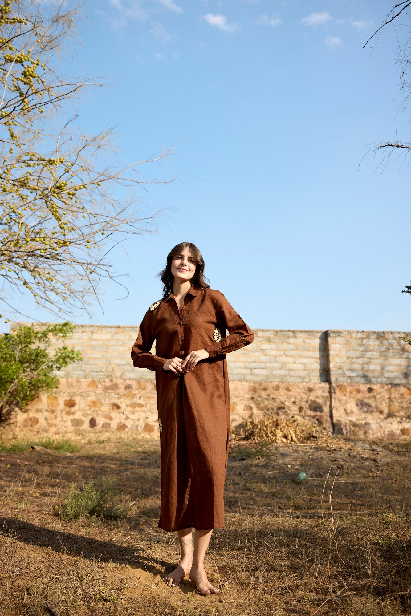 BROWN LONG LINEN DRESS WITH IVORY SEQUIN PATCH