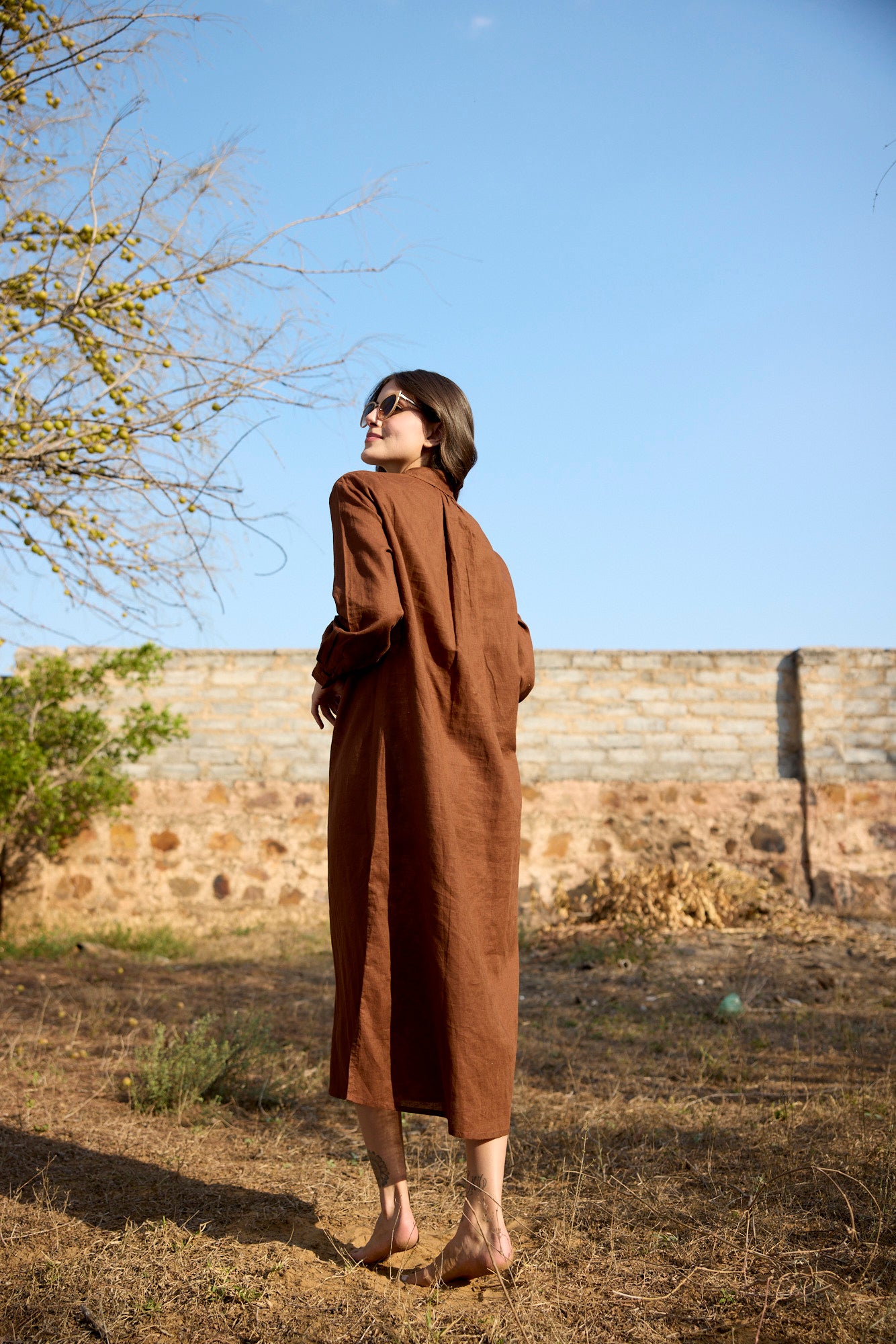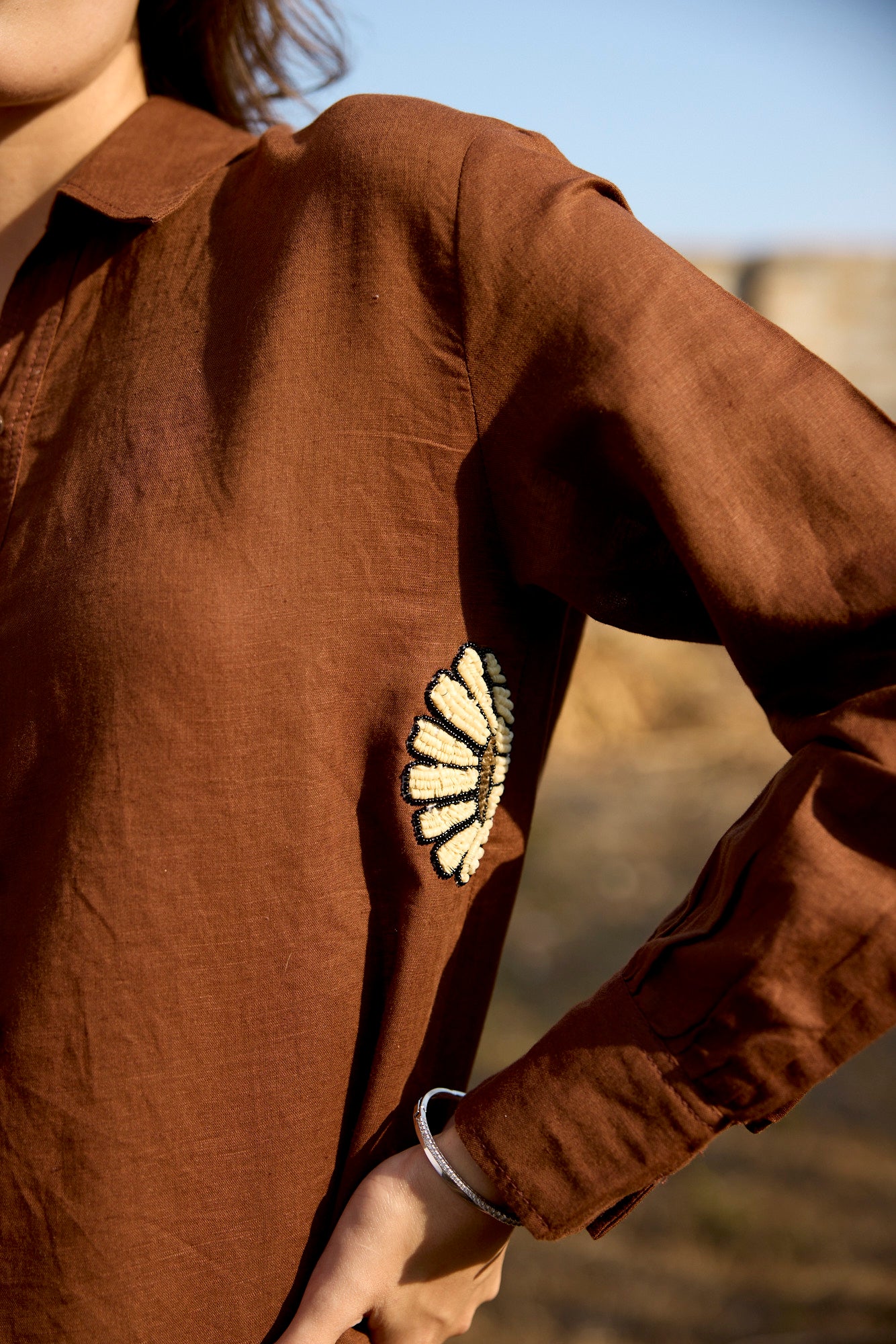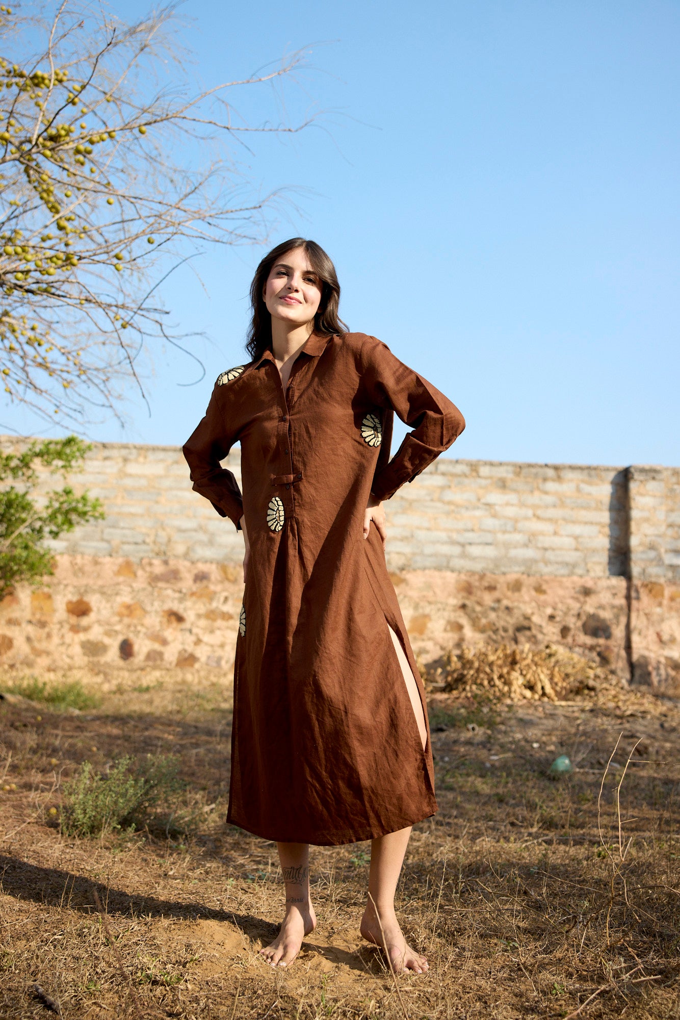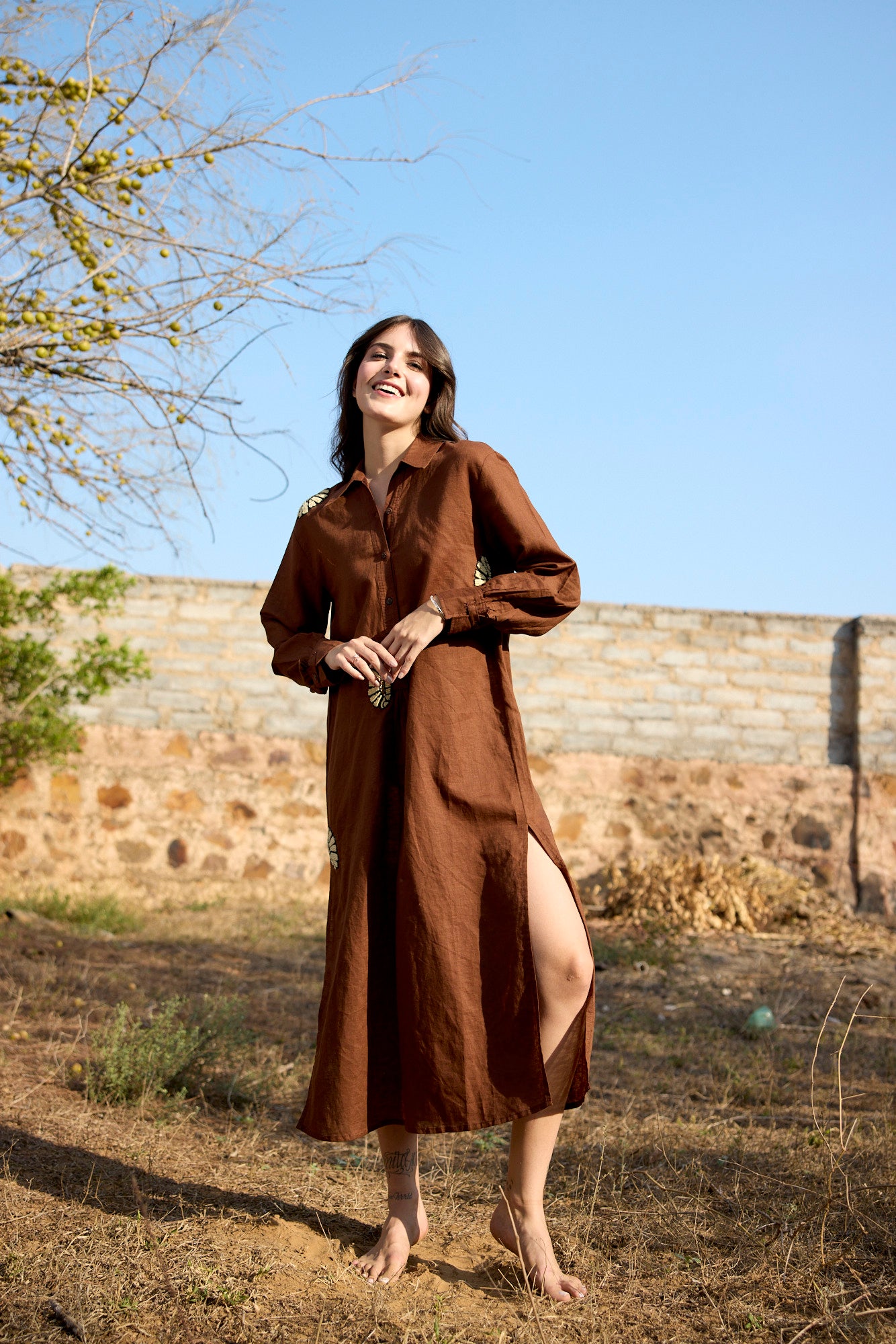 BROWN LONG LINEN DRESS WITH IVORY SEQUIN PATCH