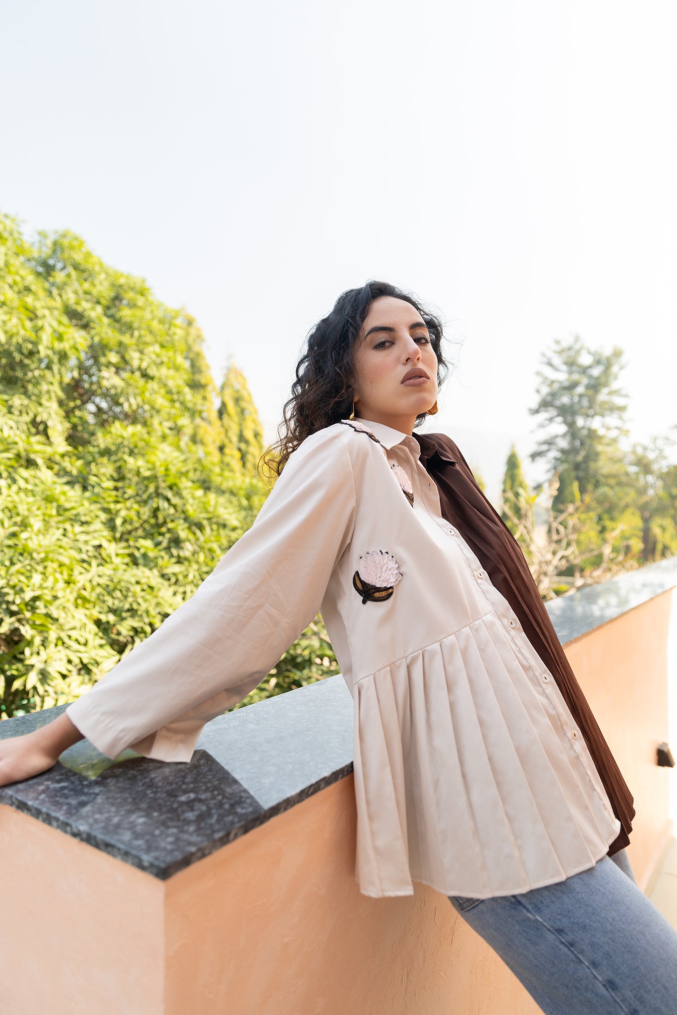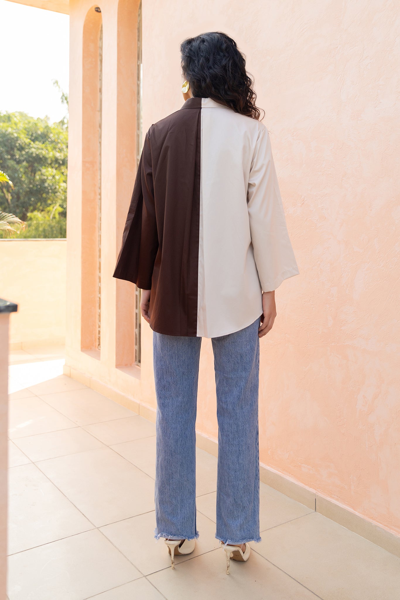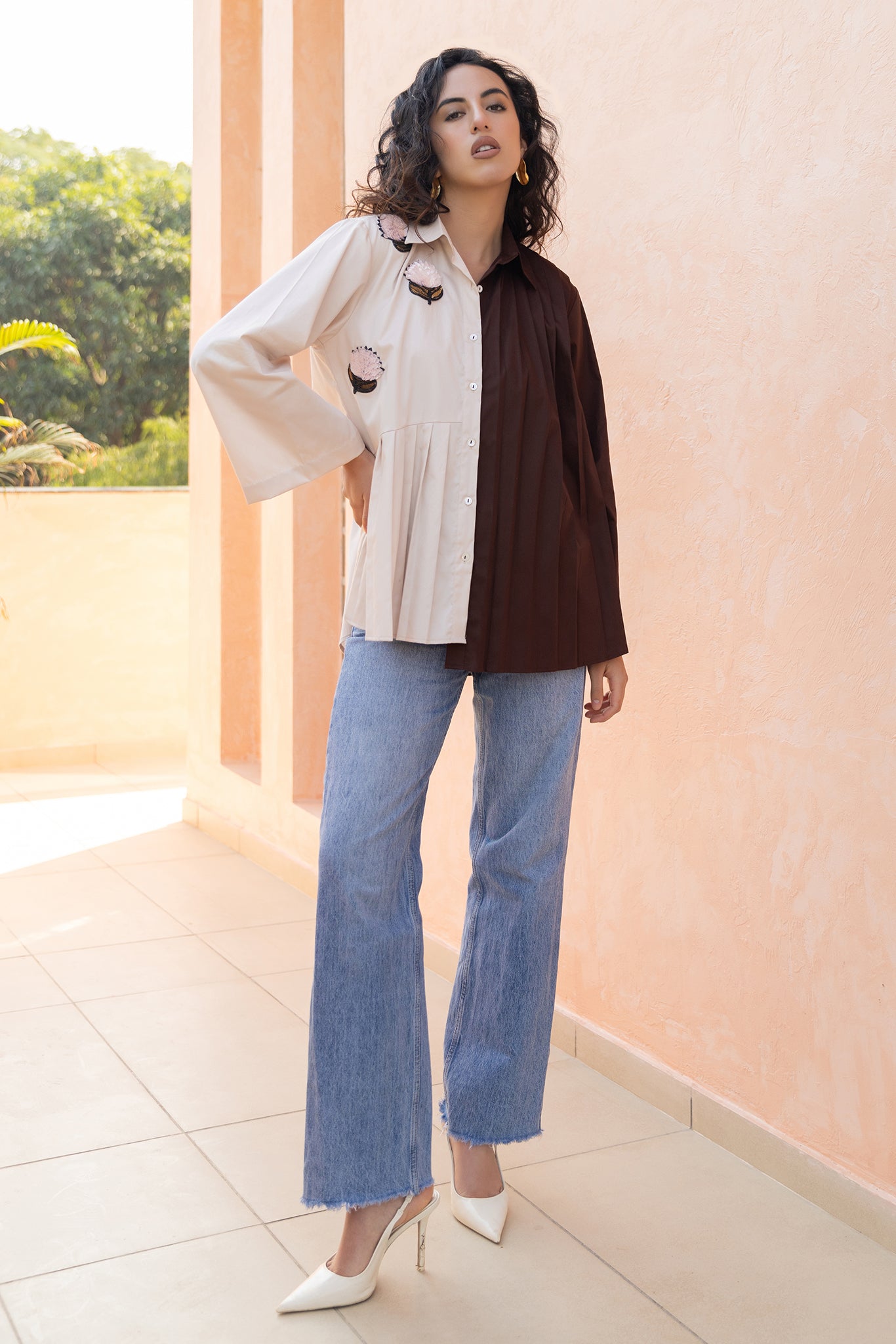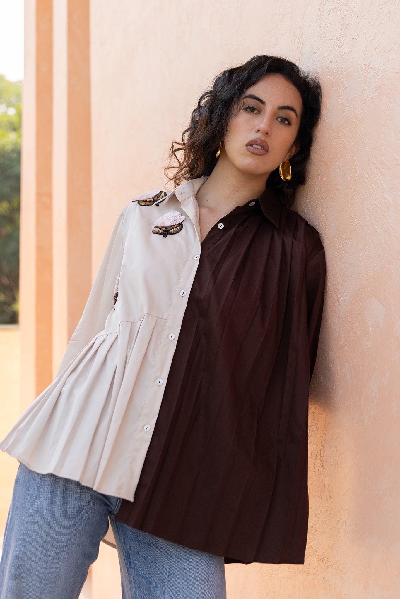 HALF N HALF PLEATED SHIRT WITH LOTUS...