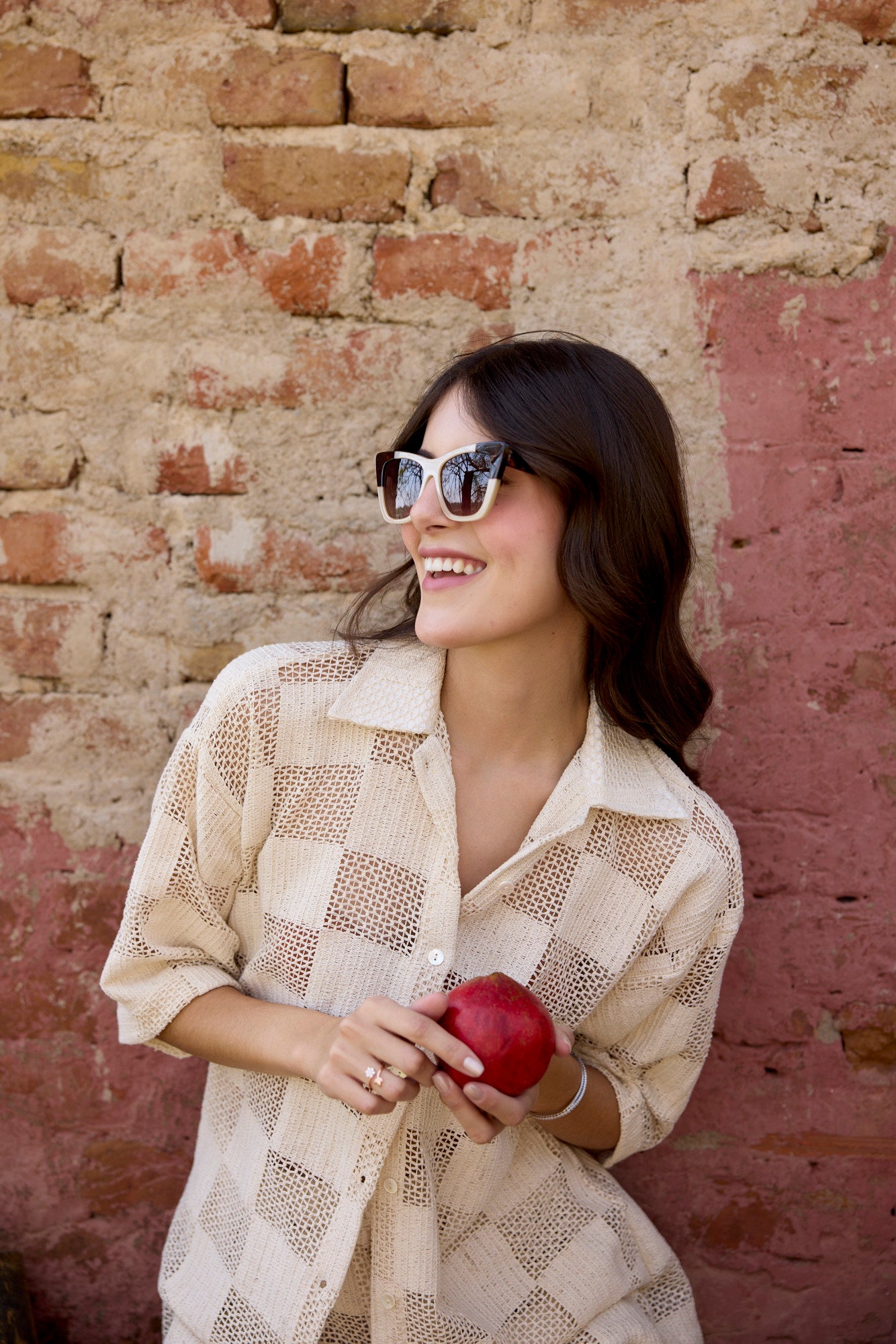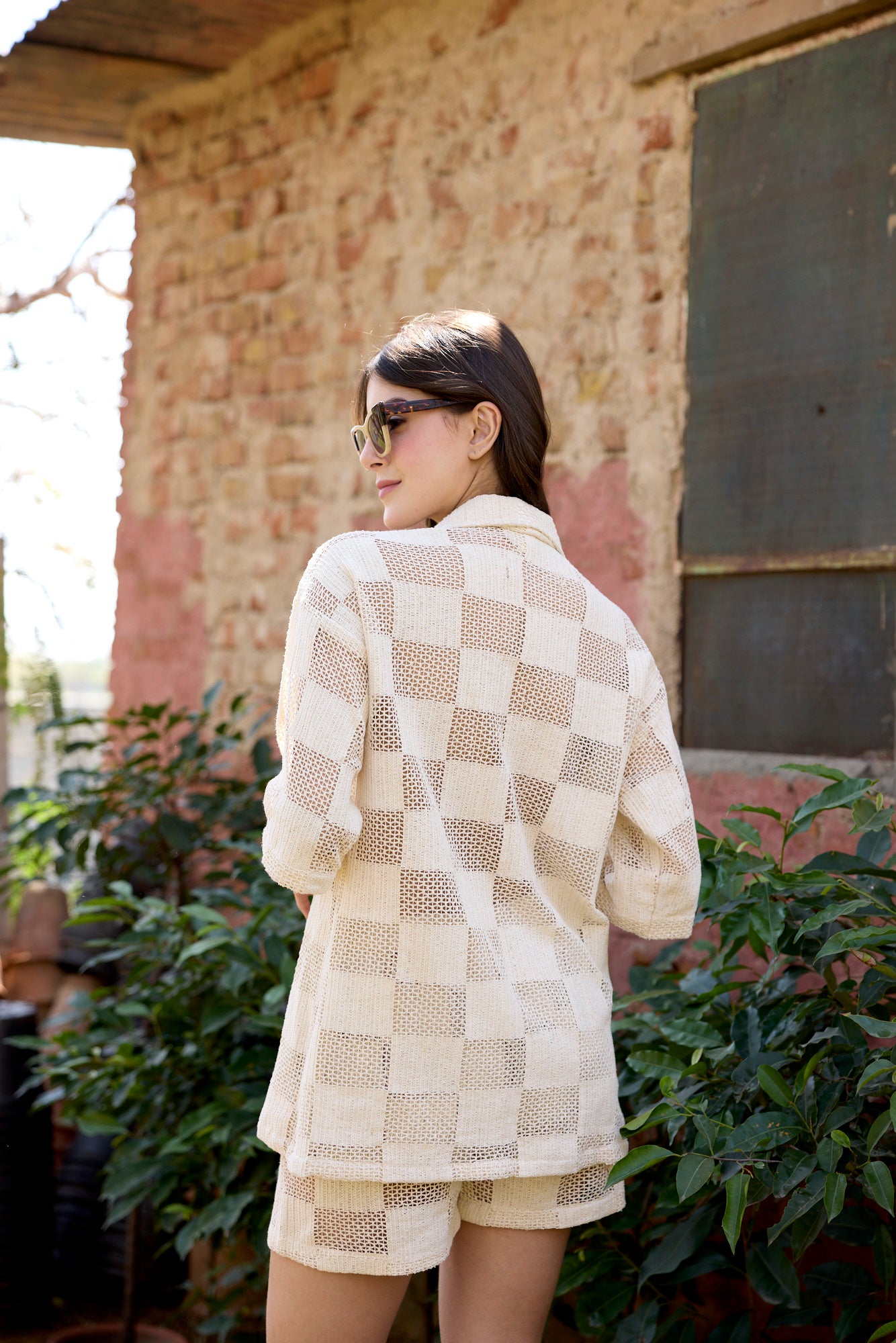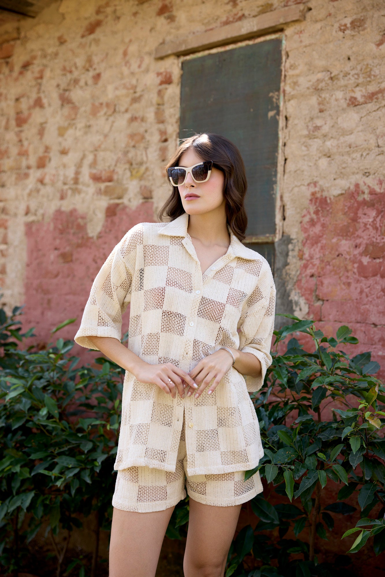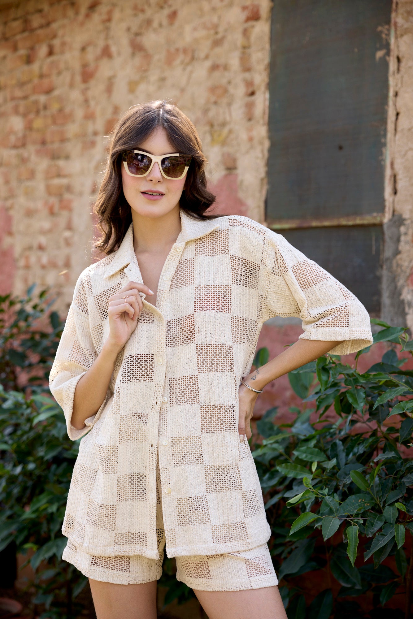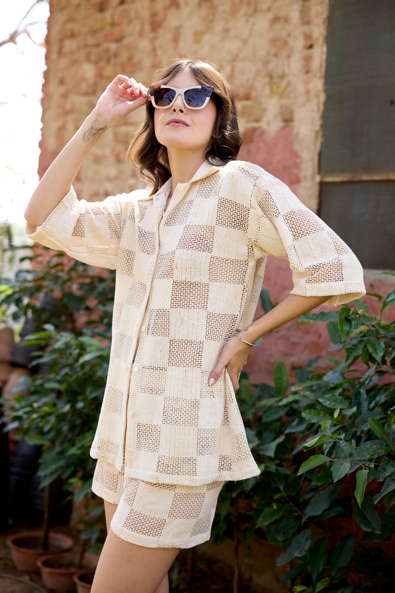 - Co-ord set features chequered shape crochet design shirt and shorts.