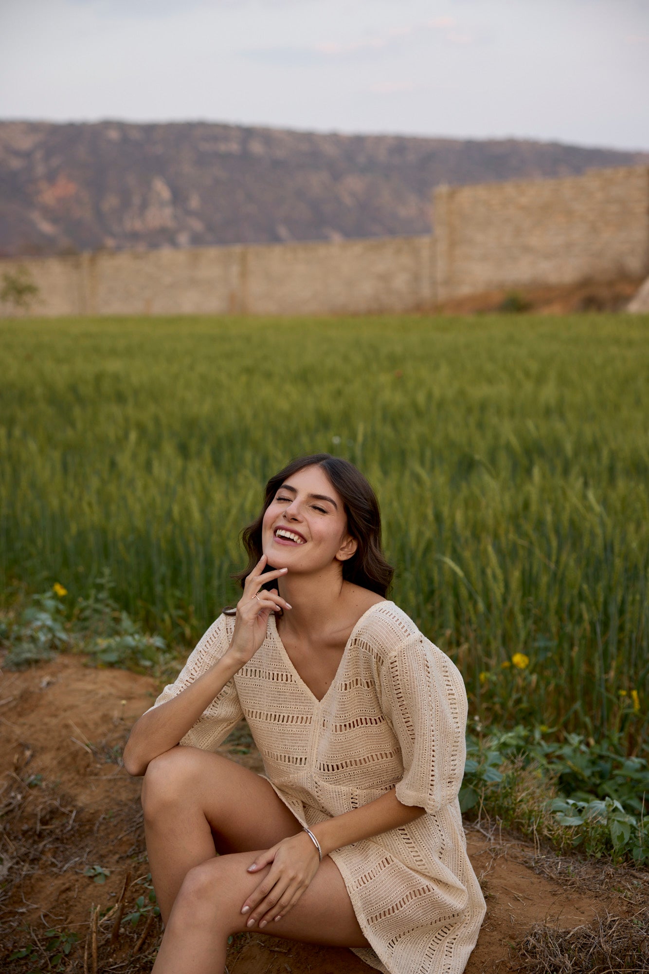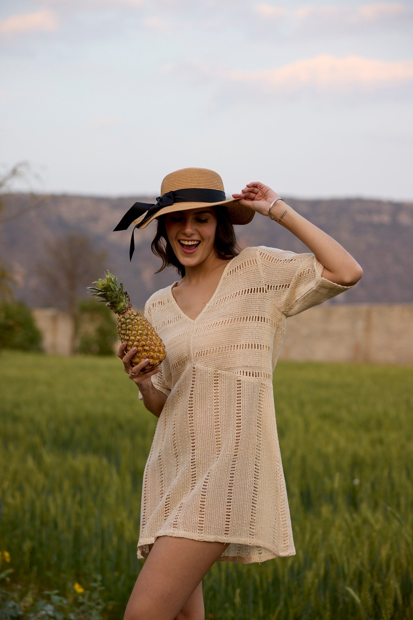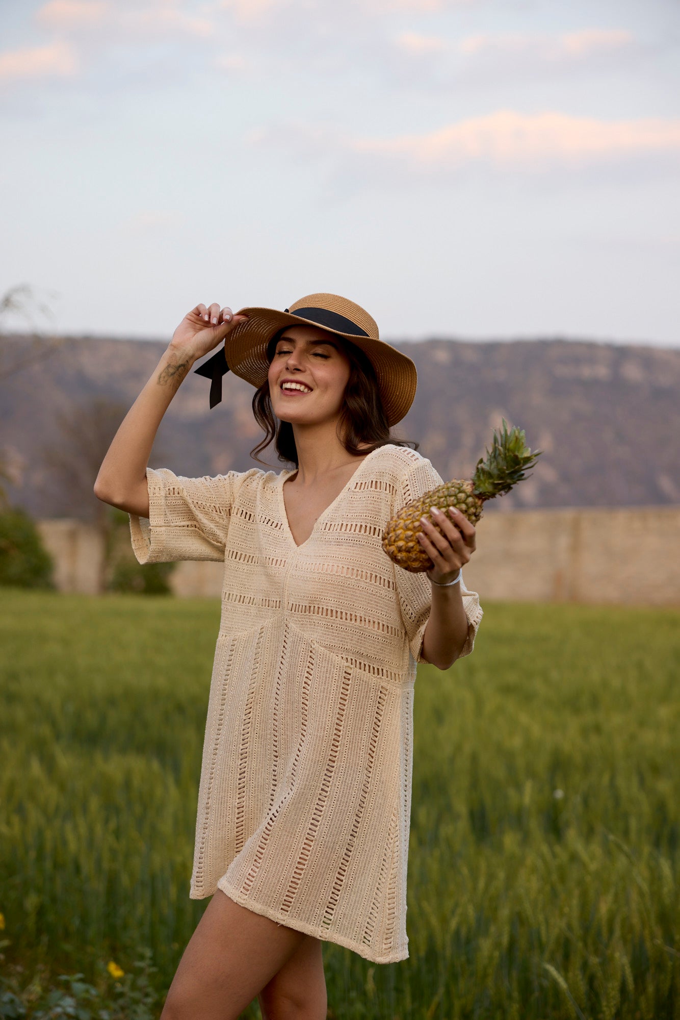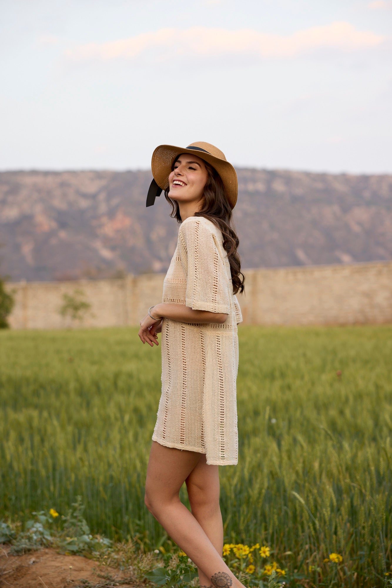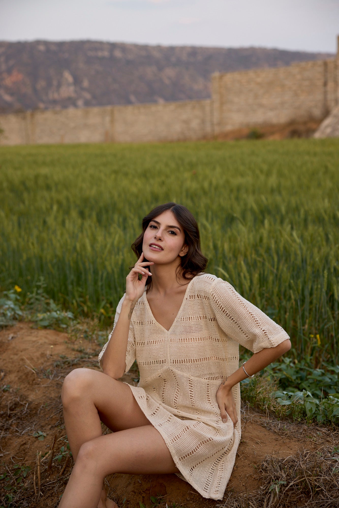 IVORY CROCHET SHORT DRESS WITH HALF SLEEVE