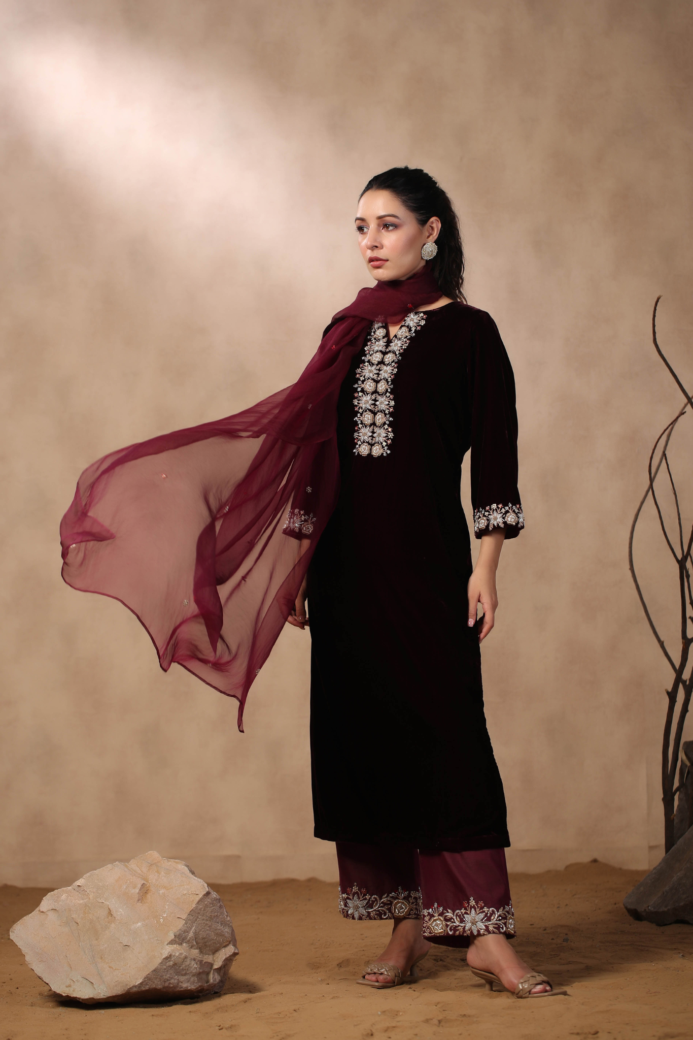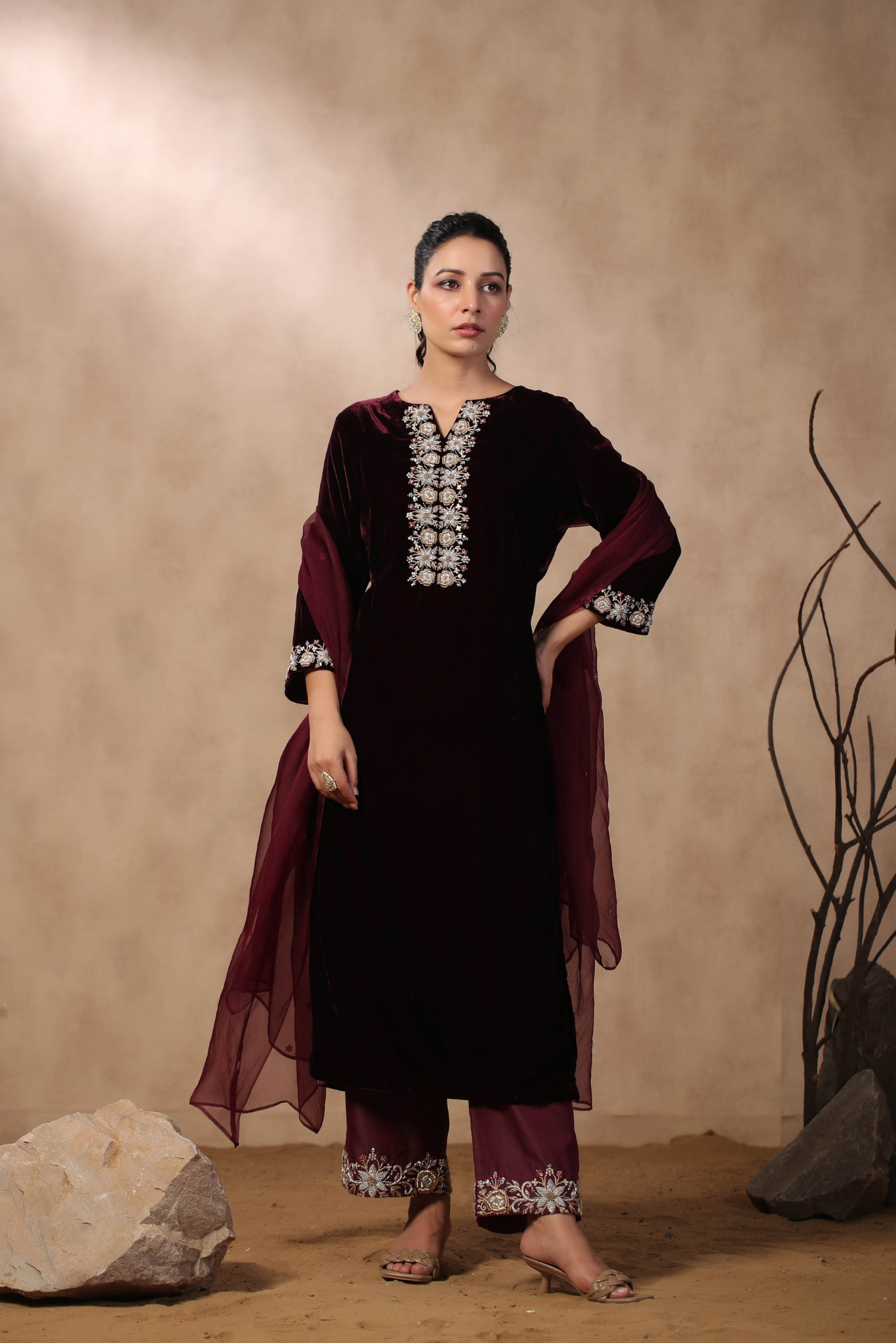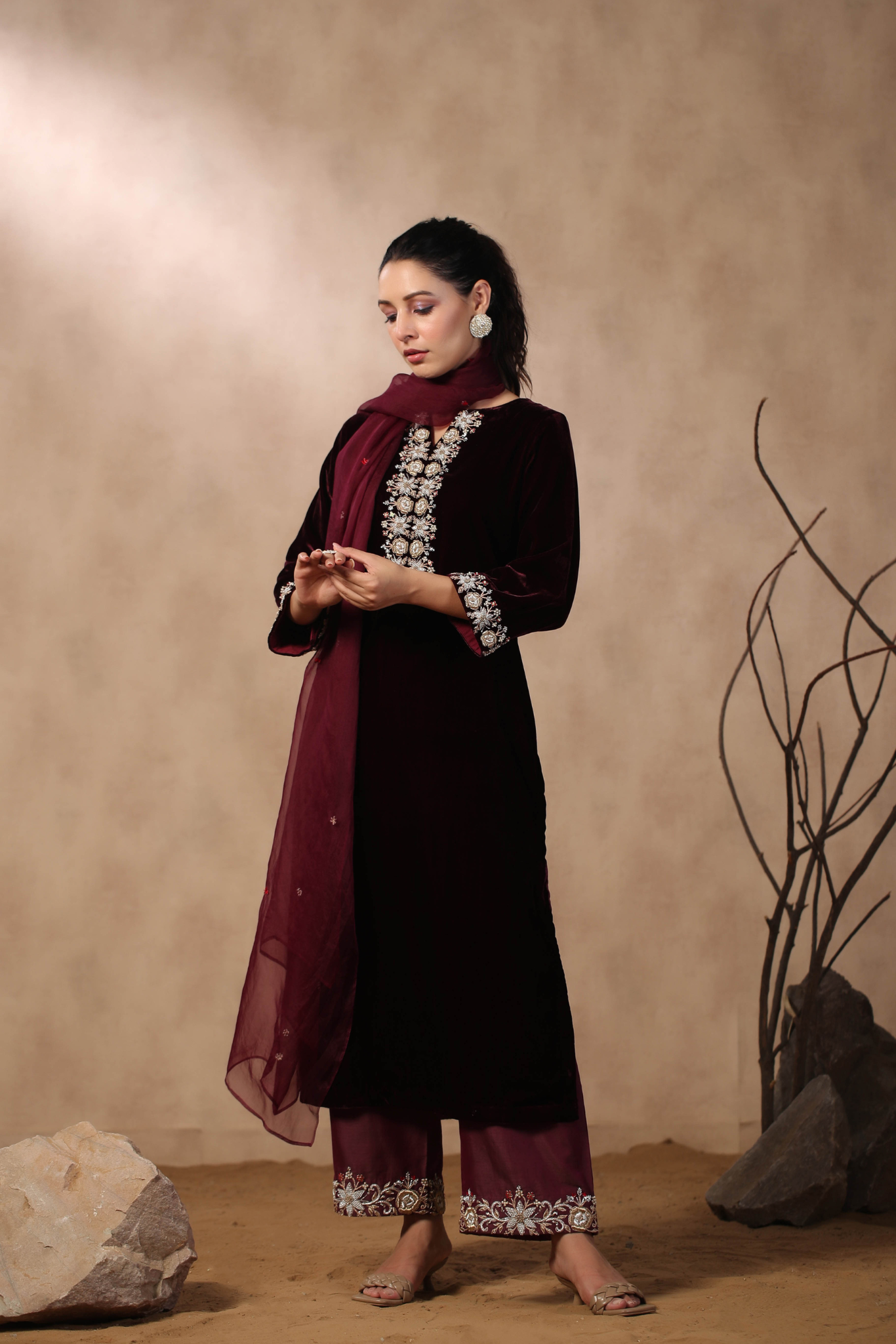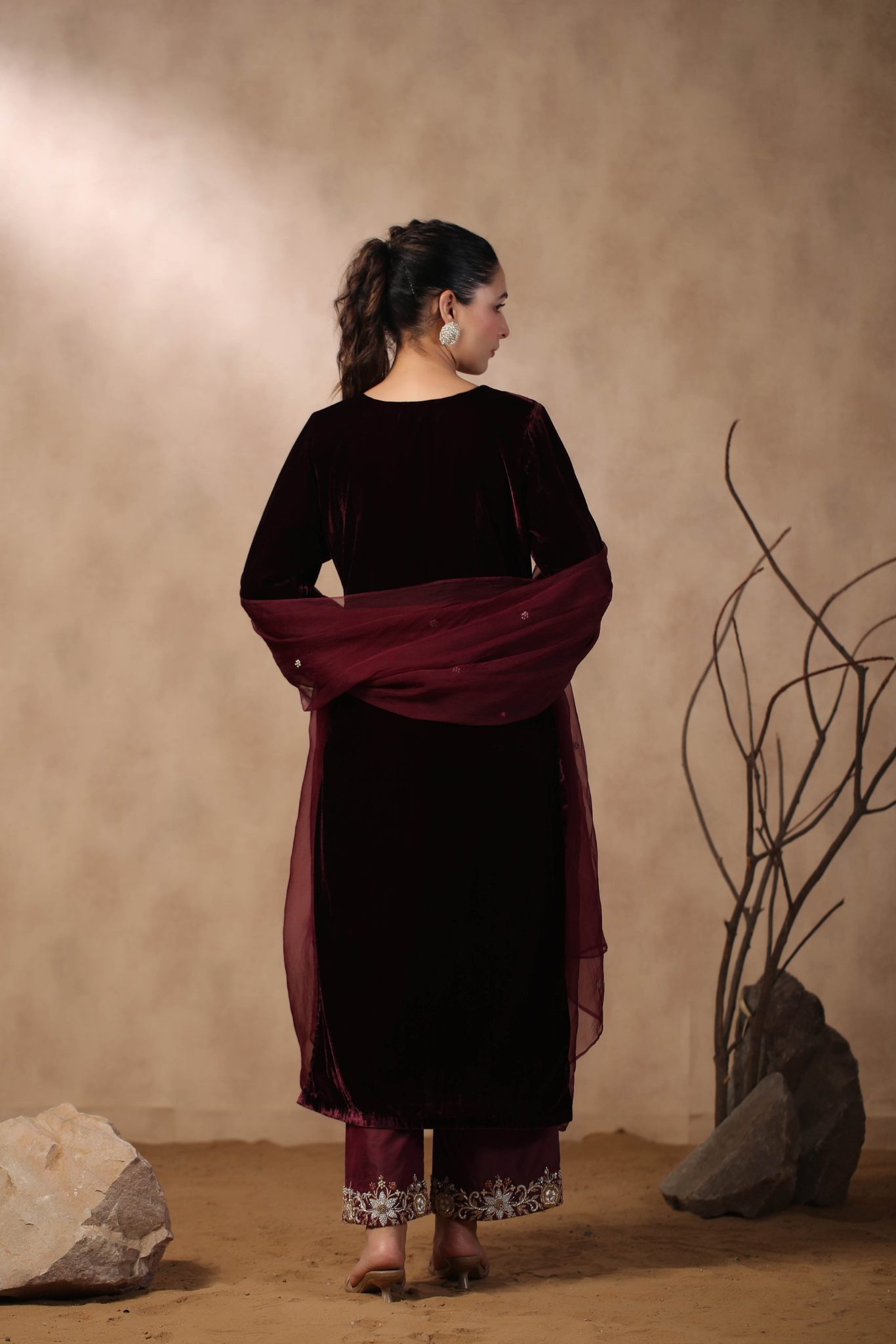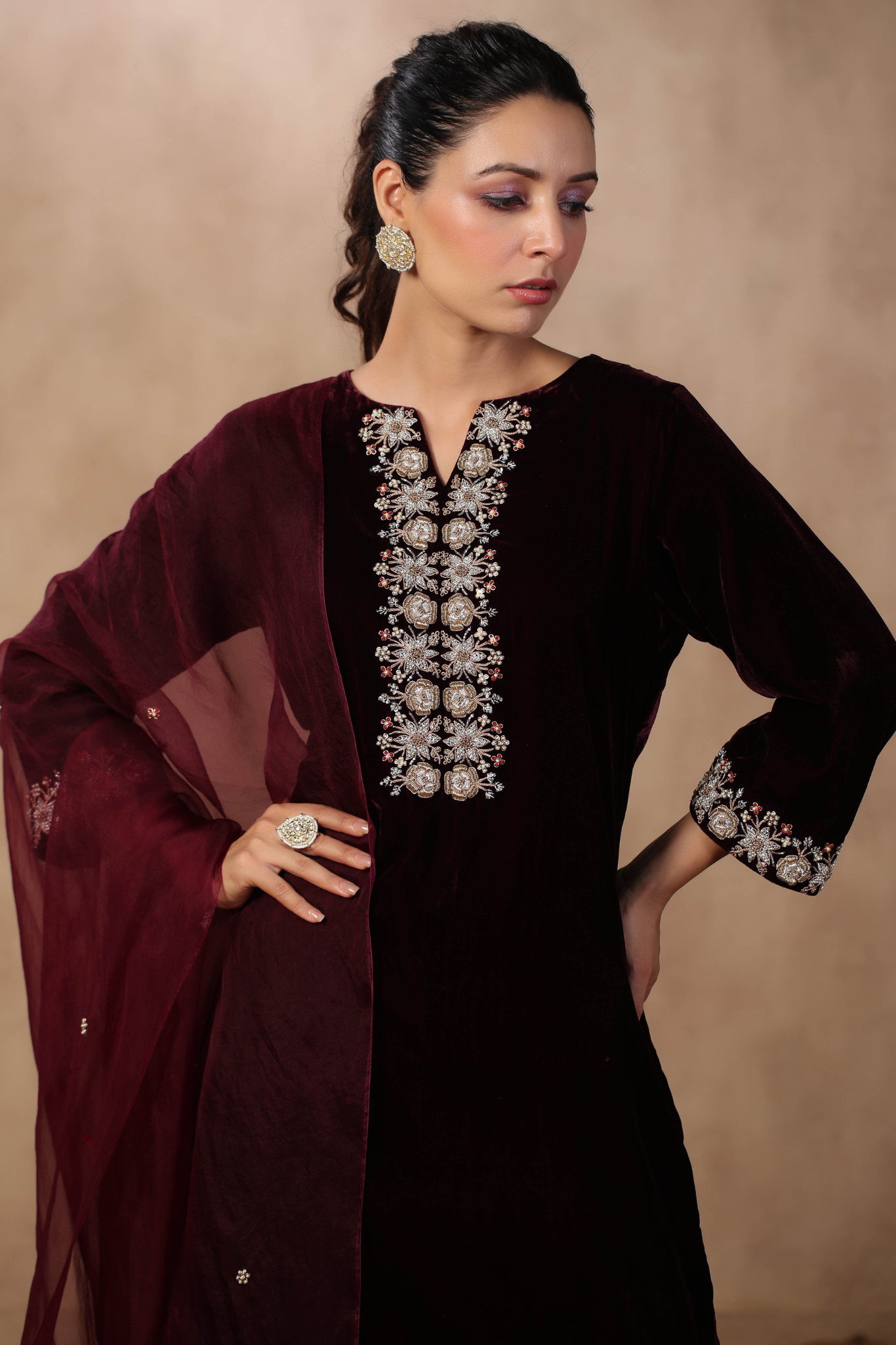 PURPLE VELVET HAND EMBROIDERED KURTA PAIRED WITH...