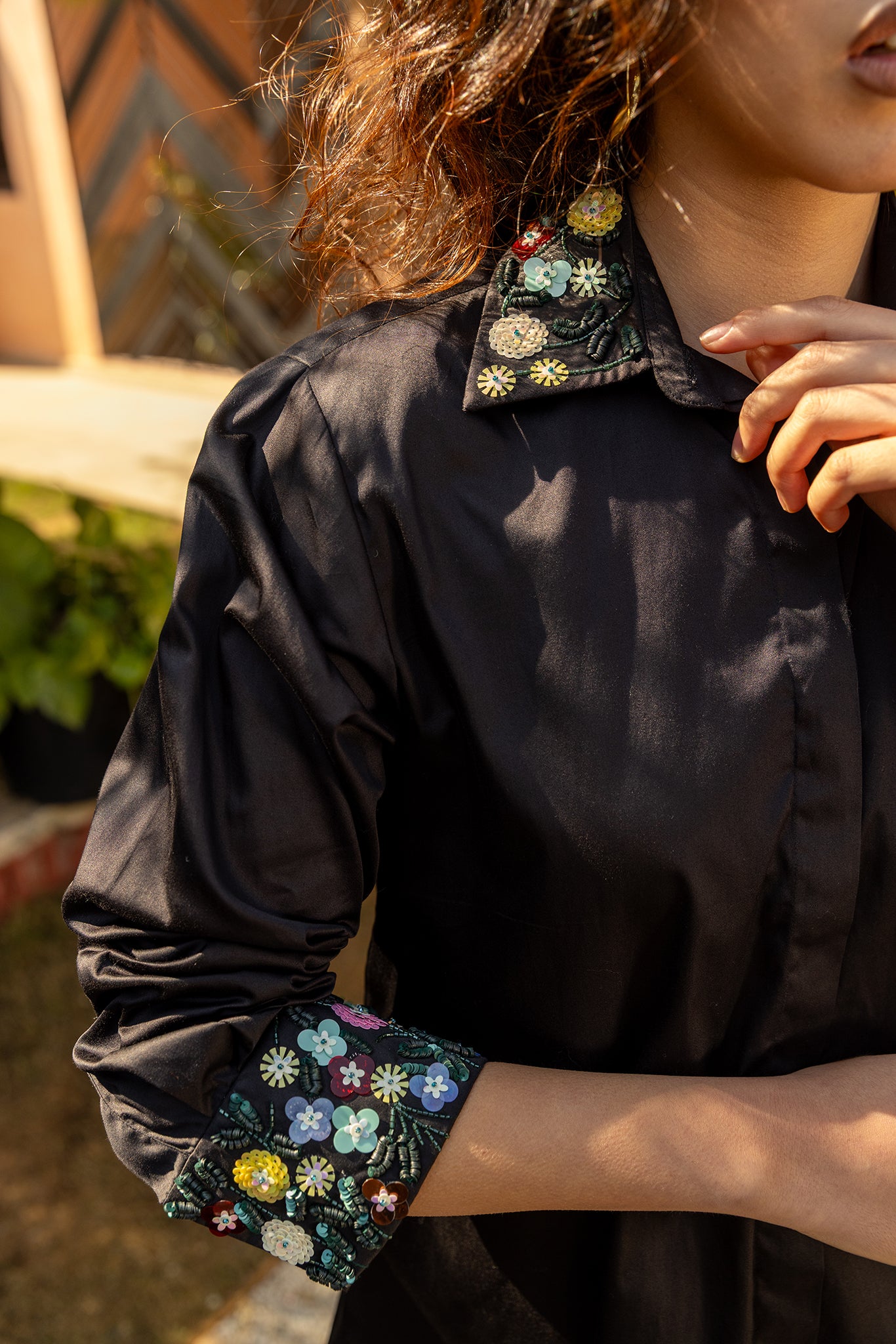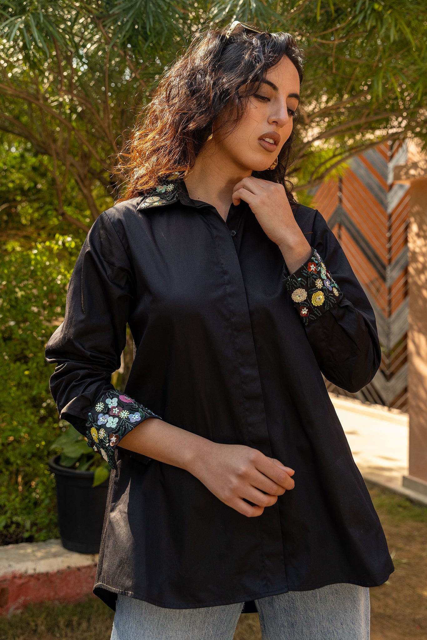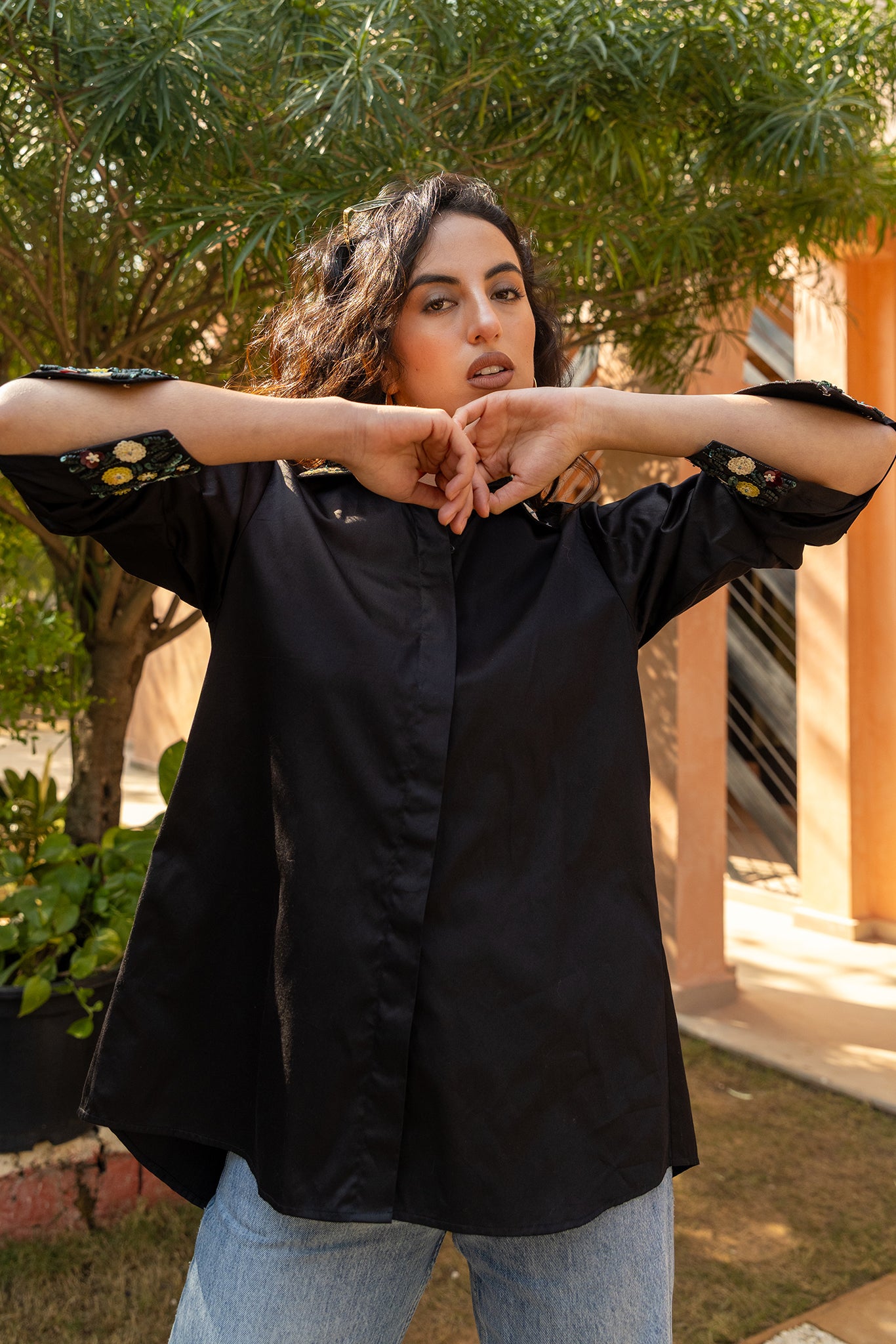 BLACK SHIRT WITH EMBROIDERY ON SLEEVES AND...