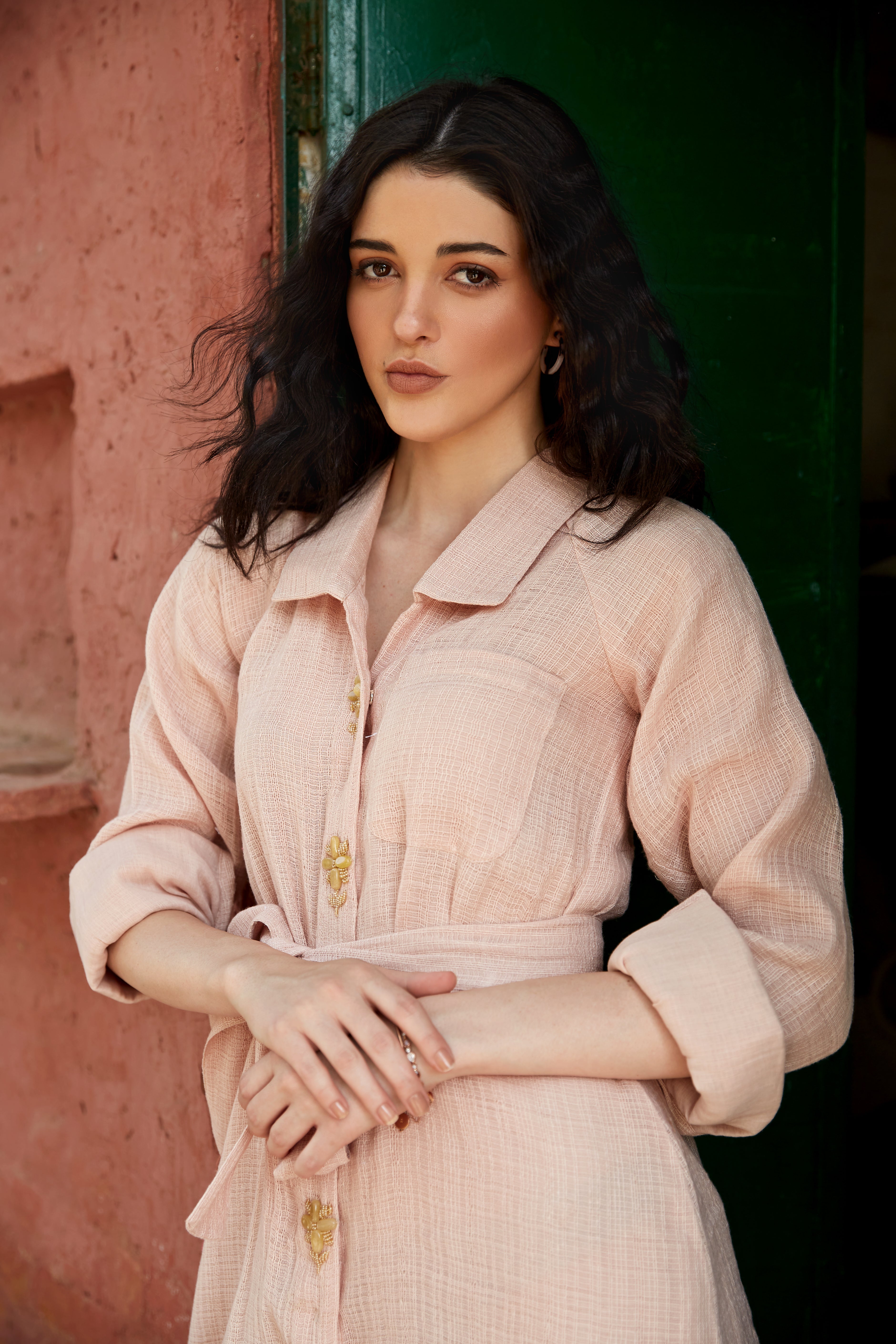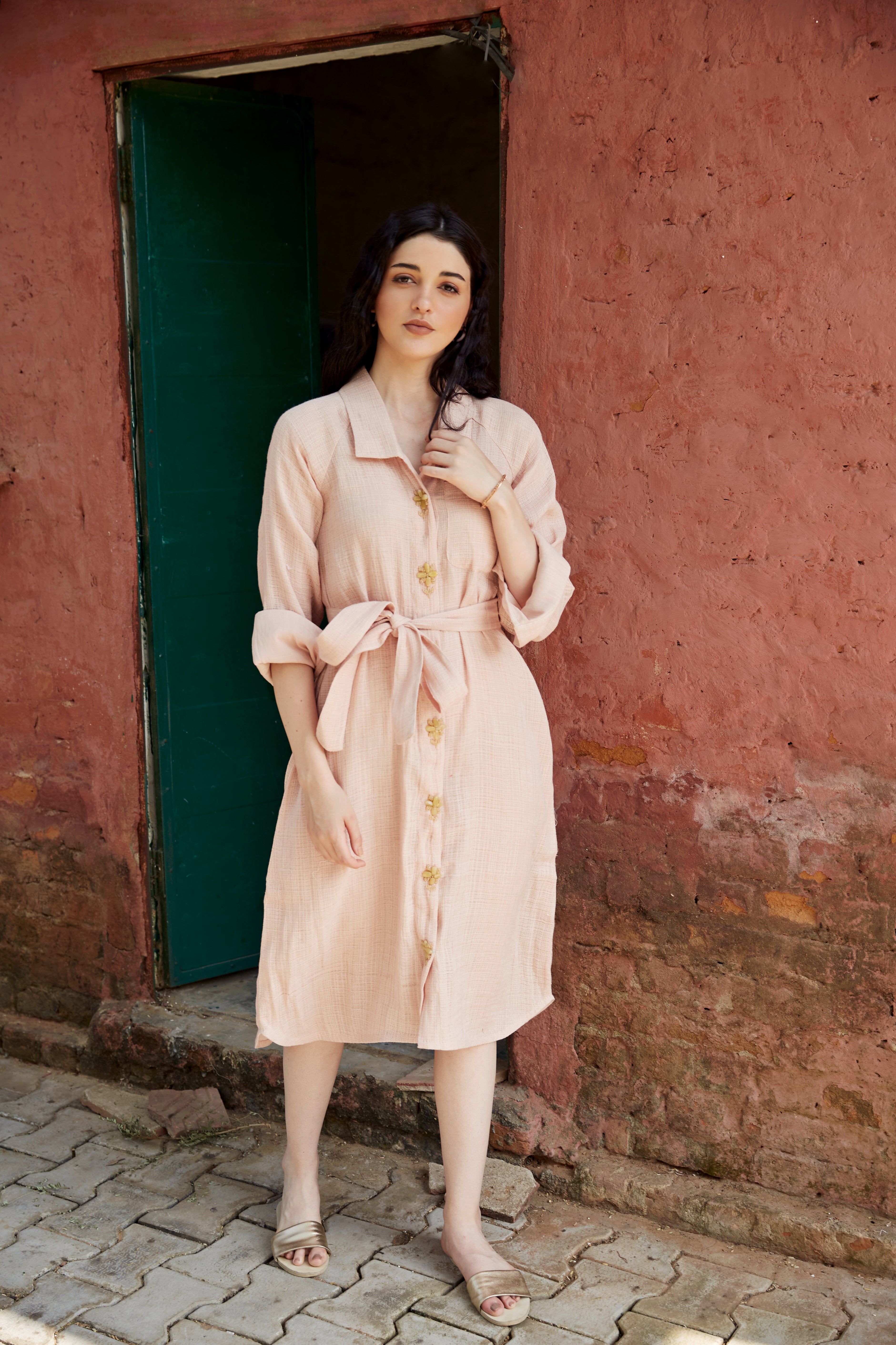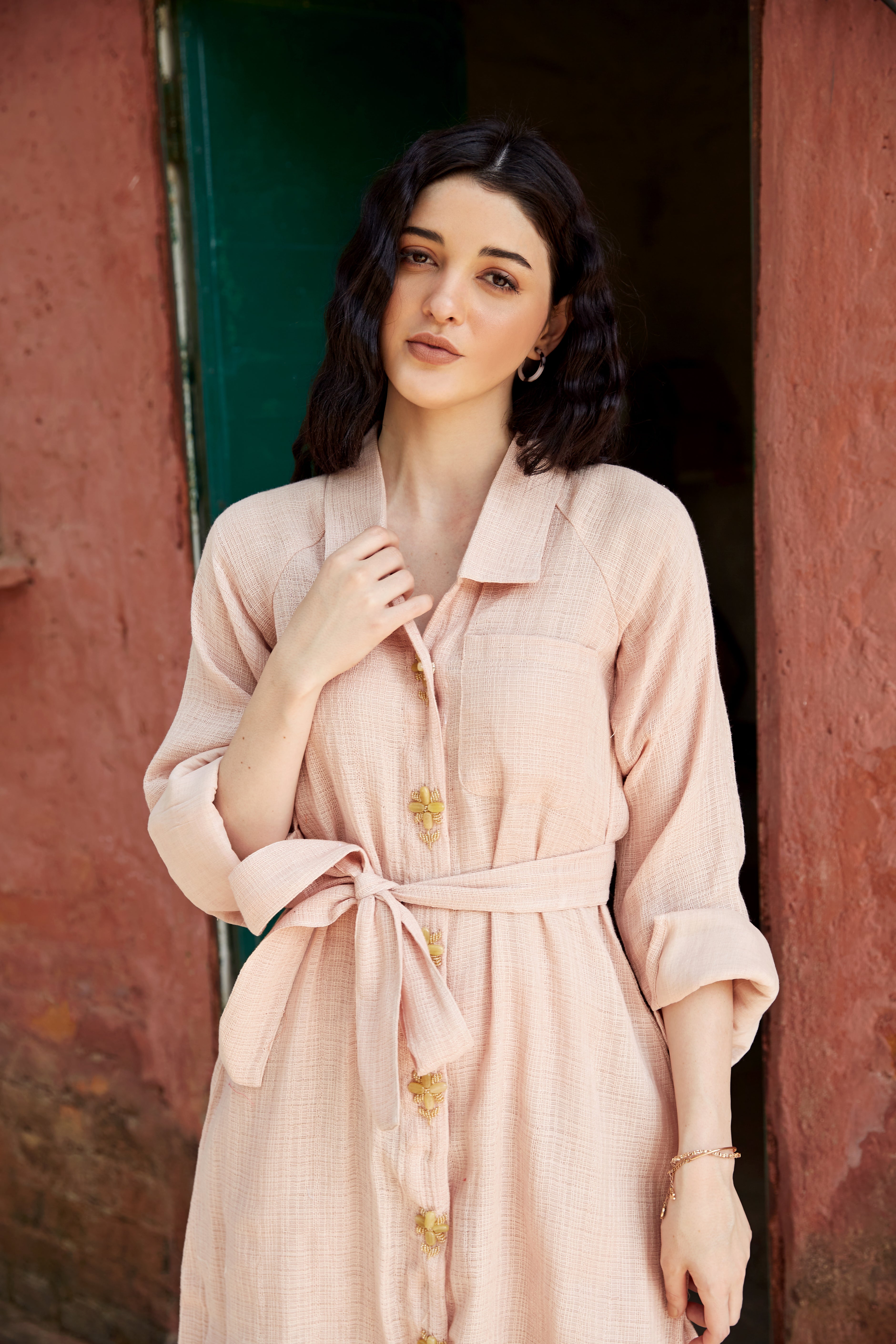 PINK SHIRT DRESS WITH HAND EMBROIDERED BUTTONS...