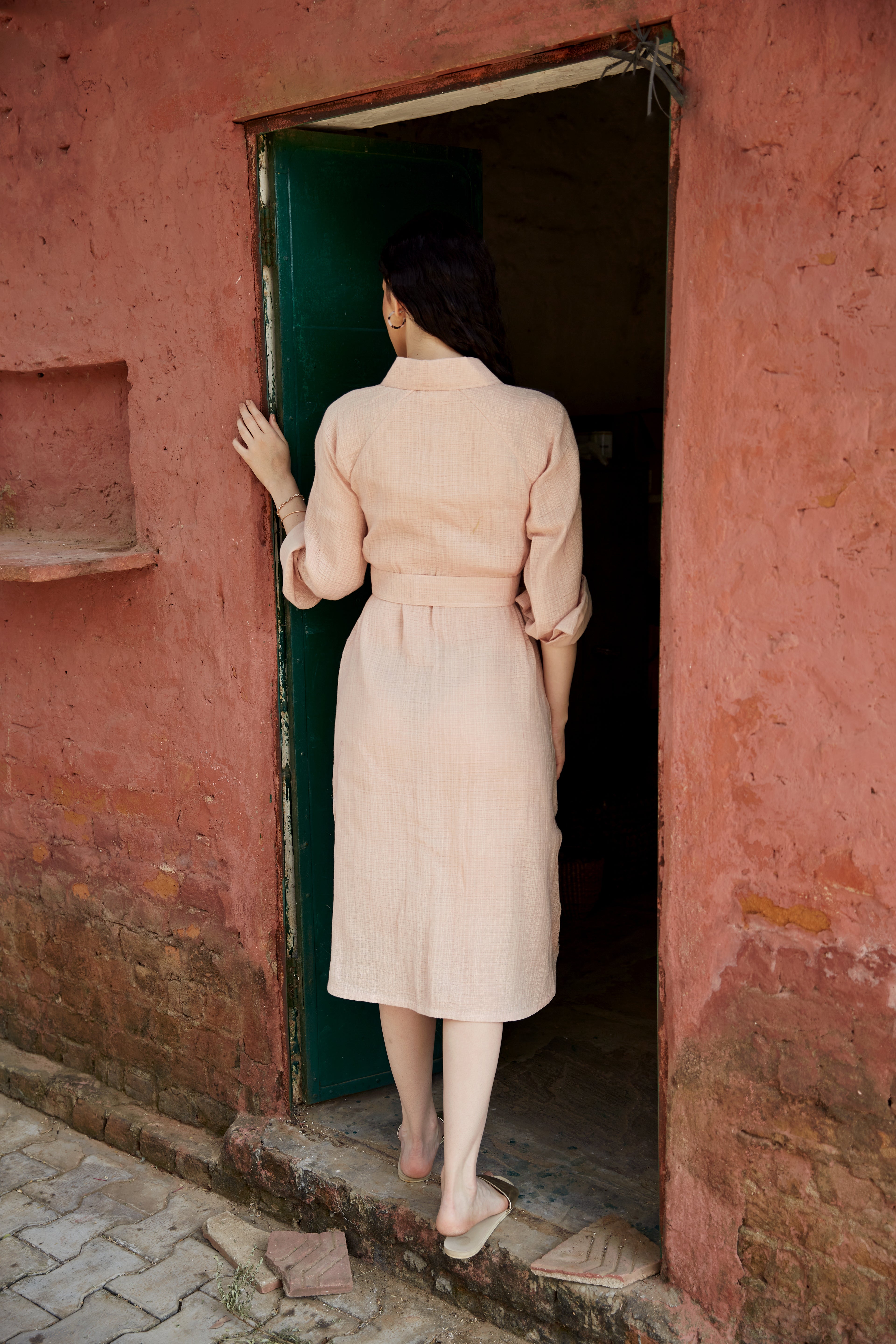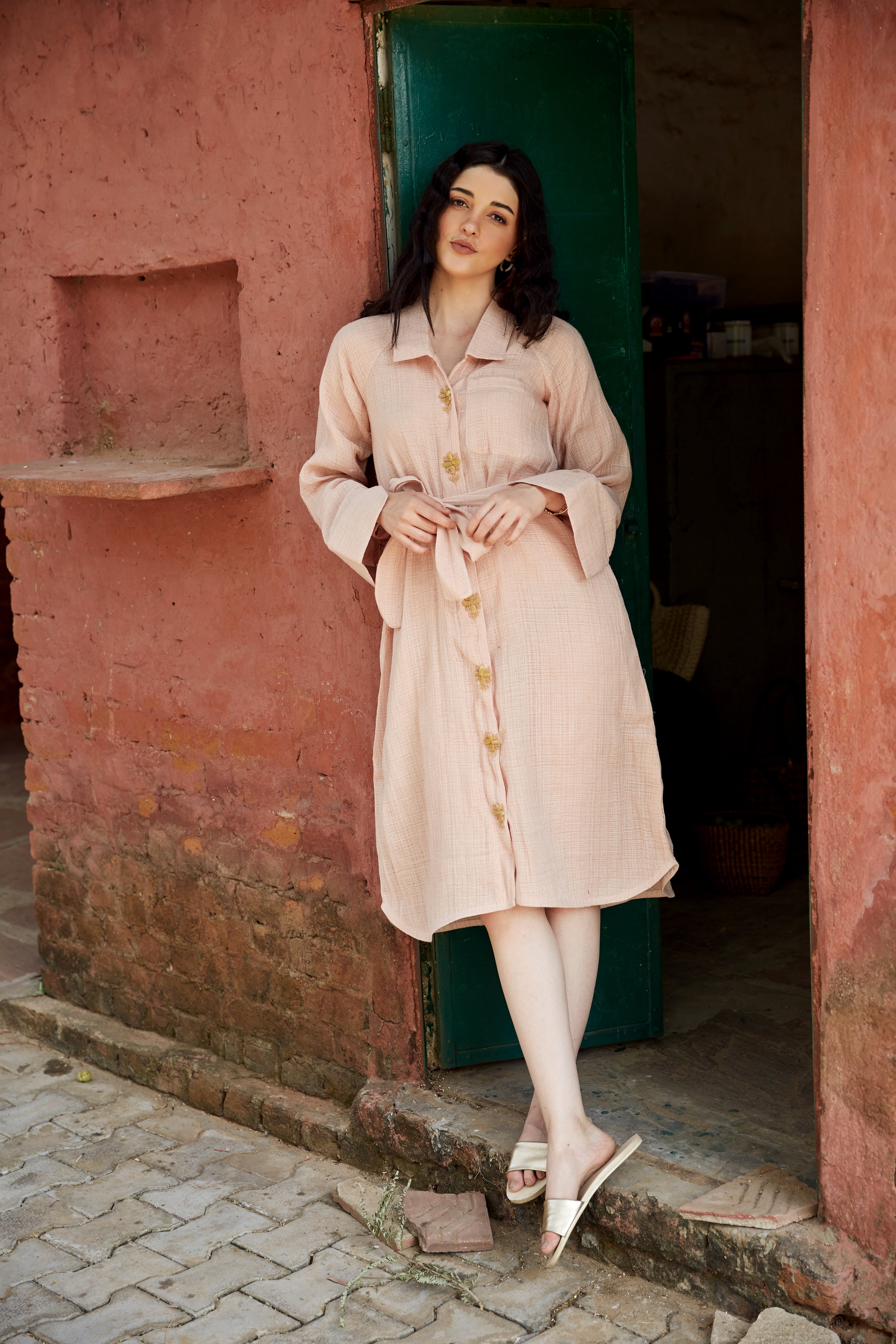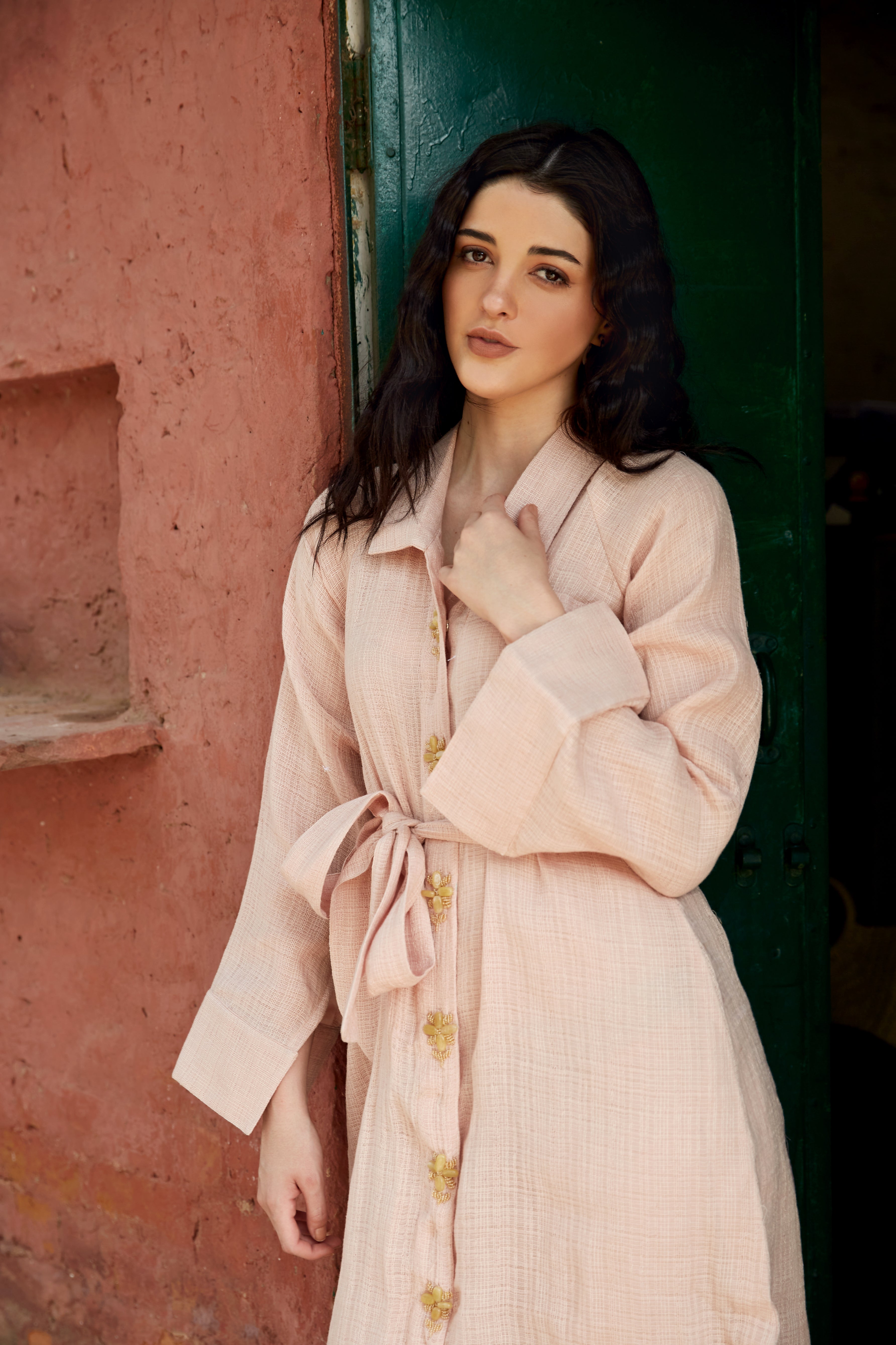 PINK SHIRT DRESS WITH HAND EMBROIDERED BUTTONS...