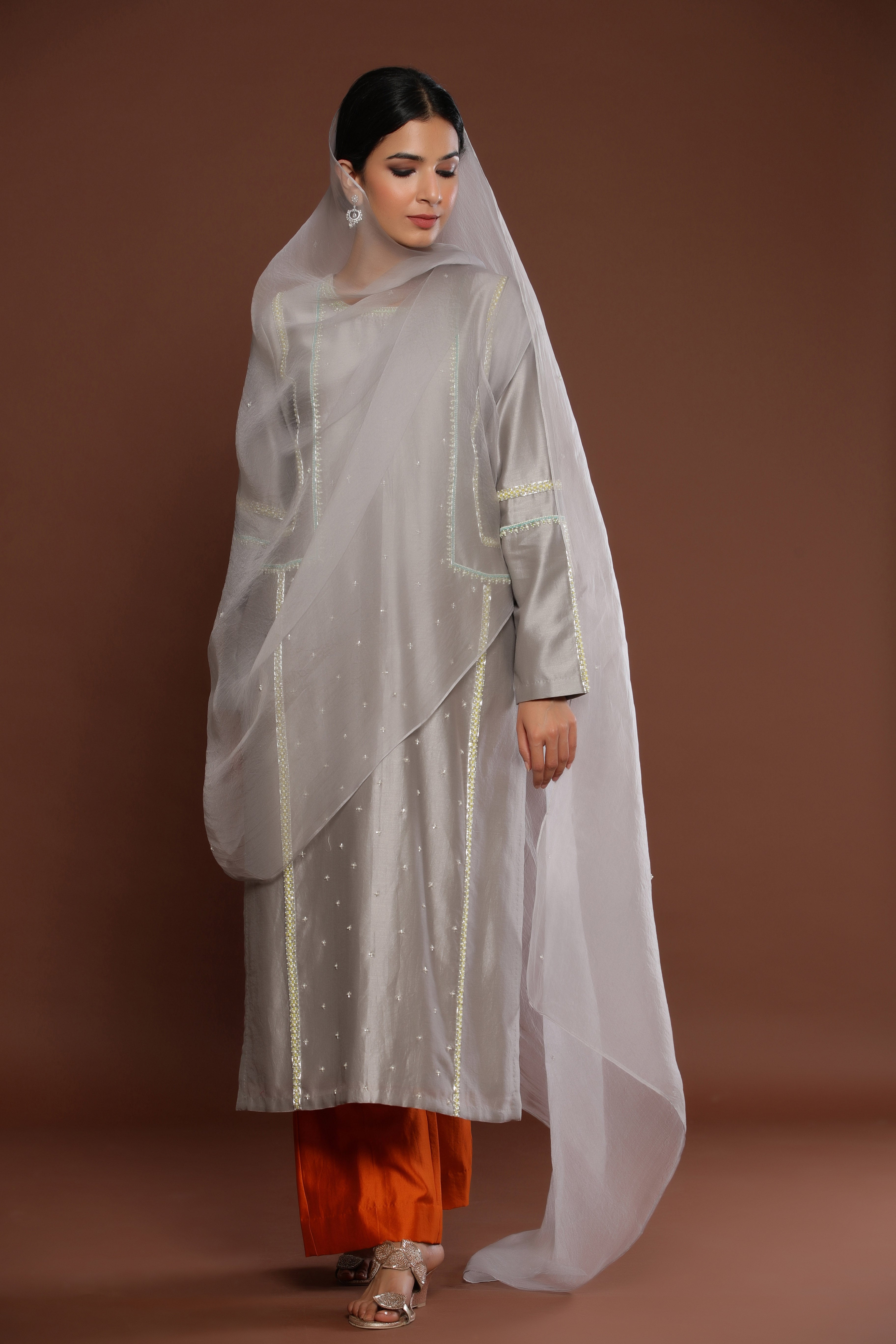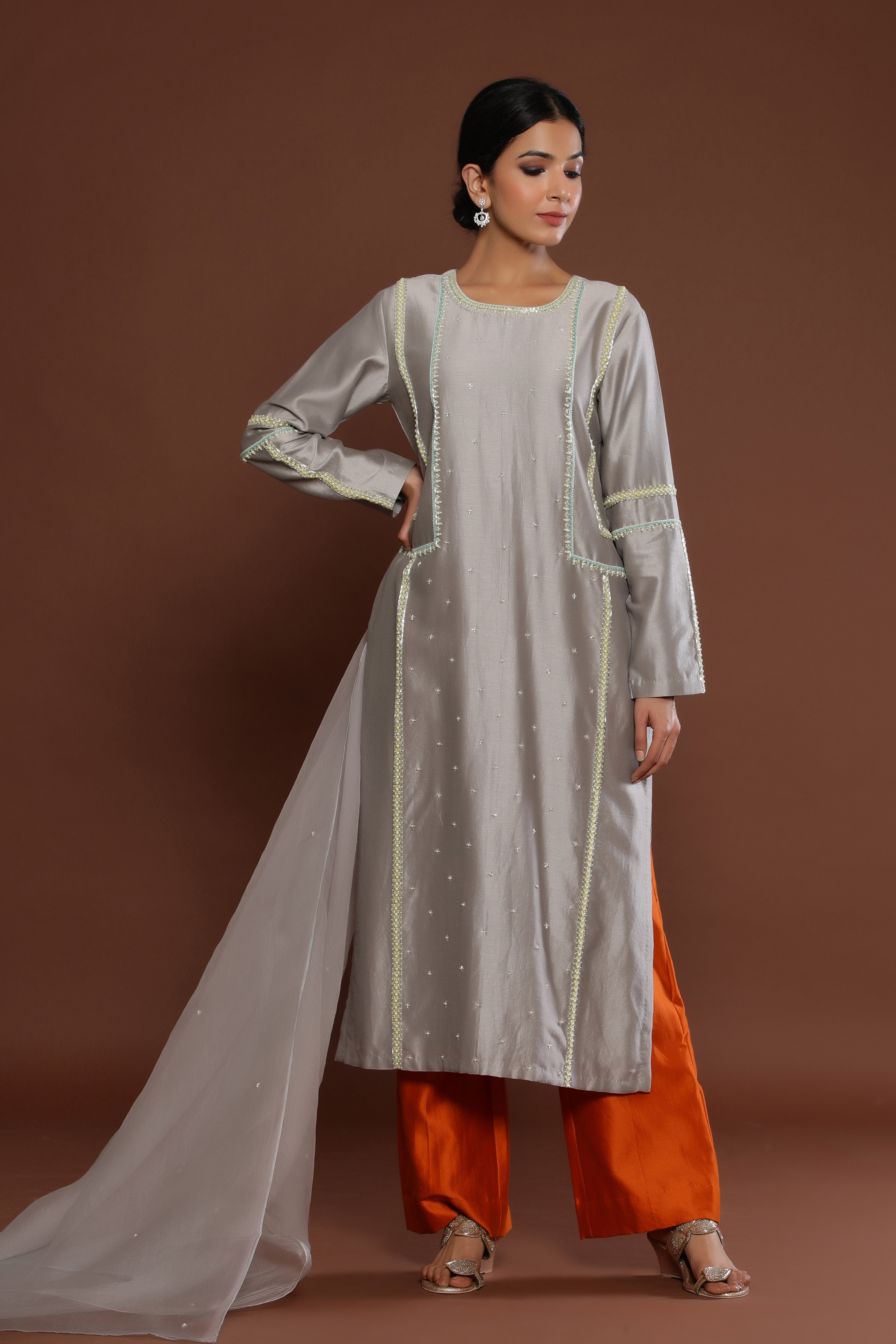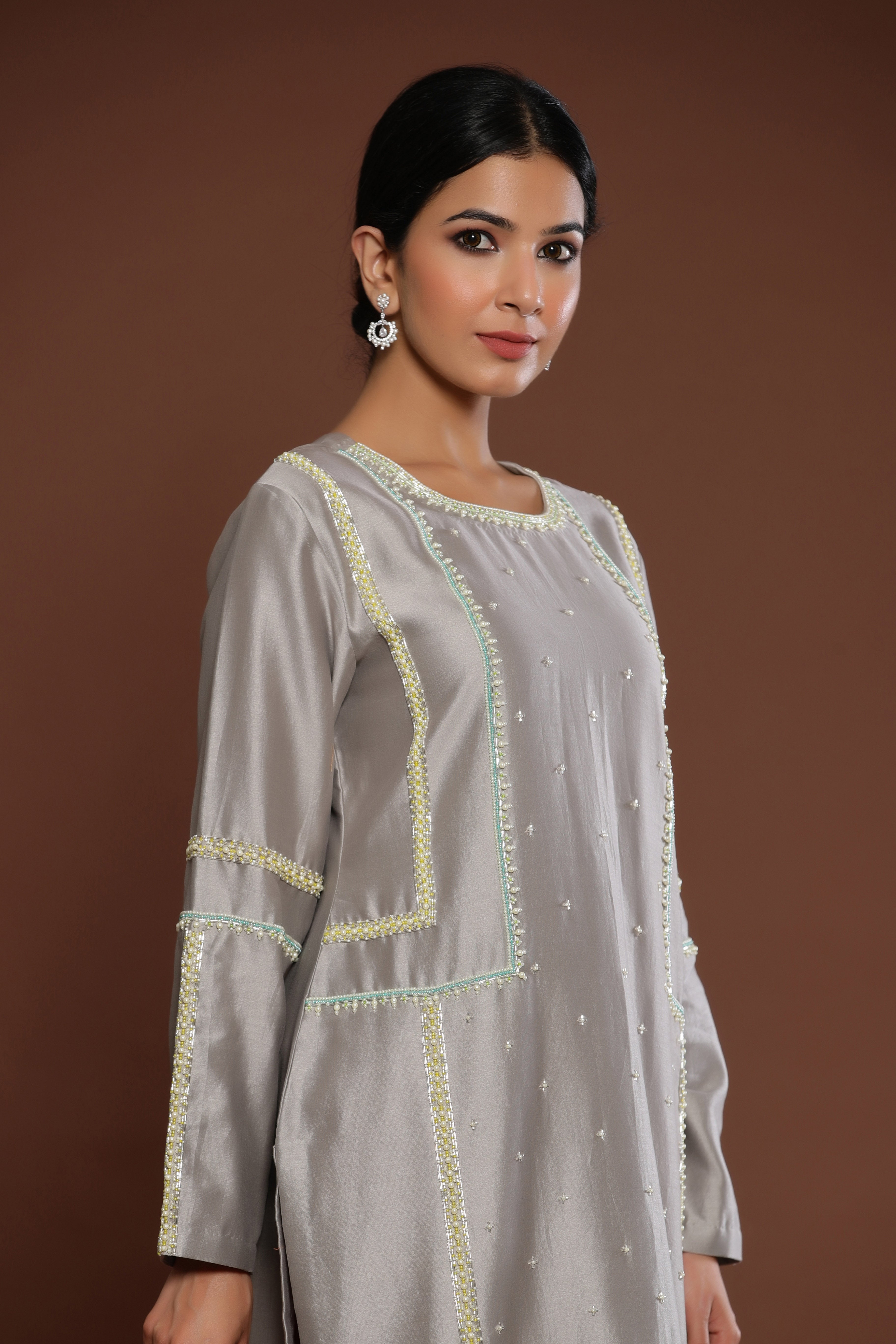 GREY COLOUR STRAIGHT KURTA ENHANCED BY PEARL...