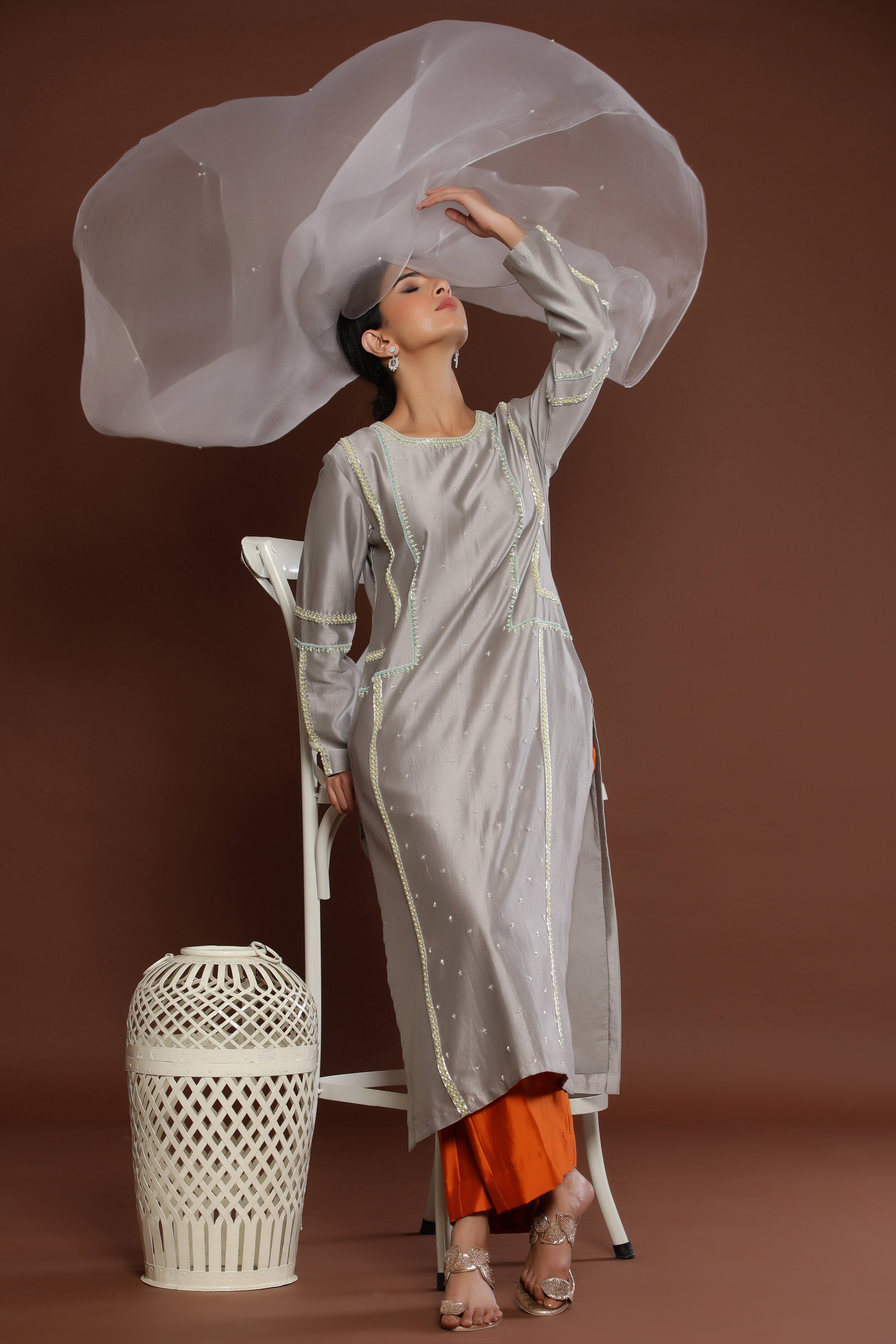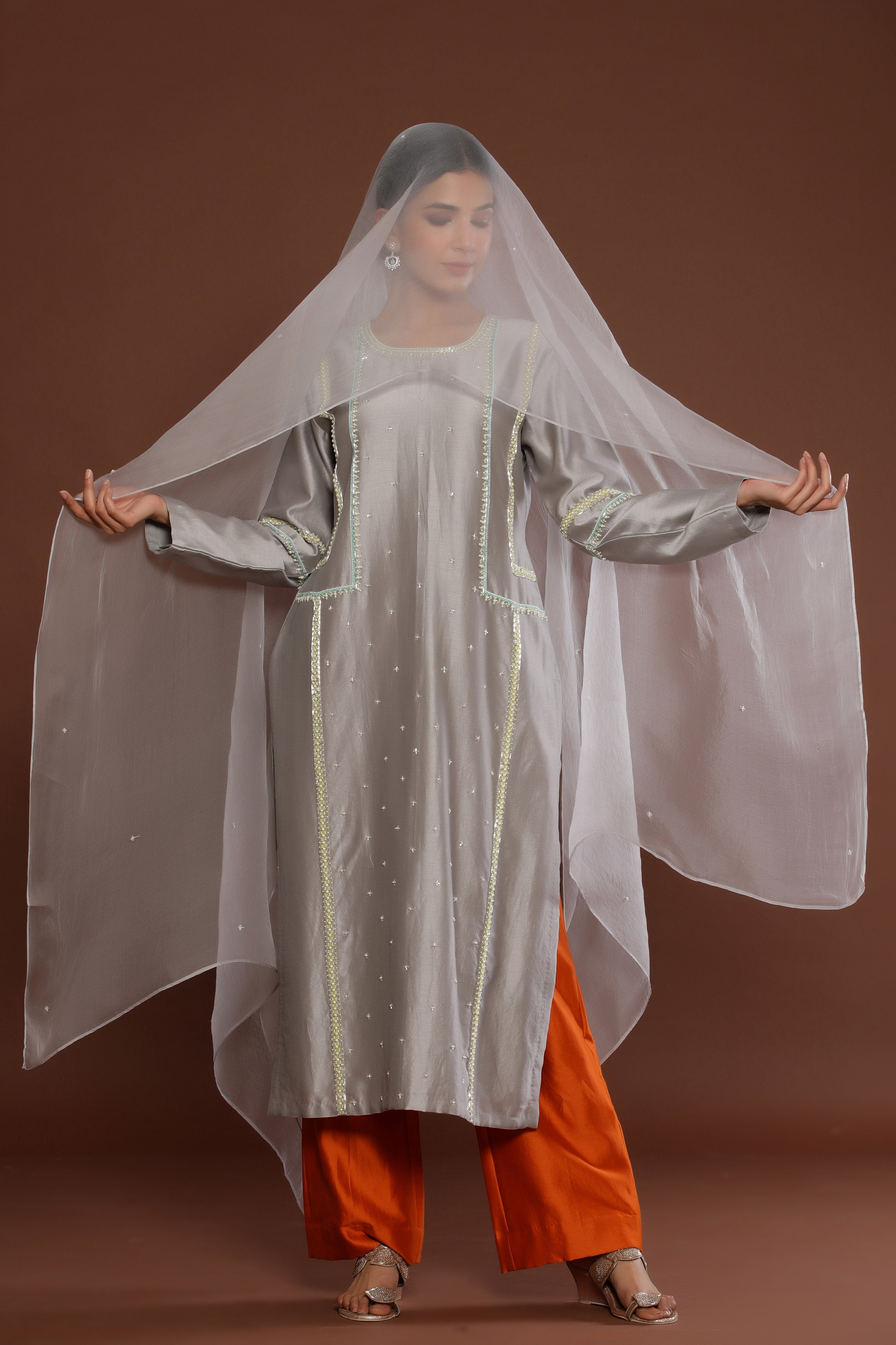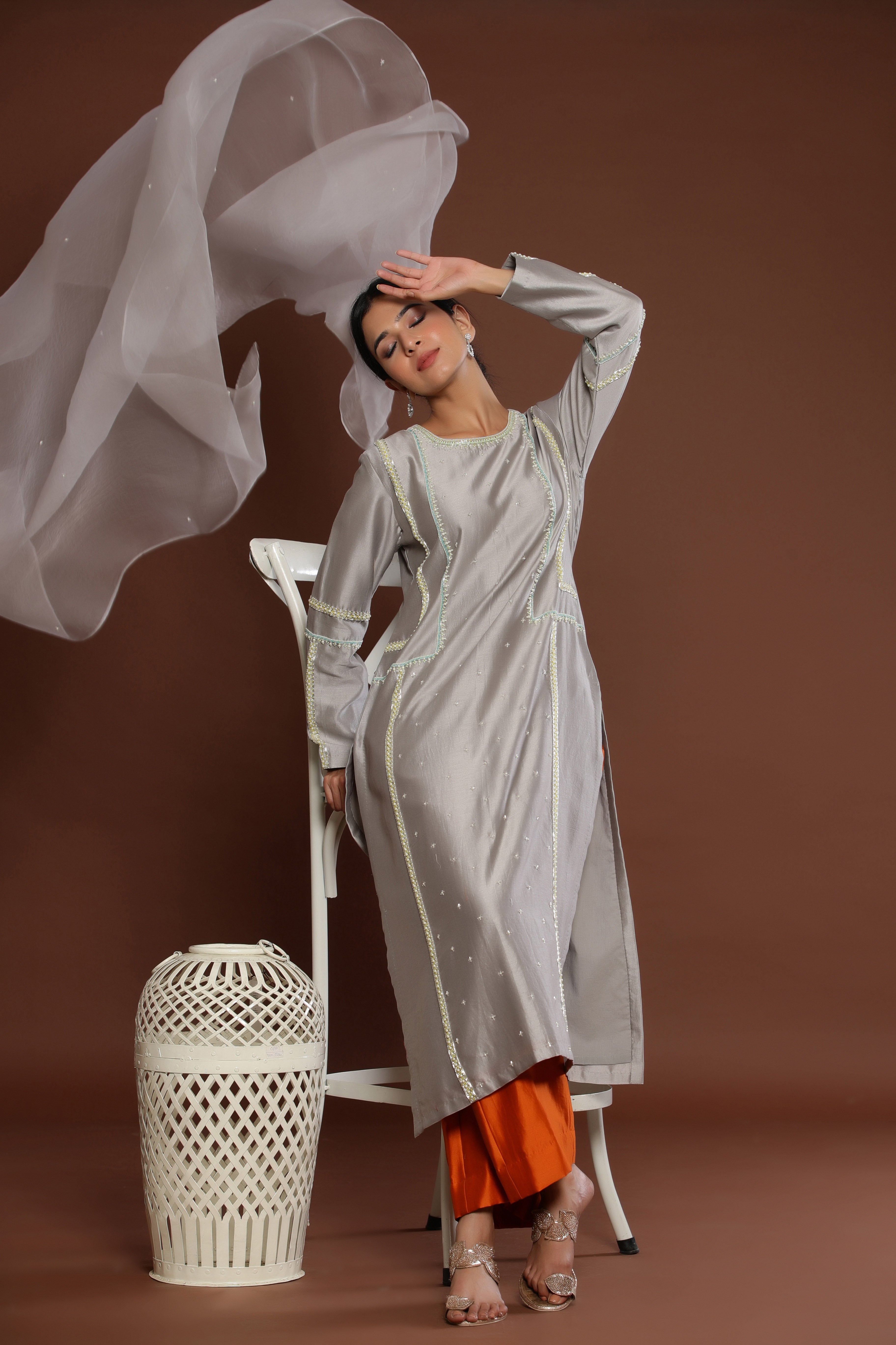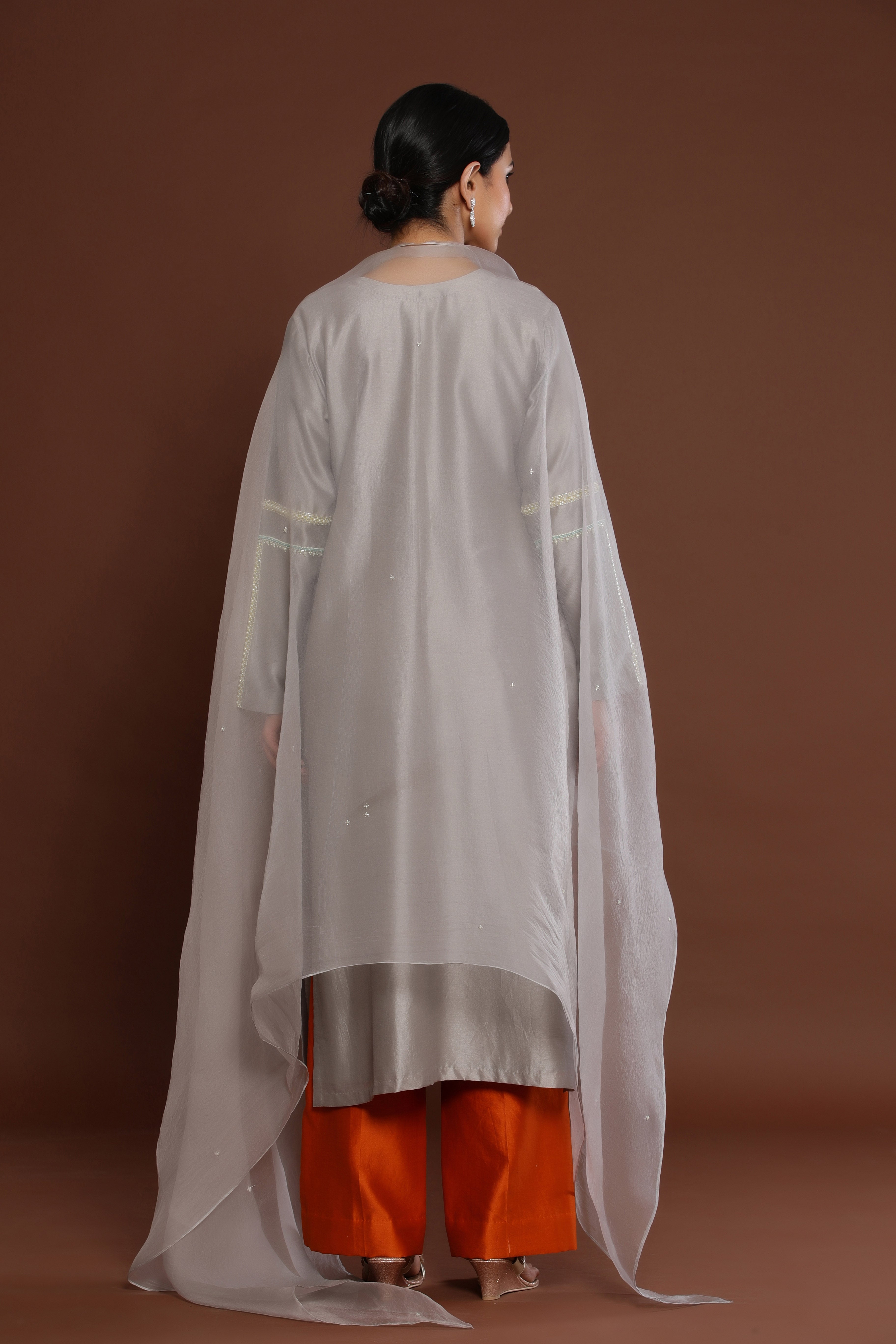 GREY COLOUR STRAIGHT KURTA ENHANCED BY PEARL...