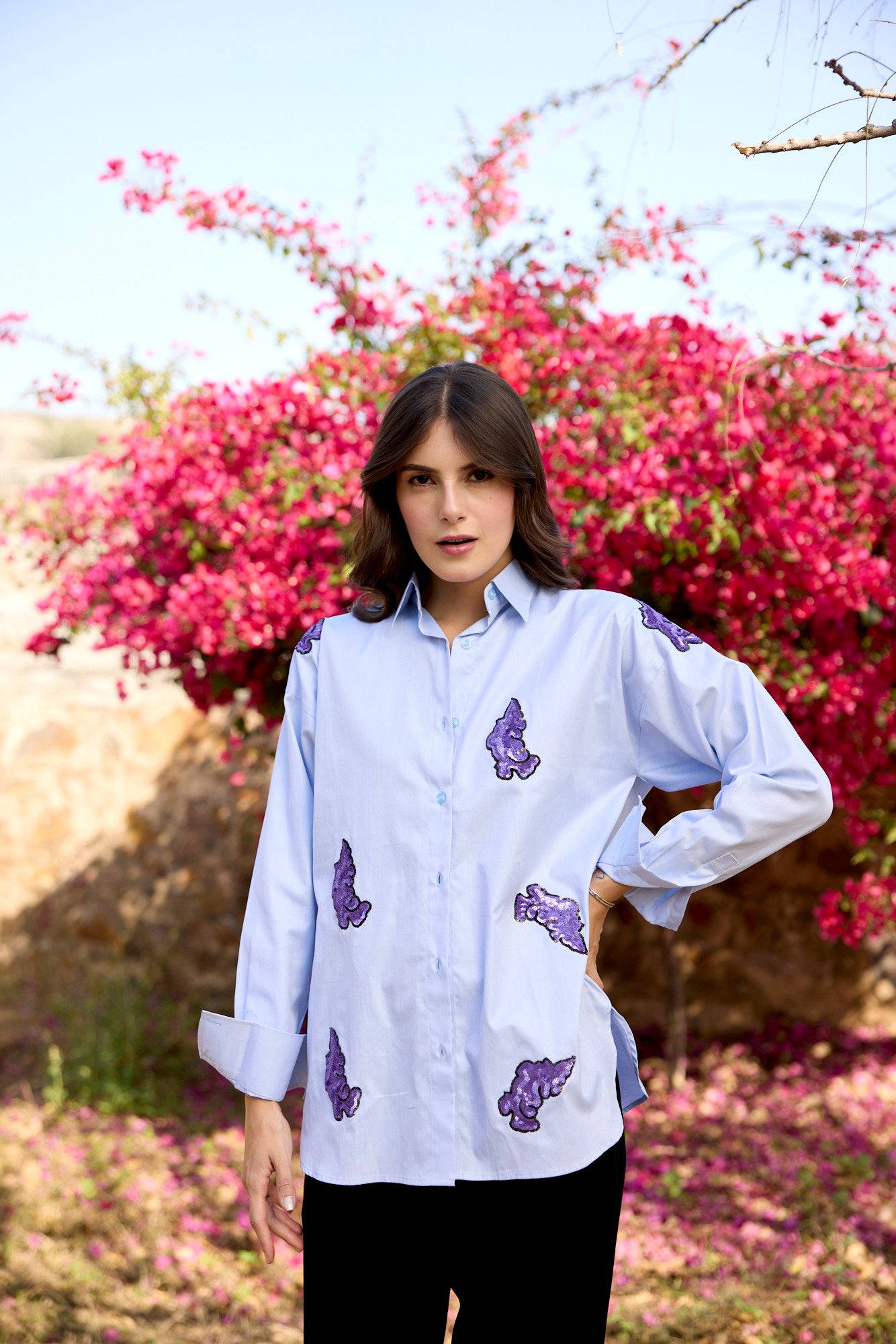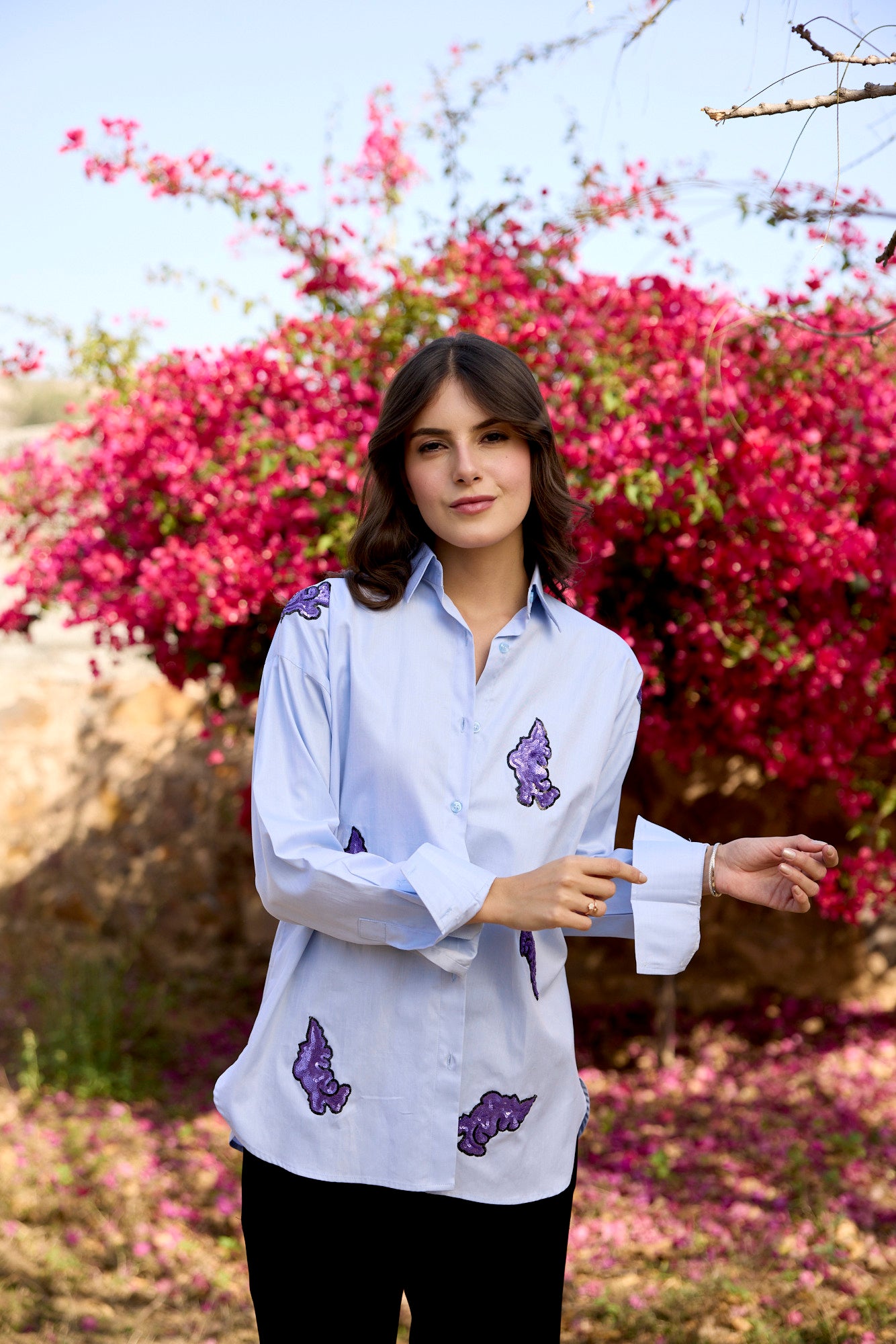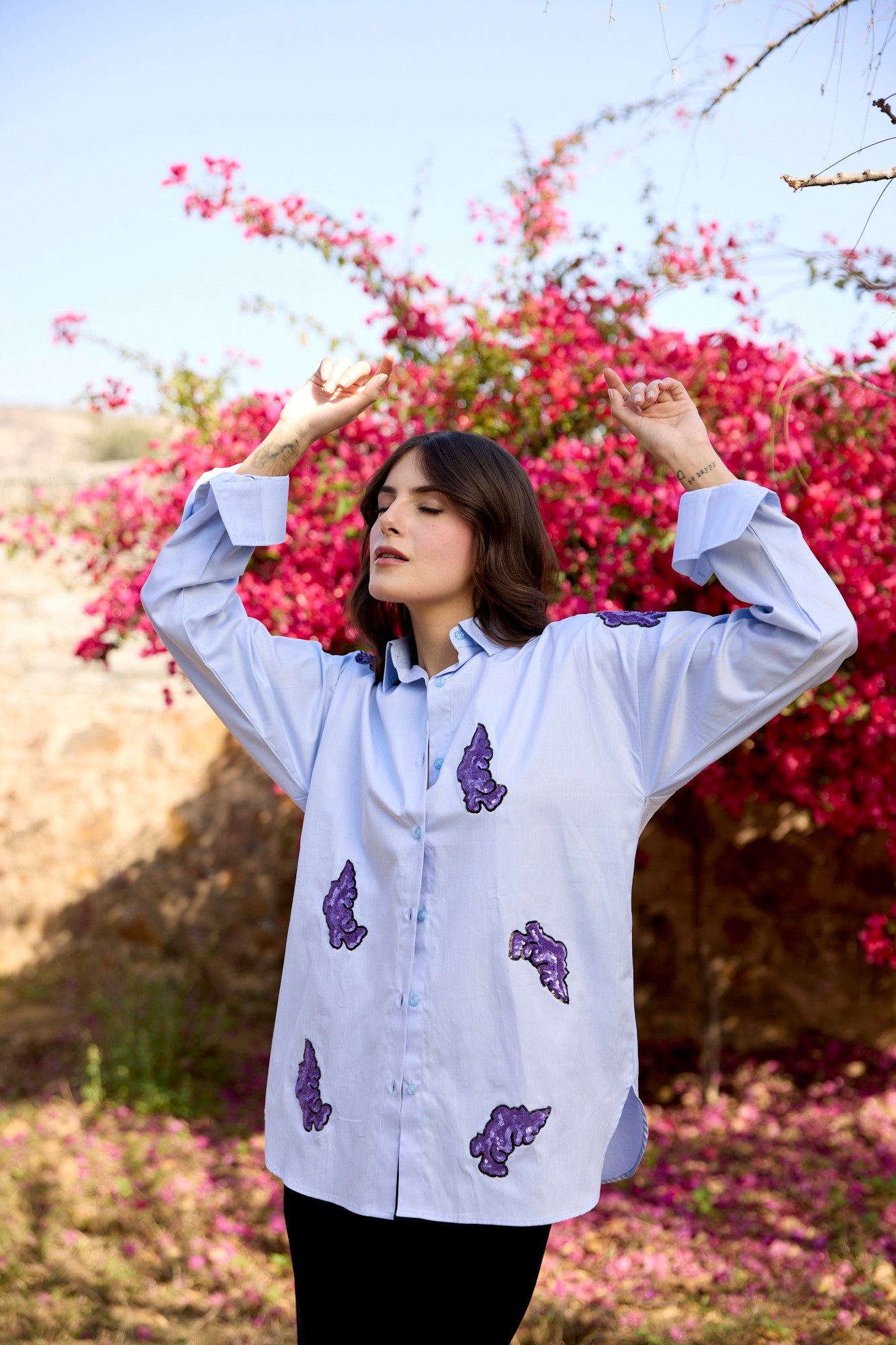 LIGHT BLUE SHIRT WITH PURPLE COLOUR CLOUD EMBROIDERY PATCH
