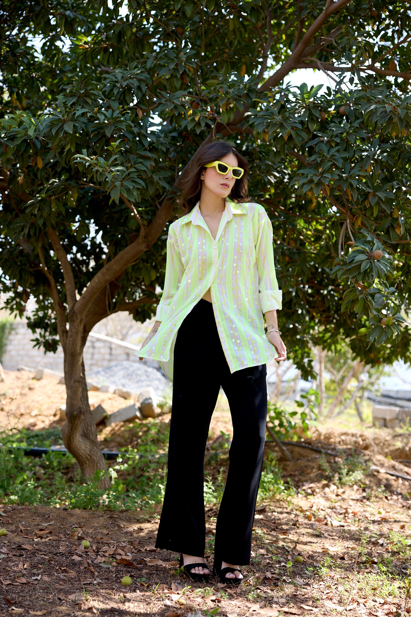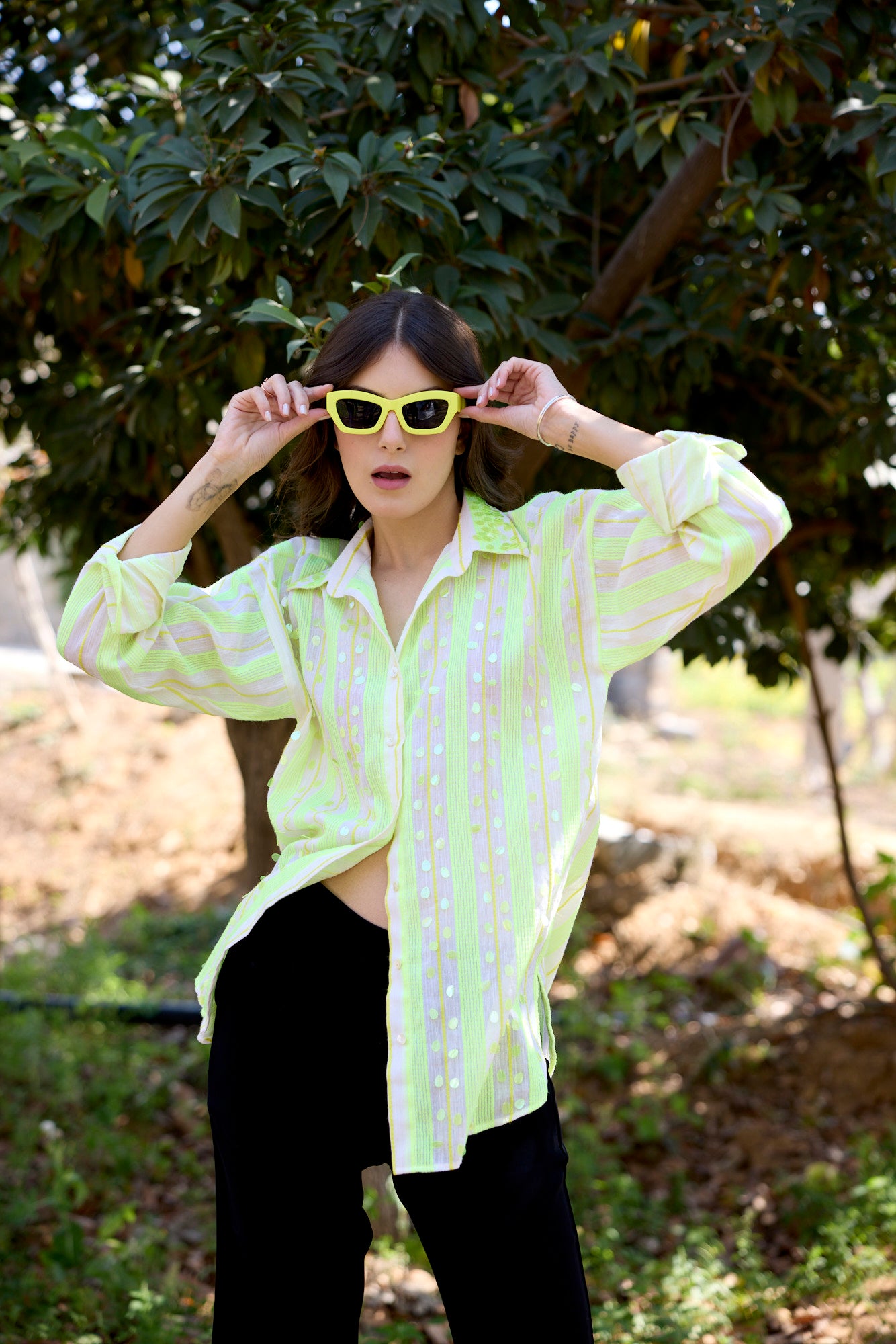 WHITE SHIRT WITH NEON YELLOW THREAD STRIPES...
