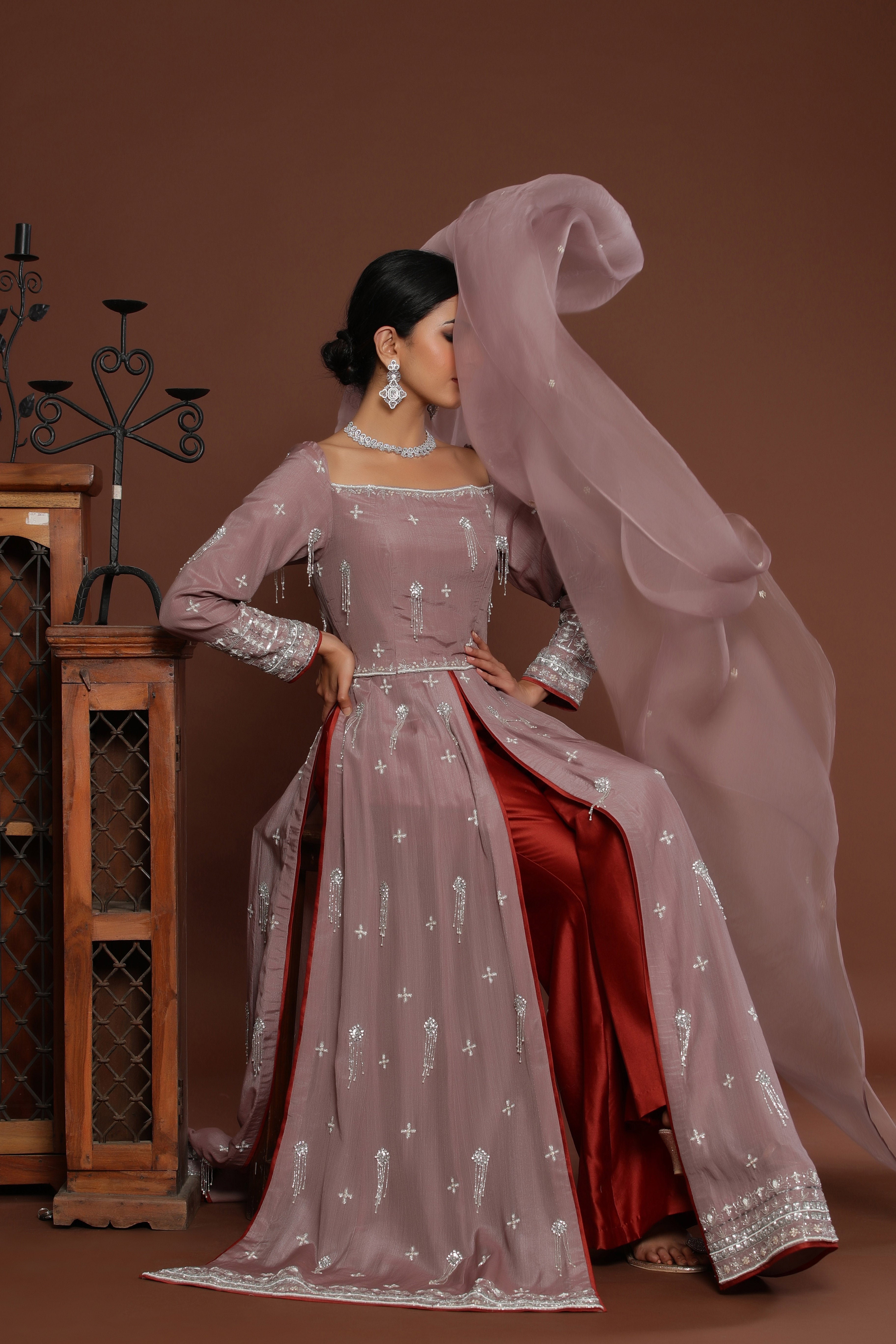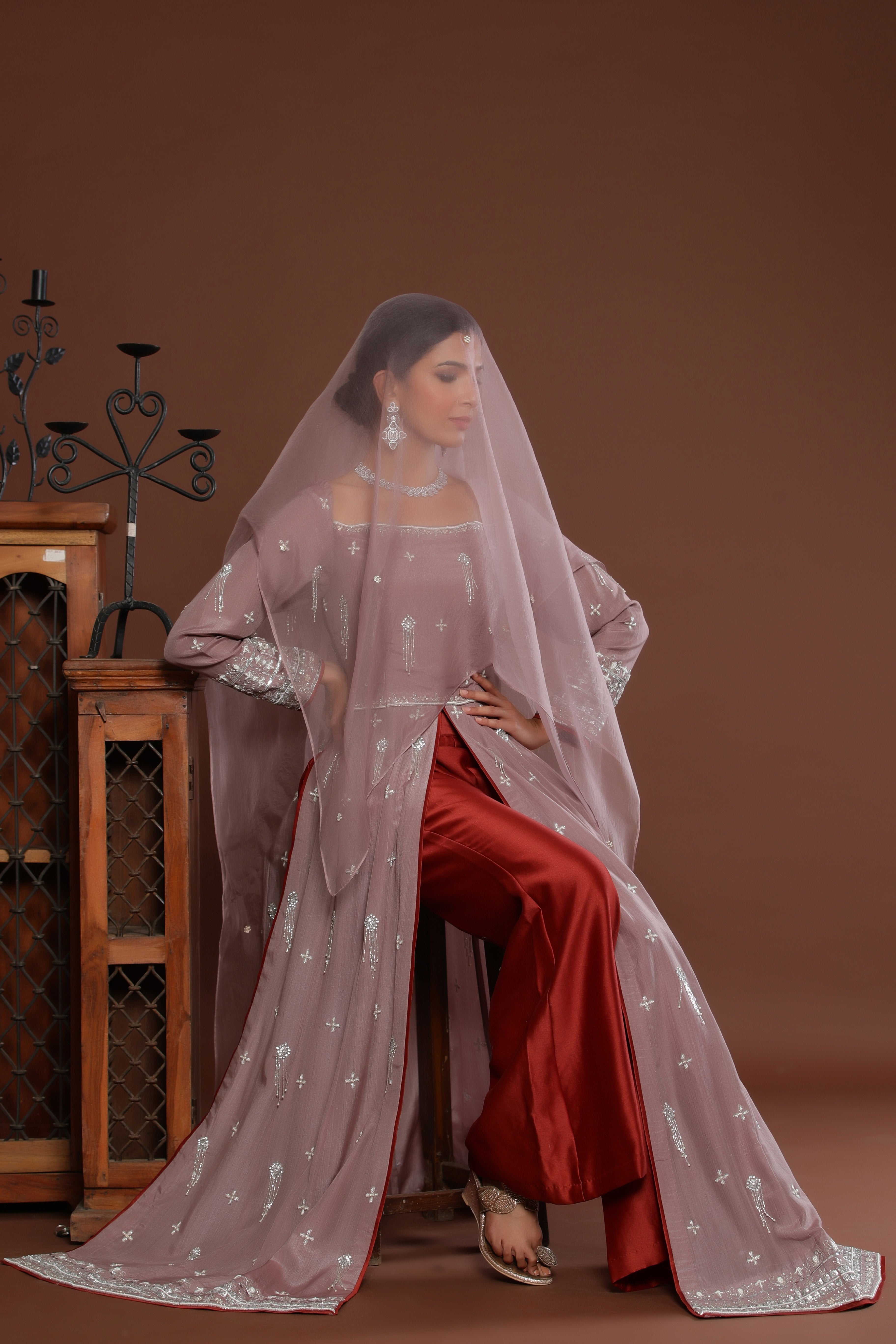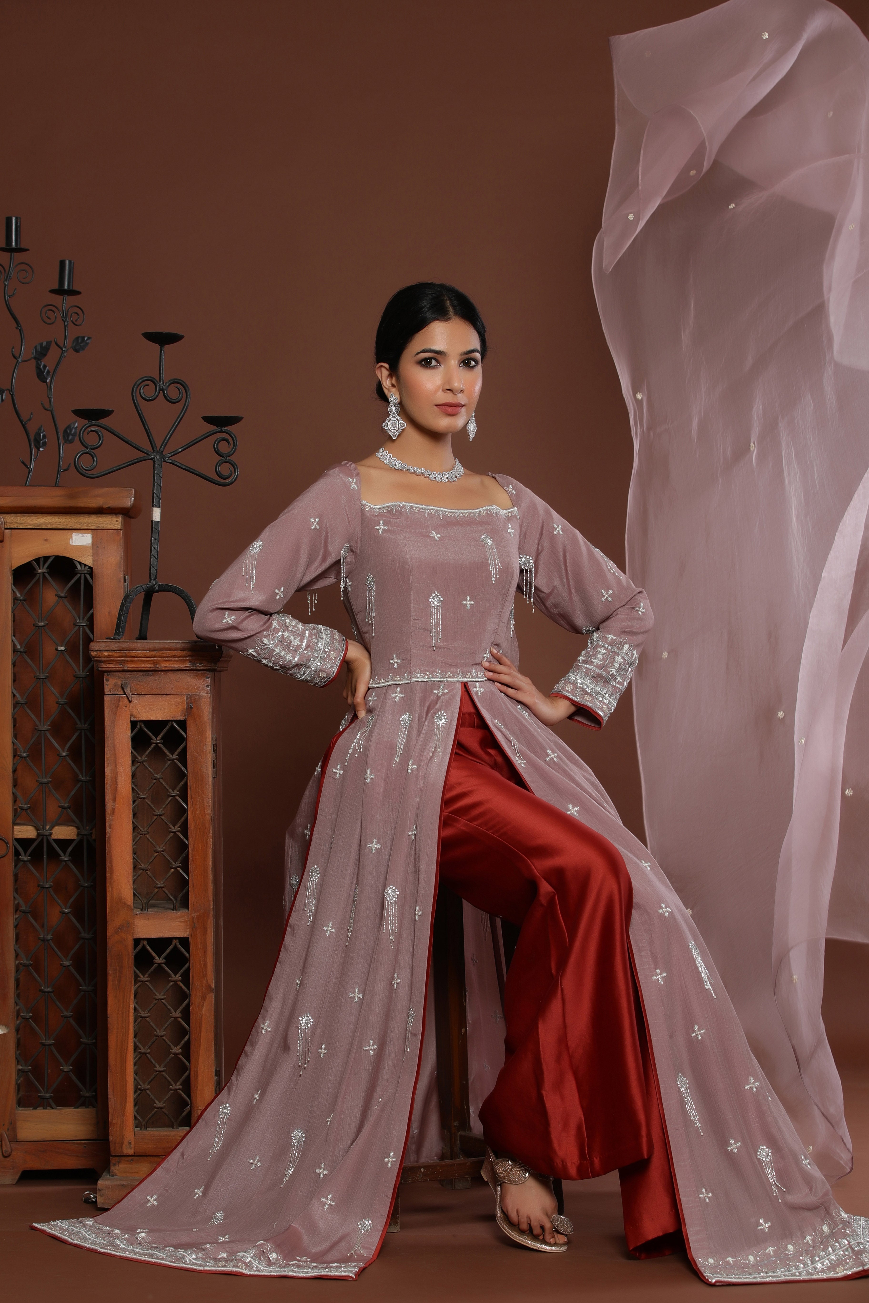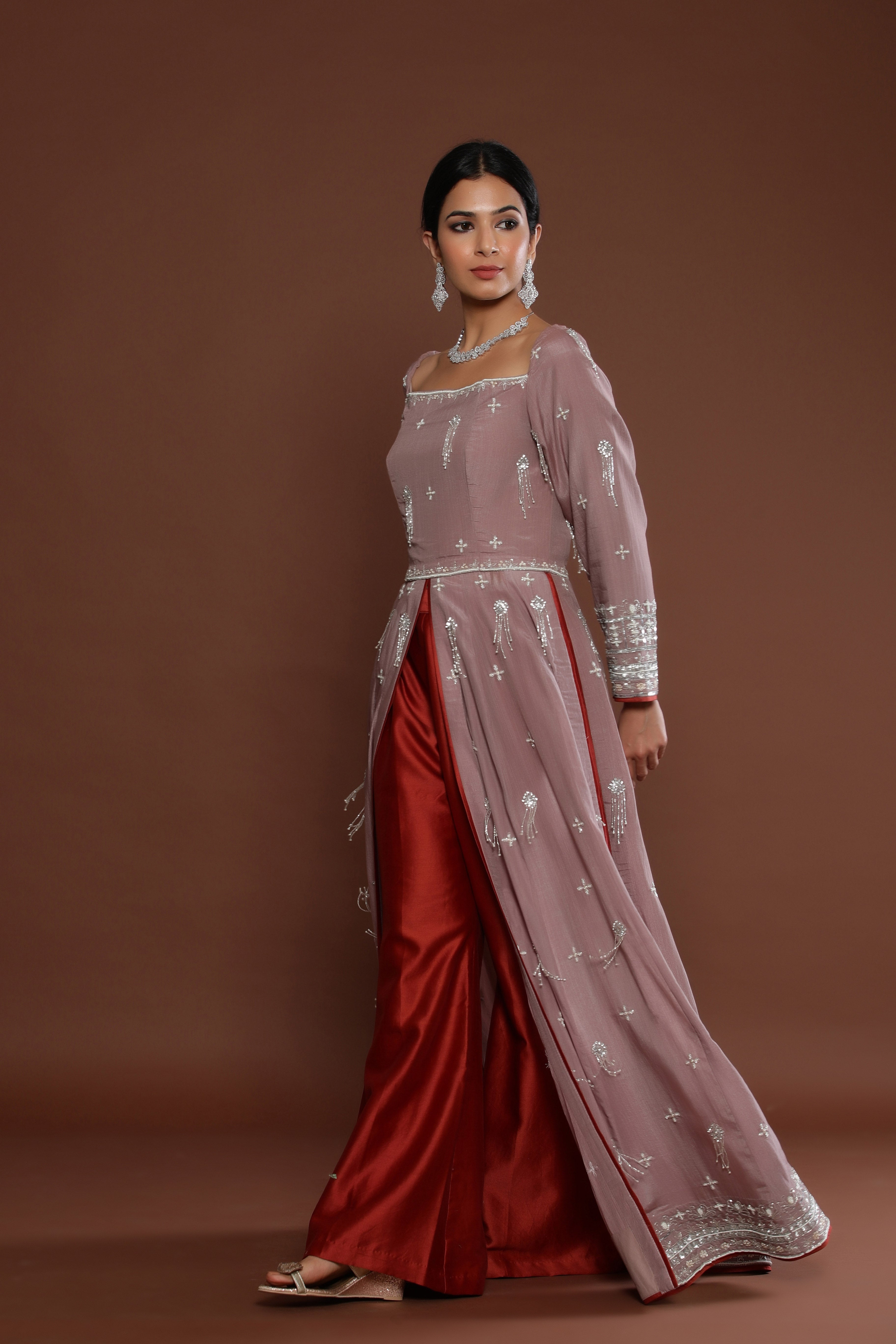 BROWN CHANDERI EMBROIDERED HIGH SLIT CUT OUT BELOW THE BODICE. THIS PIECE IS DECORATED WITH SILVER EMBELLISHMENTS ALL OVER AS WELL AS INTRICATELY HANDMADE BORDER. AND PAIRED WITH BRIGHT RUST BELL BOTTOM PANTS.