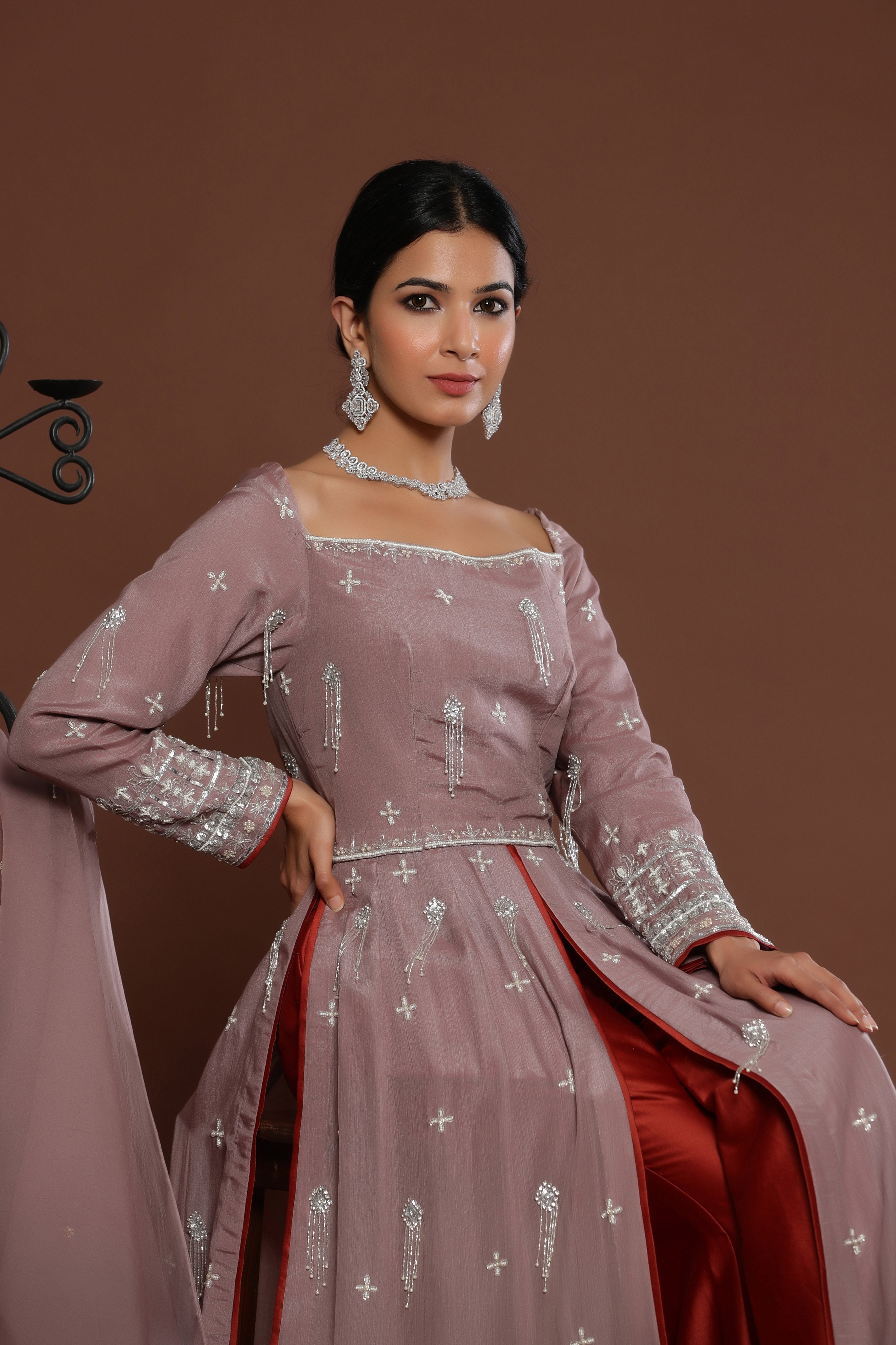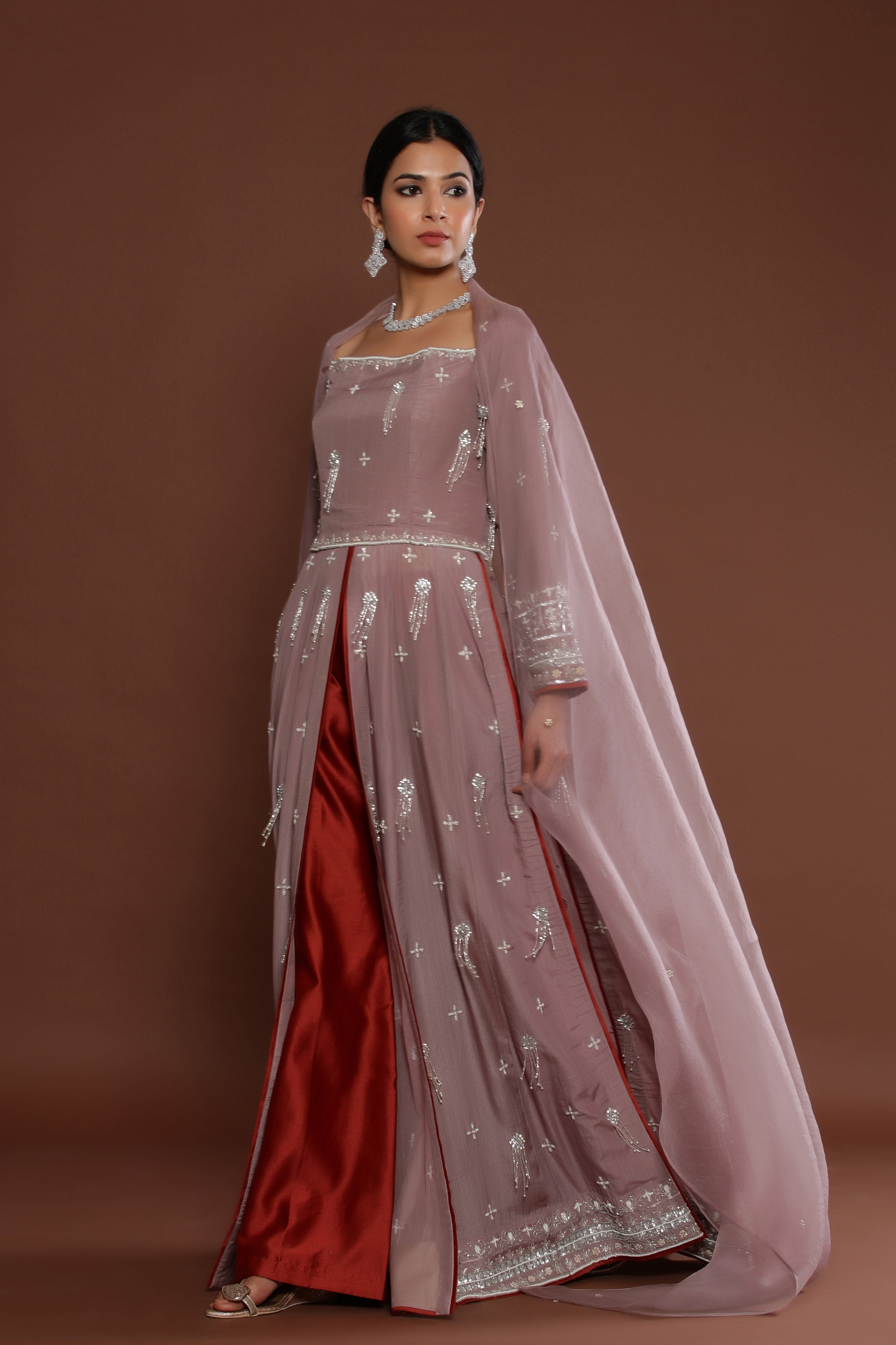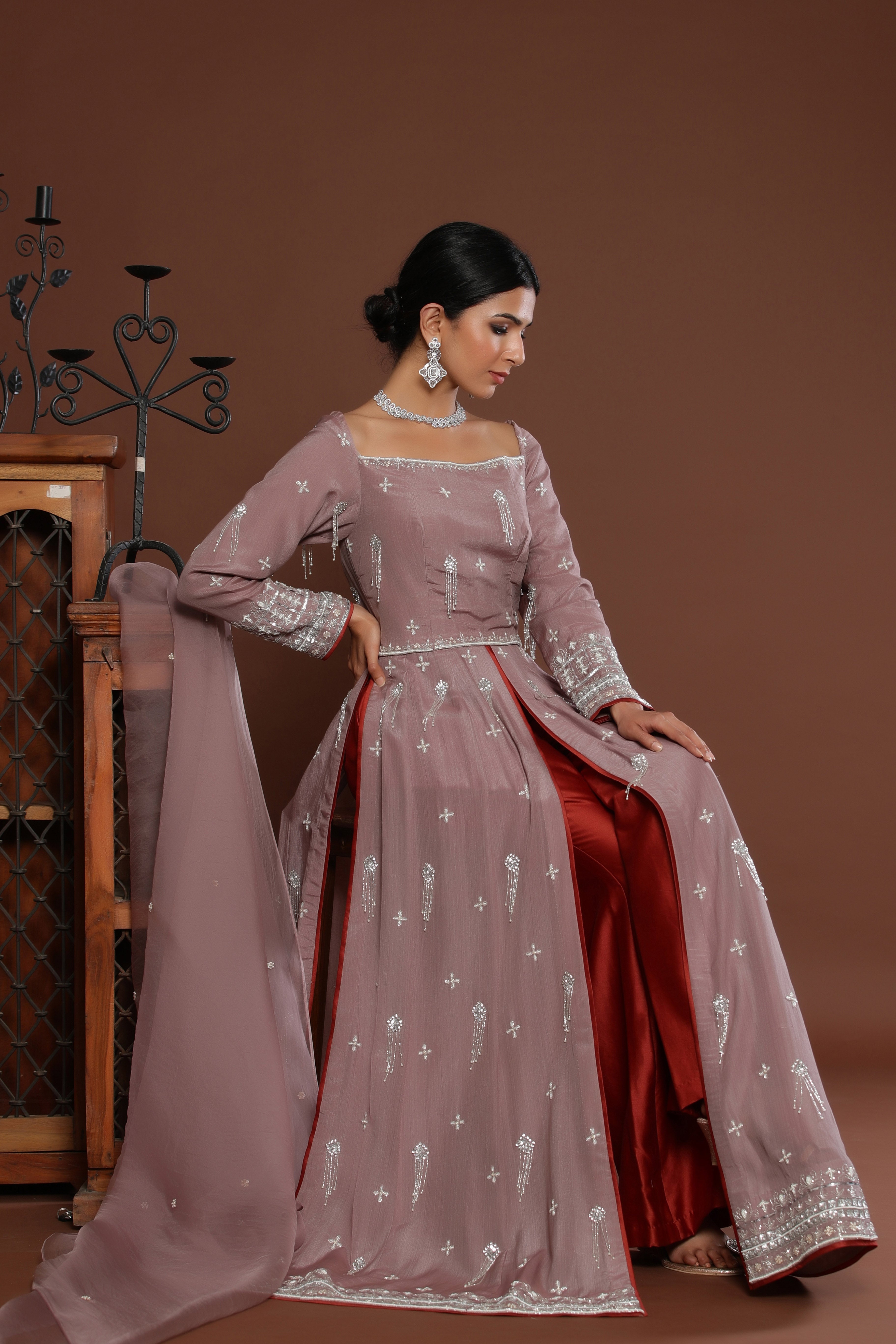 BROWN CHANDERI EMBROIDERED HIGH SLIT CUT OUT BELOW THE BODICE. THIS PIECE IS DECORATED WITH SILVER EMBELLISHMENTS ALL OVER AS WELL AS INTRICATELY HANDMADE BORDER. AND PAIRED WITH BRIGHT RUST BELL BOTTOM PANTS.