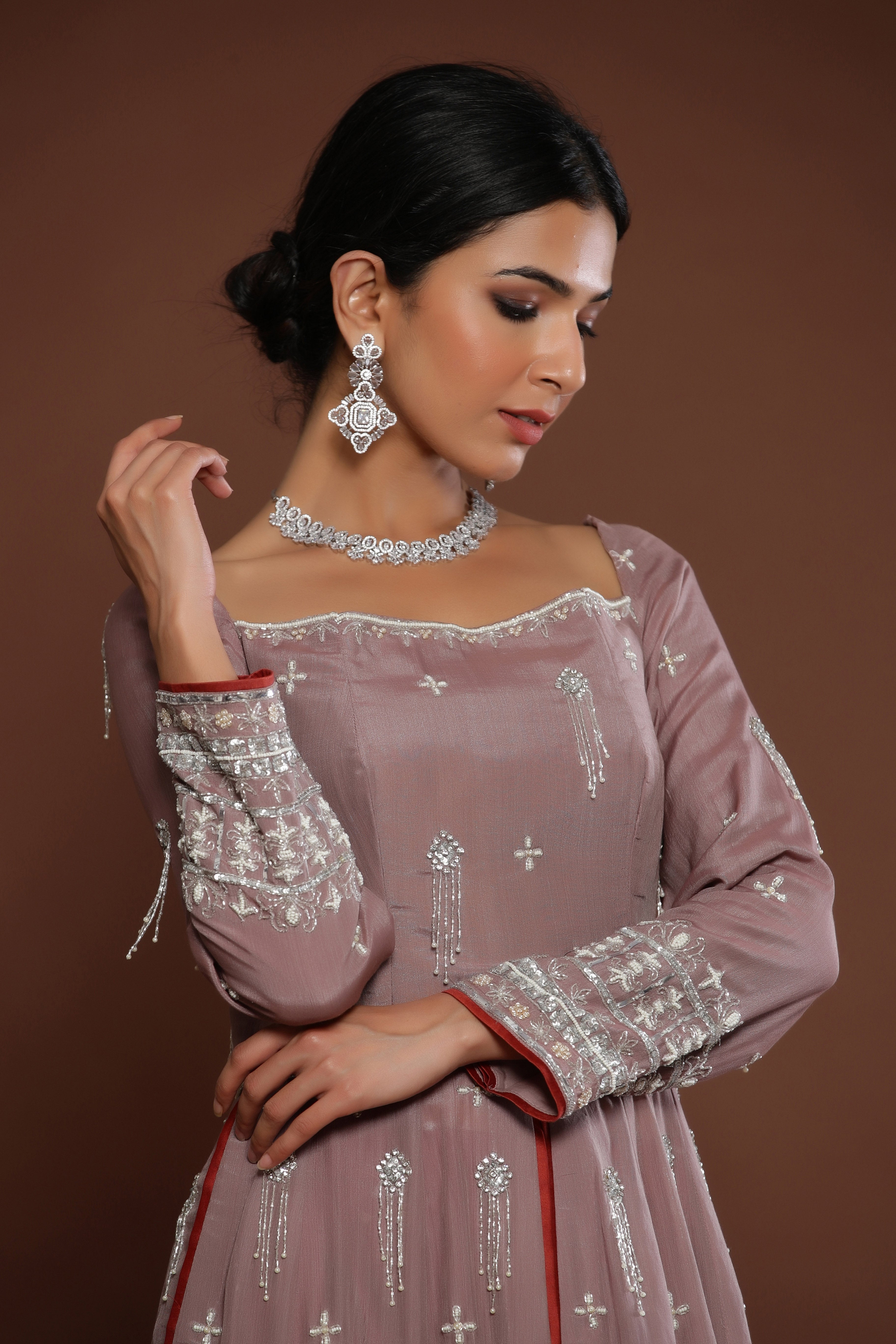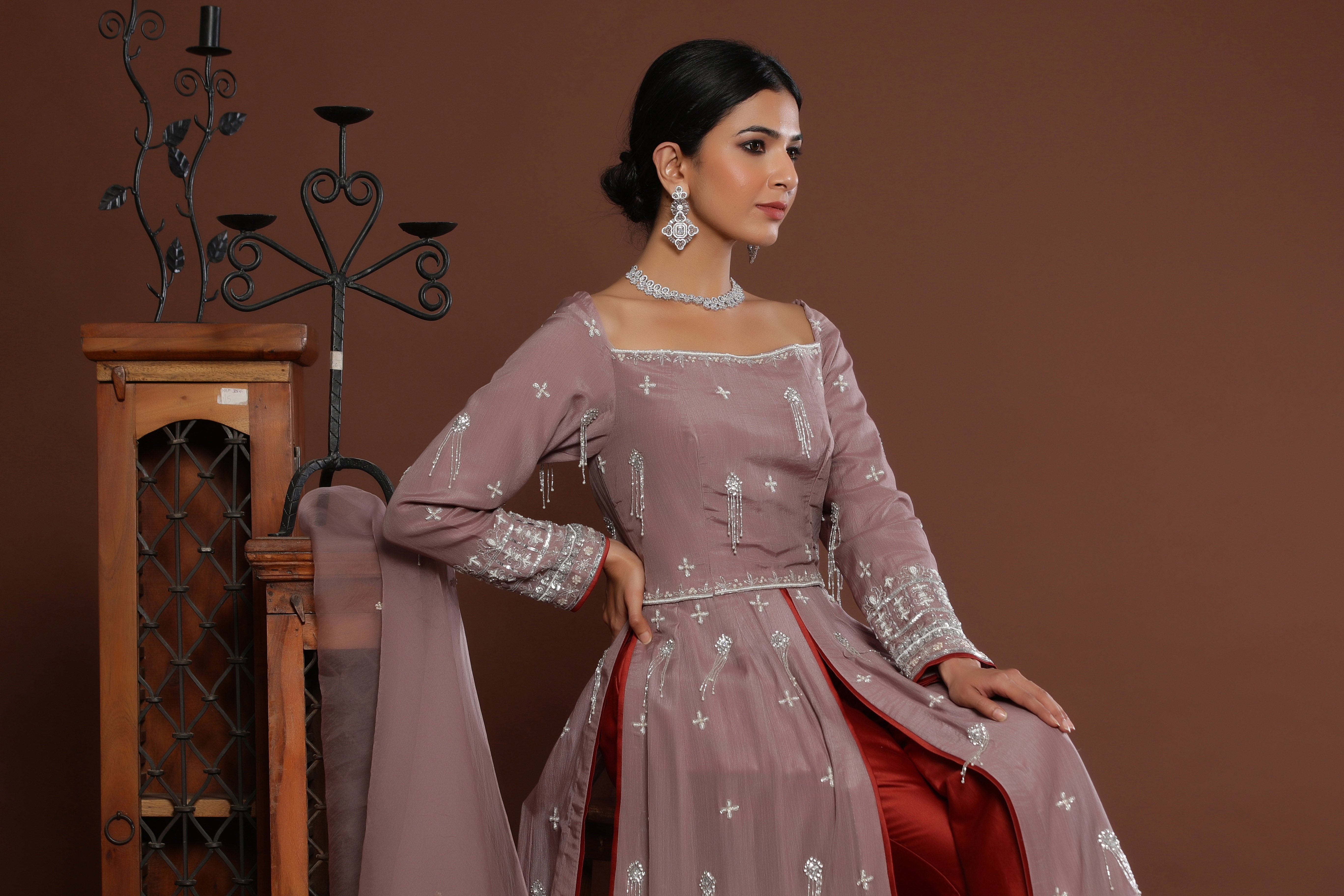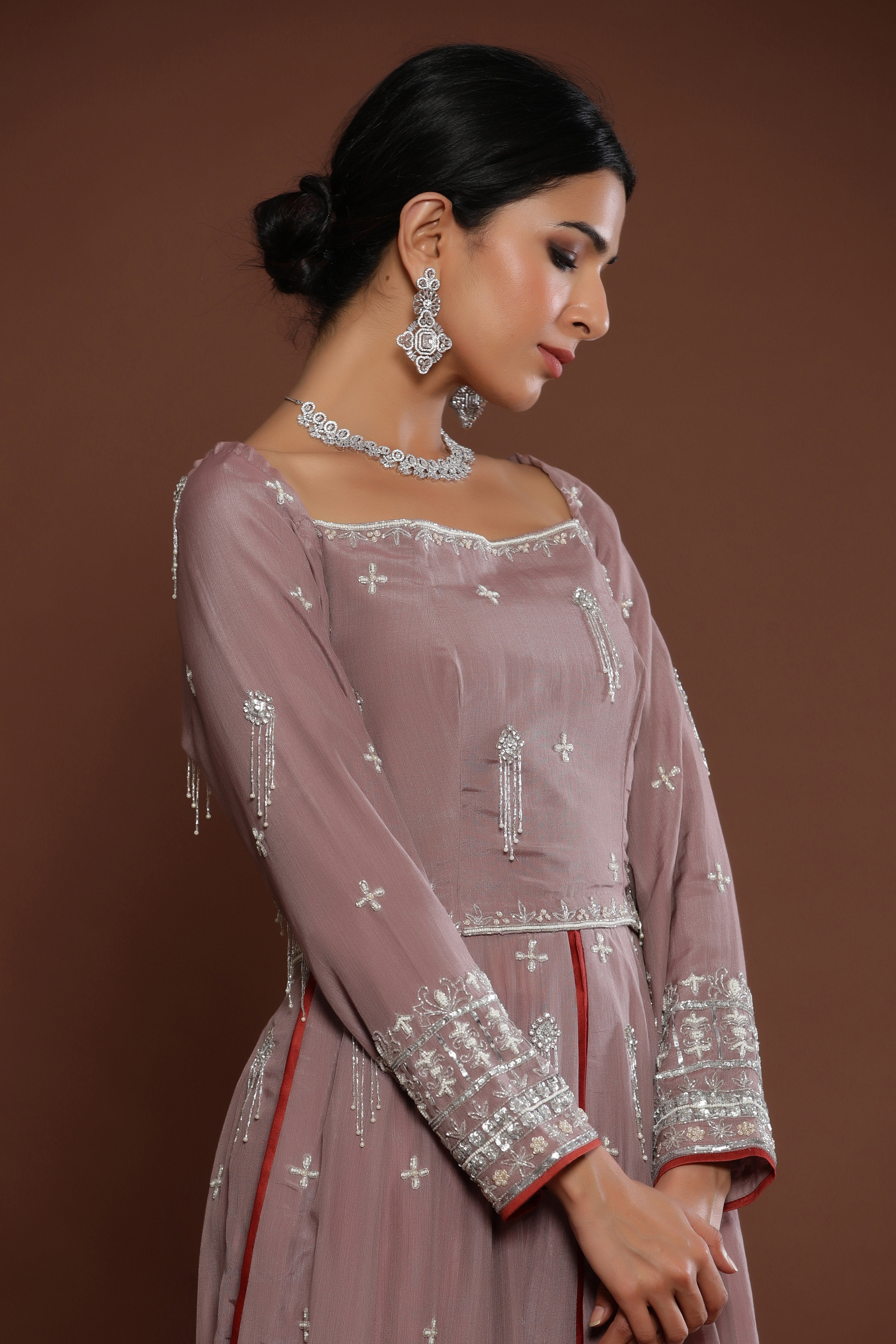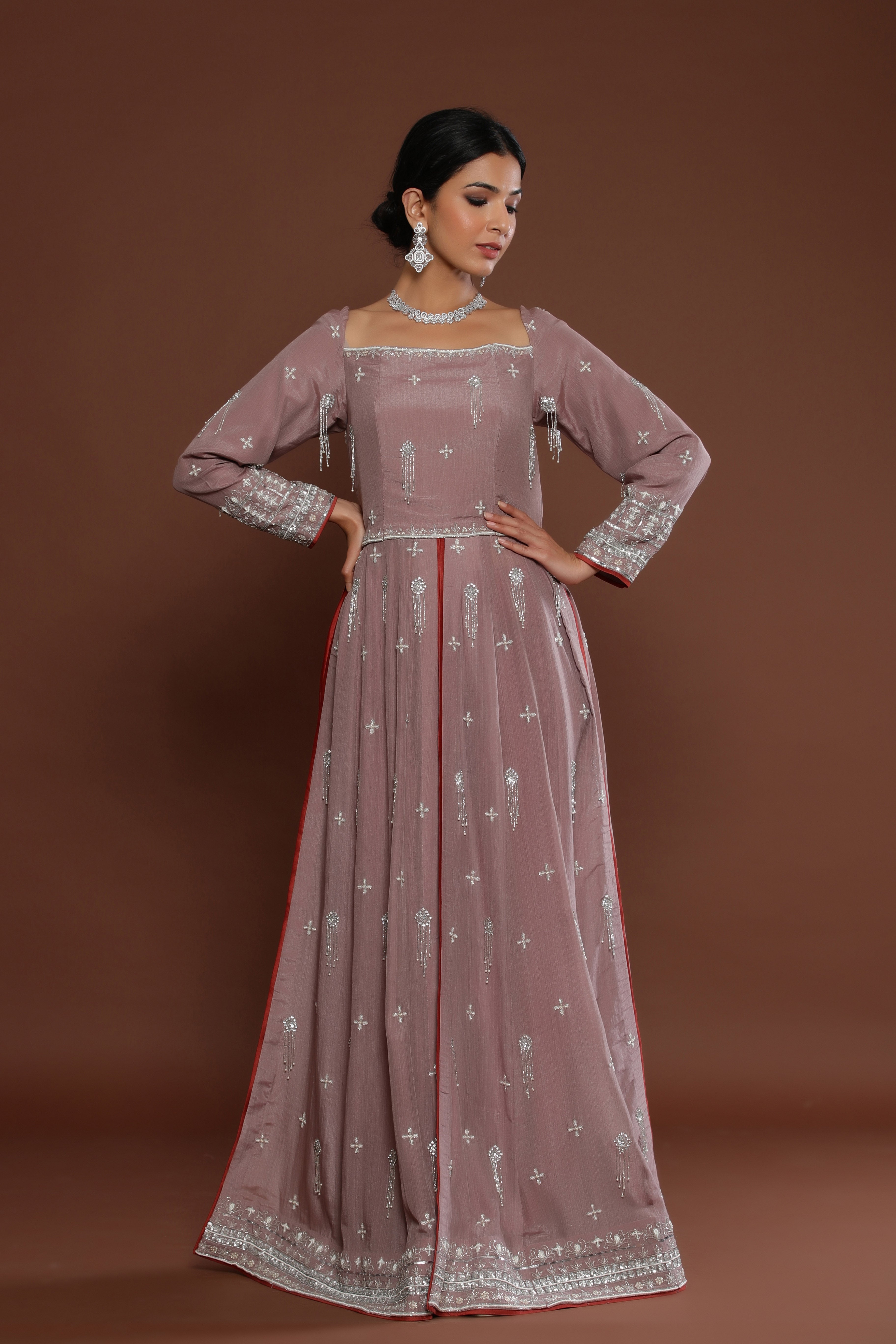BROWN CHANDERI EMBROIDERED HIGH SLIT CUT OUT BELOW THE BODICE. THIS PIECE IS DECORATED WITH SILVER EMBELLISHMENTS ALL OVER AS WELL AS INTRICATELY HANDMADE BORDER. AND PAIRED WITH BRIGHT RUST BELL BOTTOM PANTS.