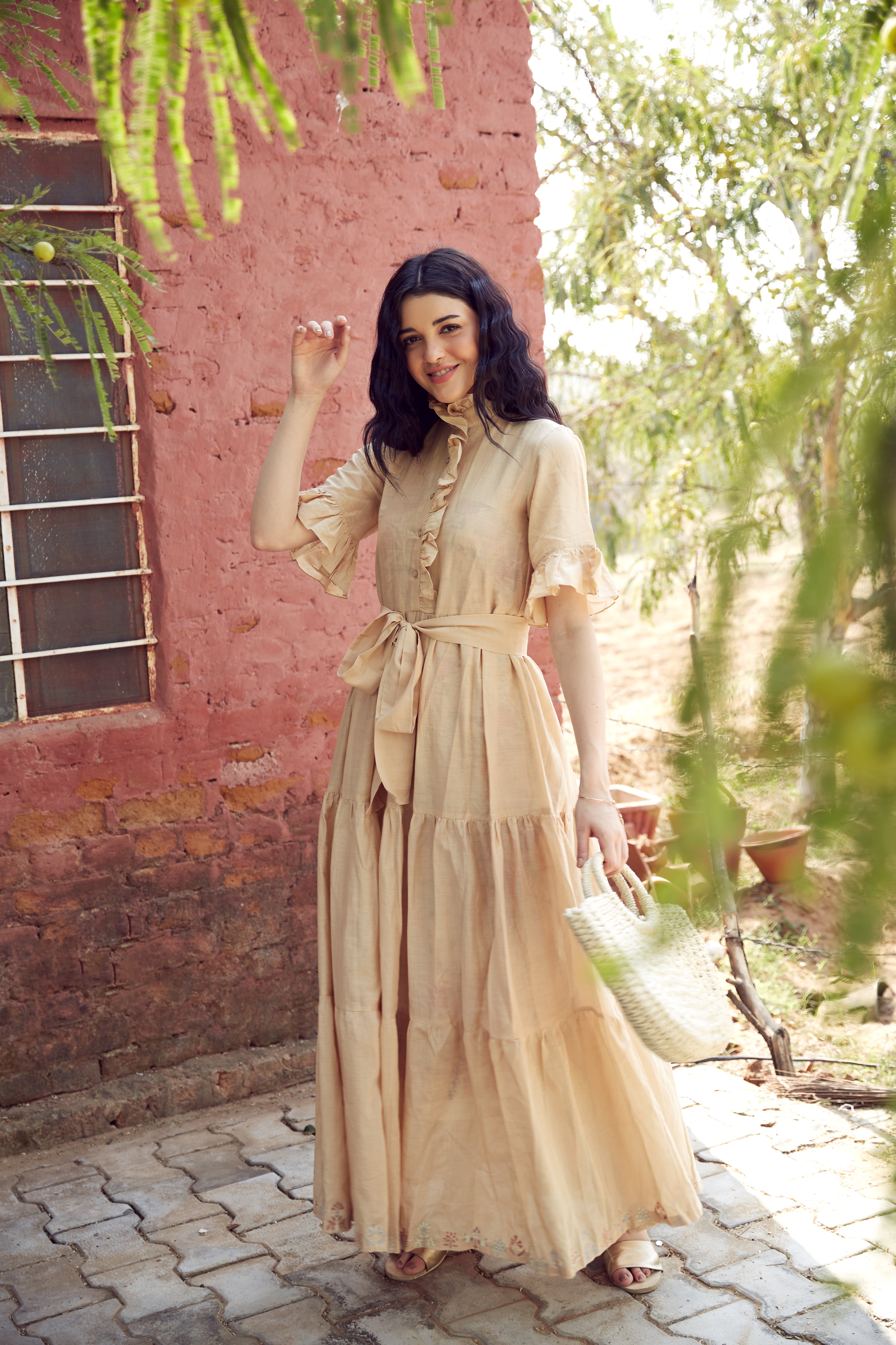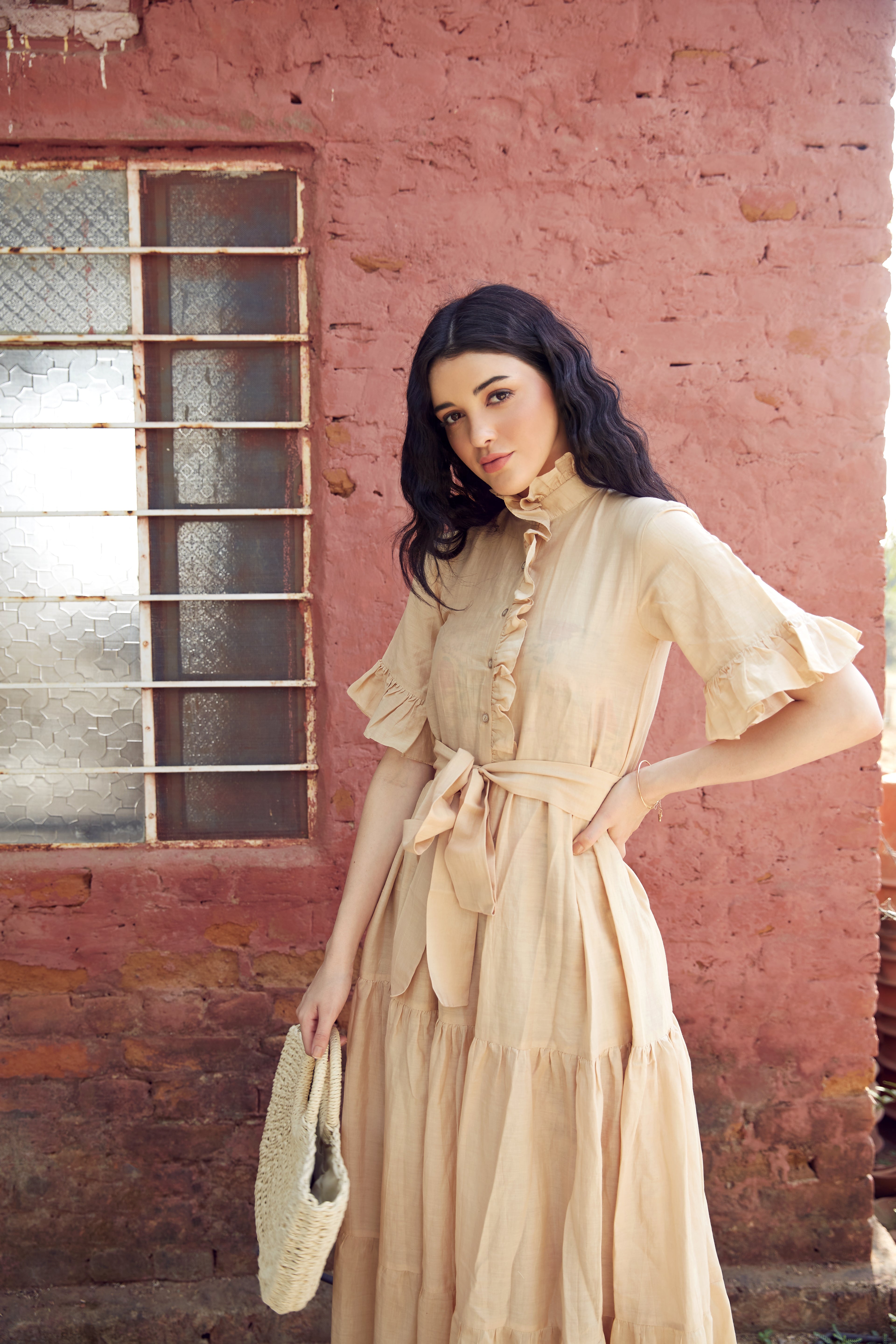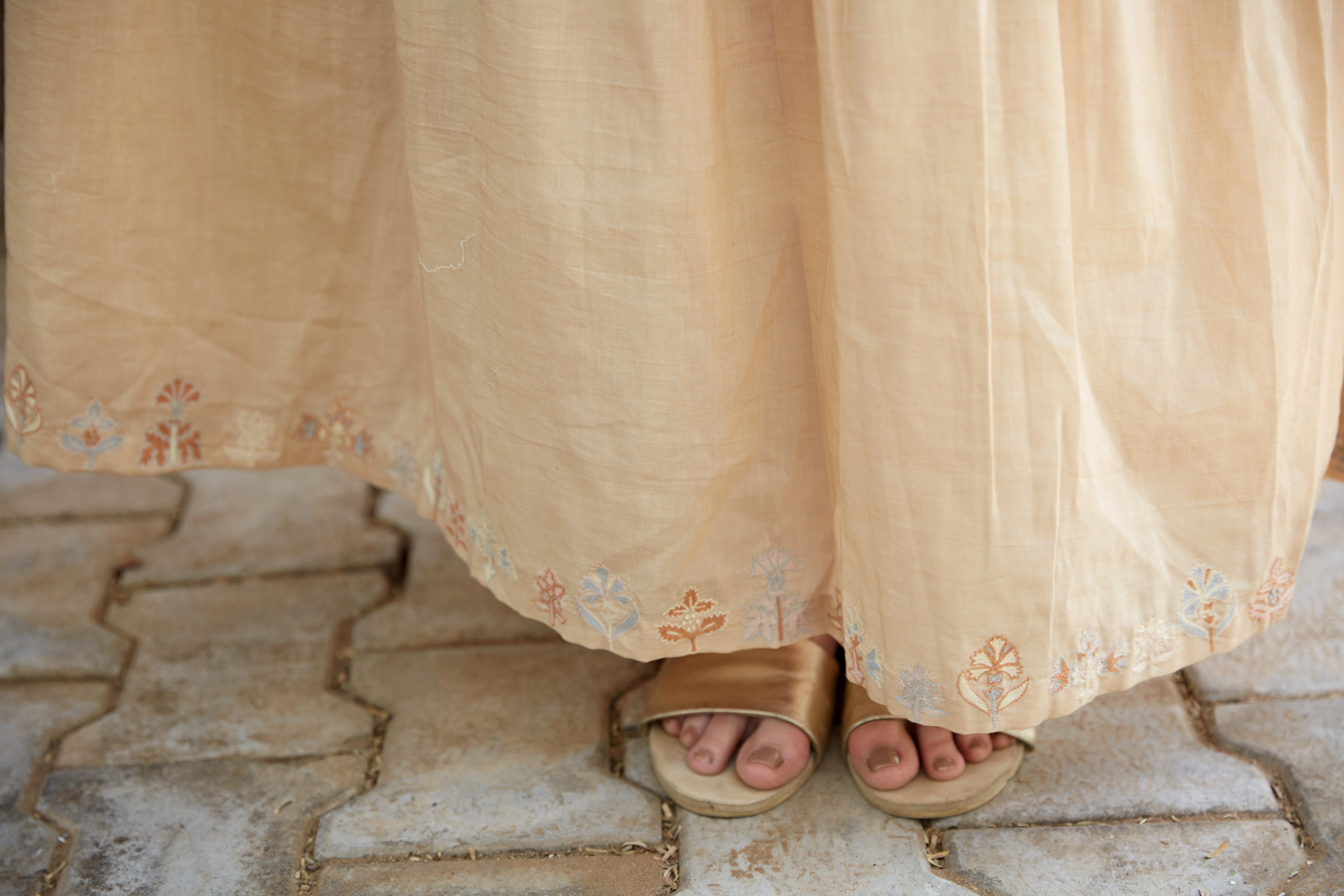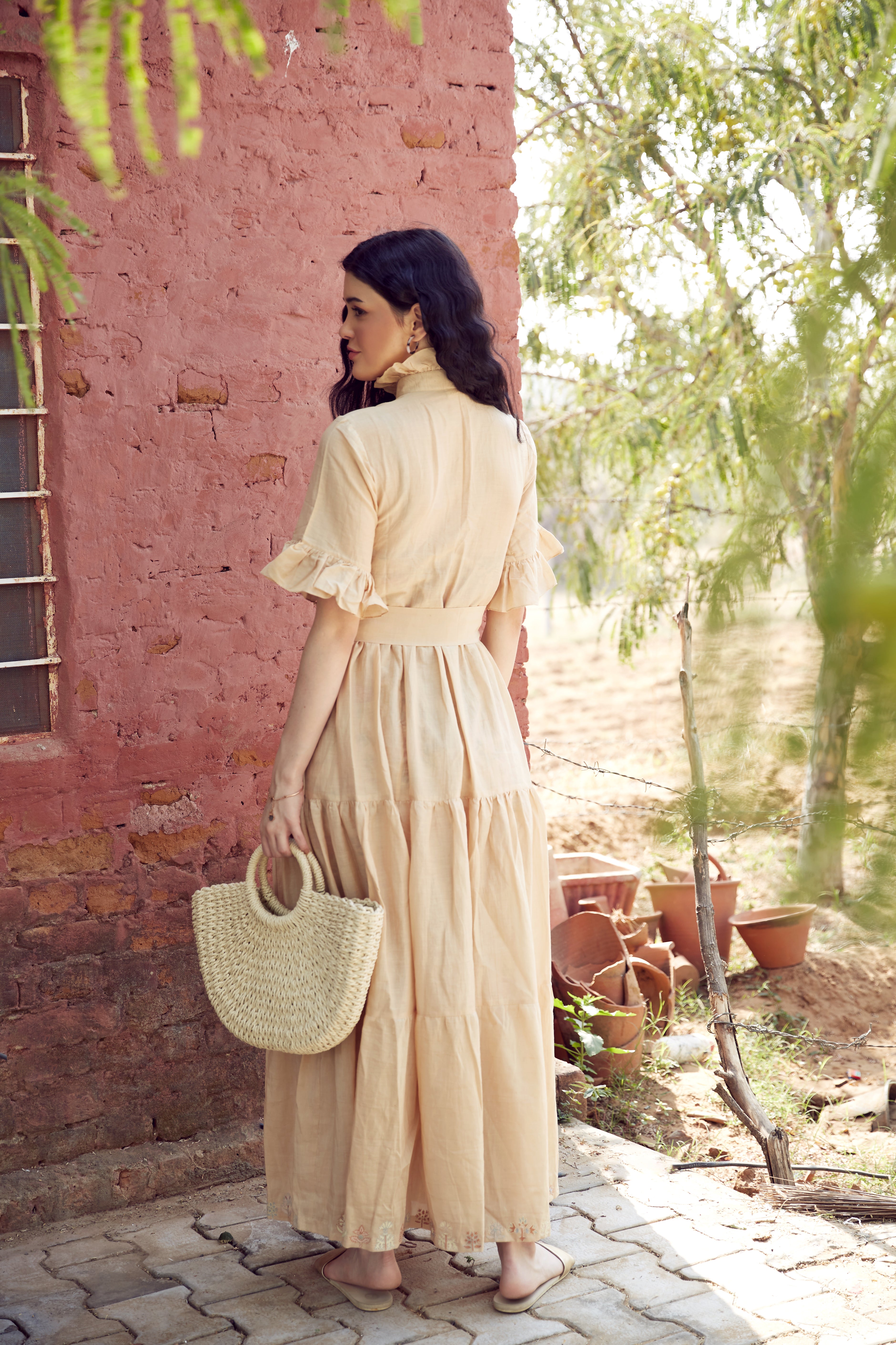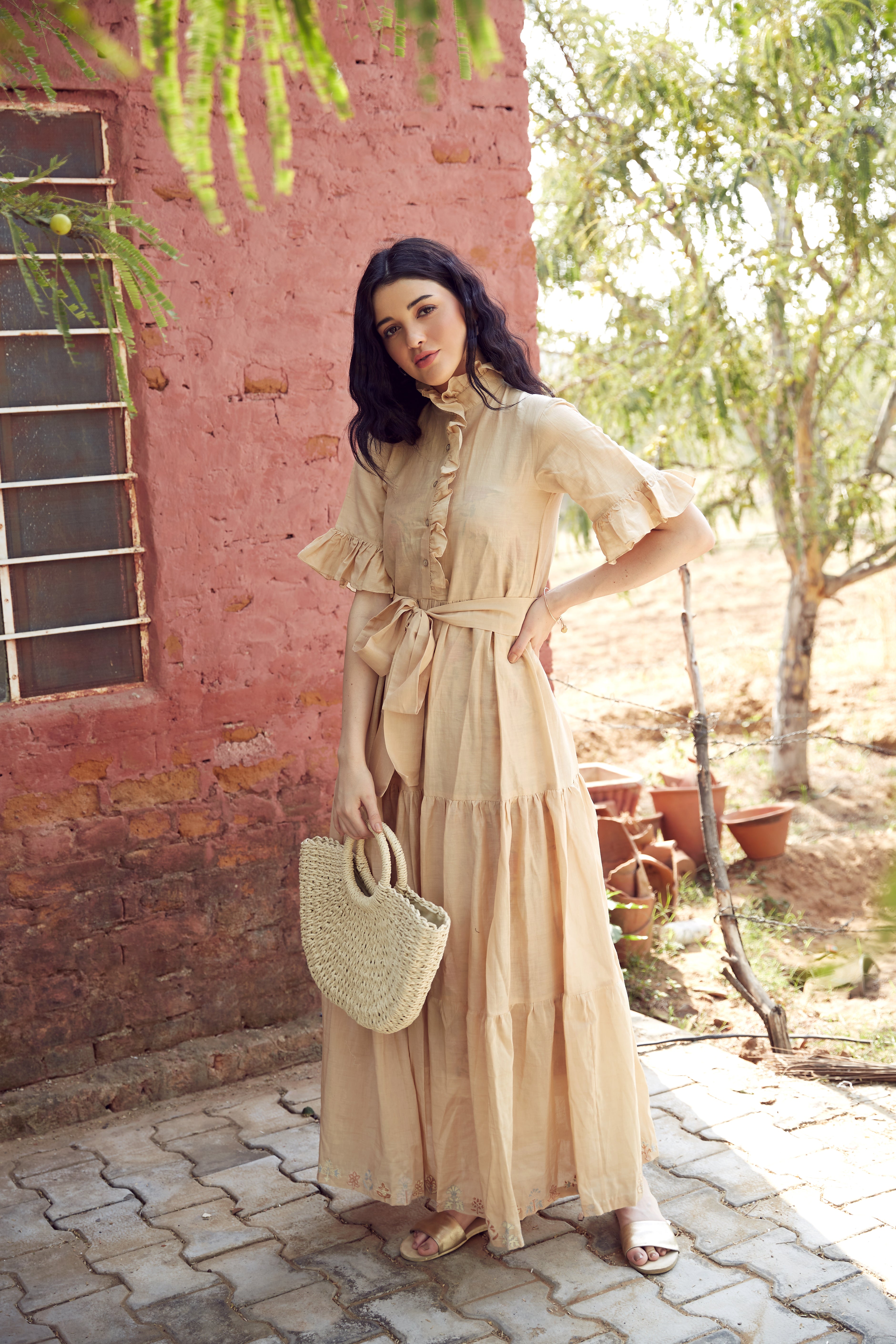 BEIGE COTTON TIERED DRESS WITH EMBROIDERY ON...