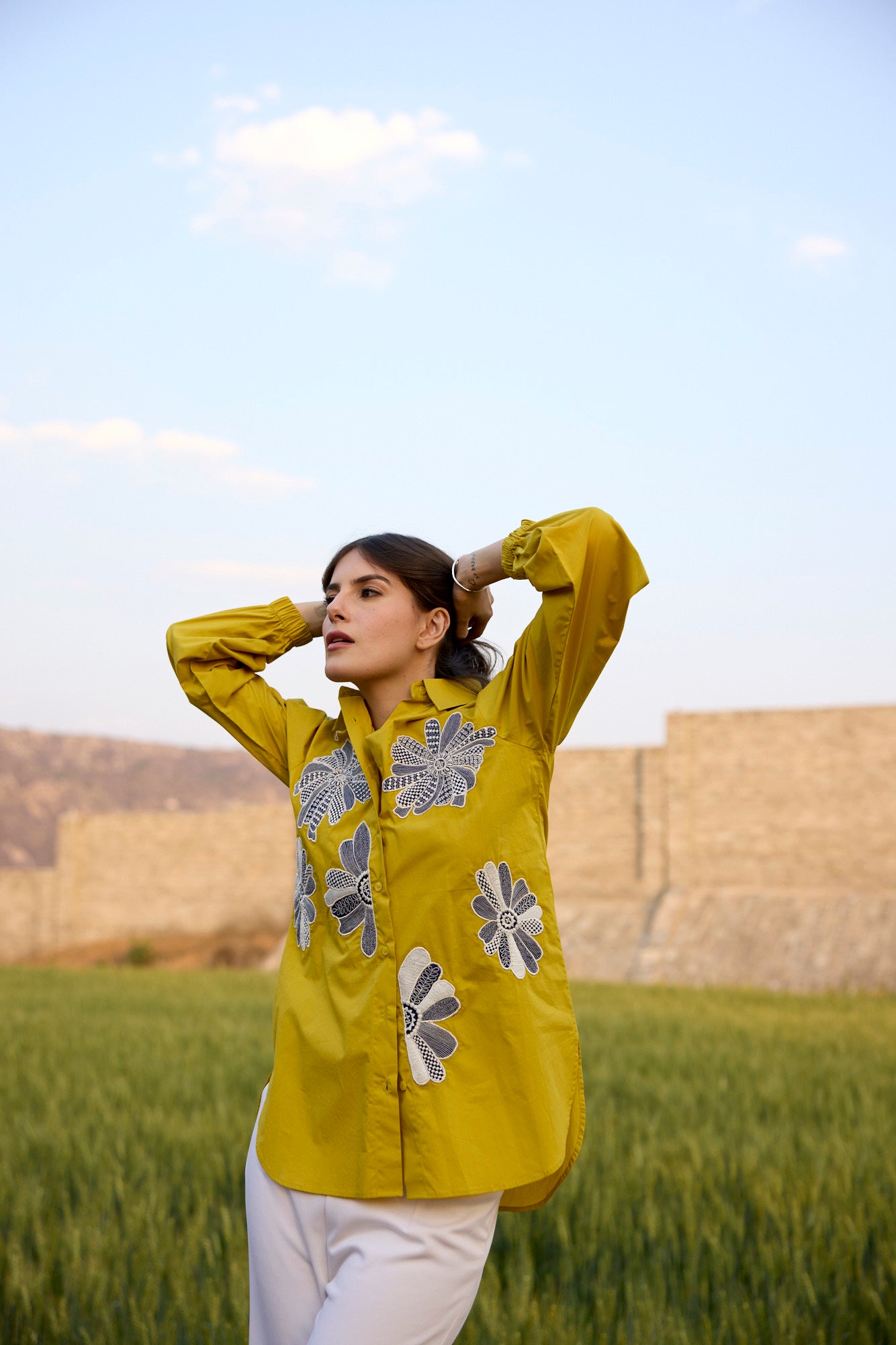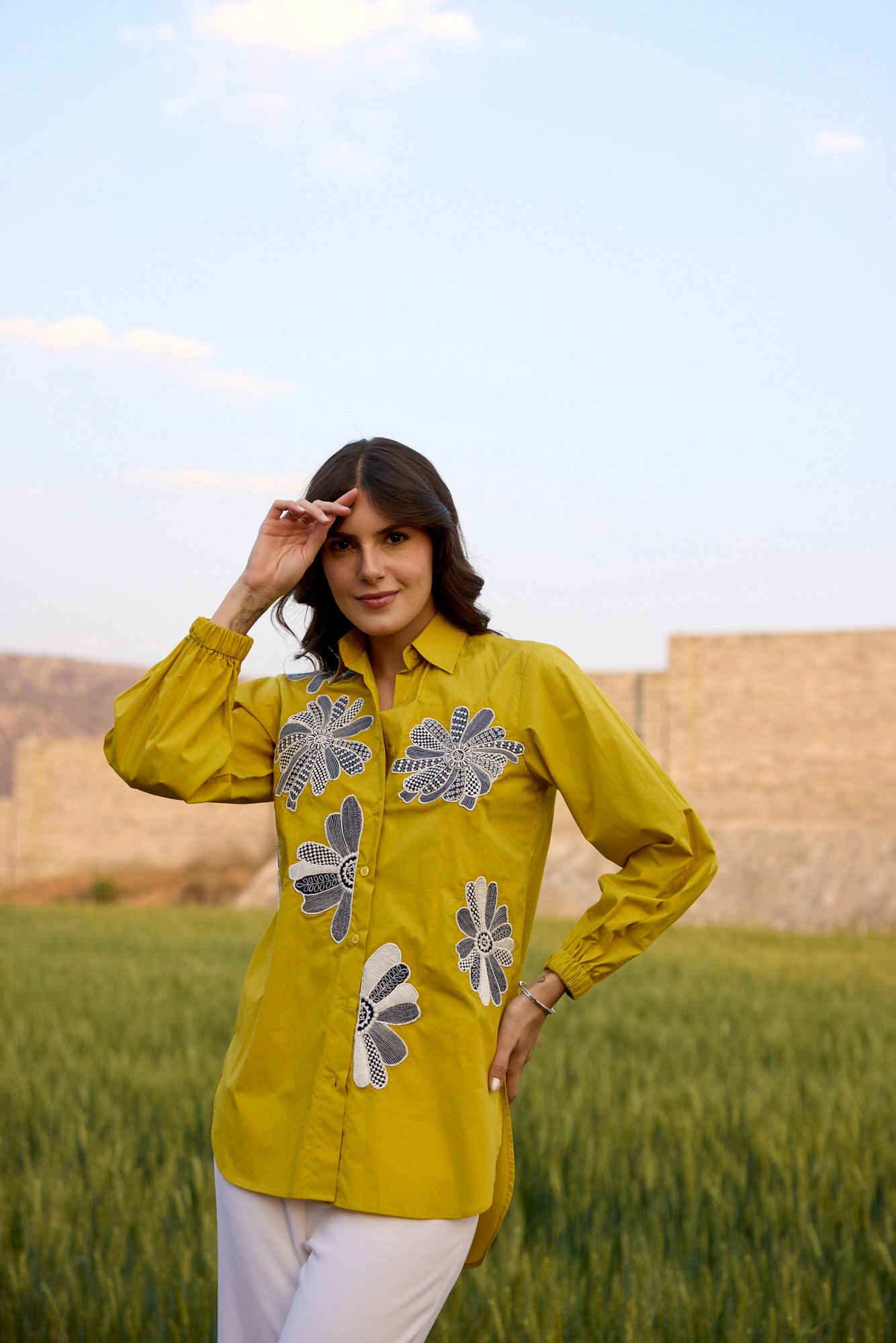 YELLOW SHIRT WITH BLUE MACHINE EMBROIDERY PATCH.