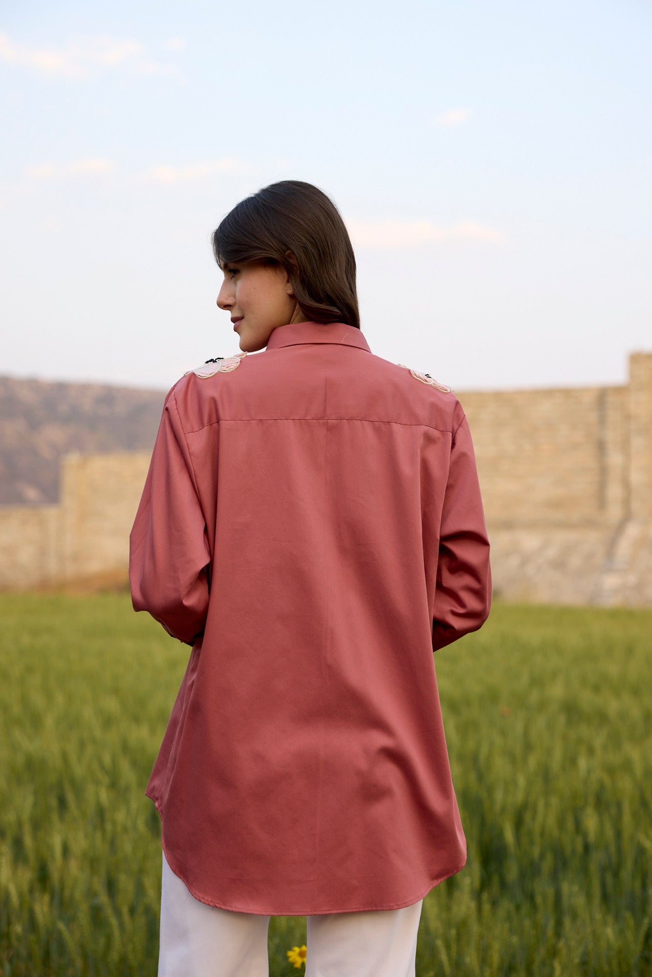 CORAL RED SHIRT WITH PINK FLOWER SEQUIN PATCH