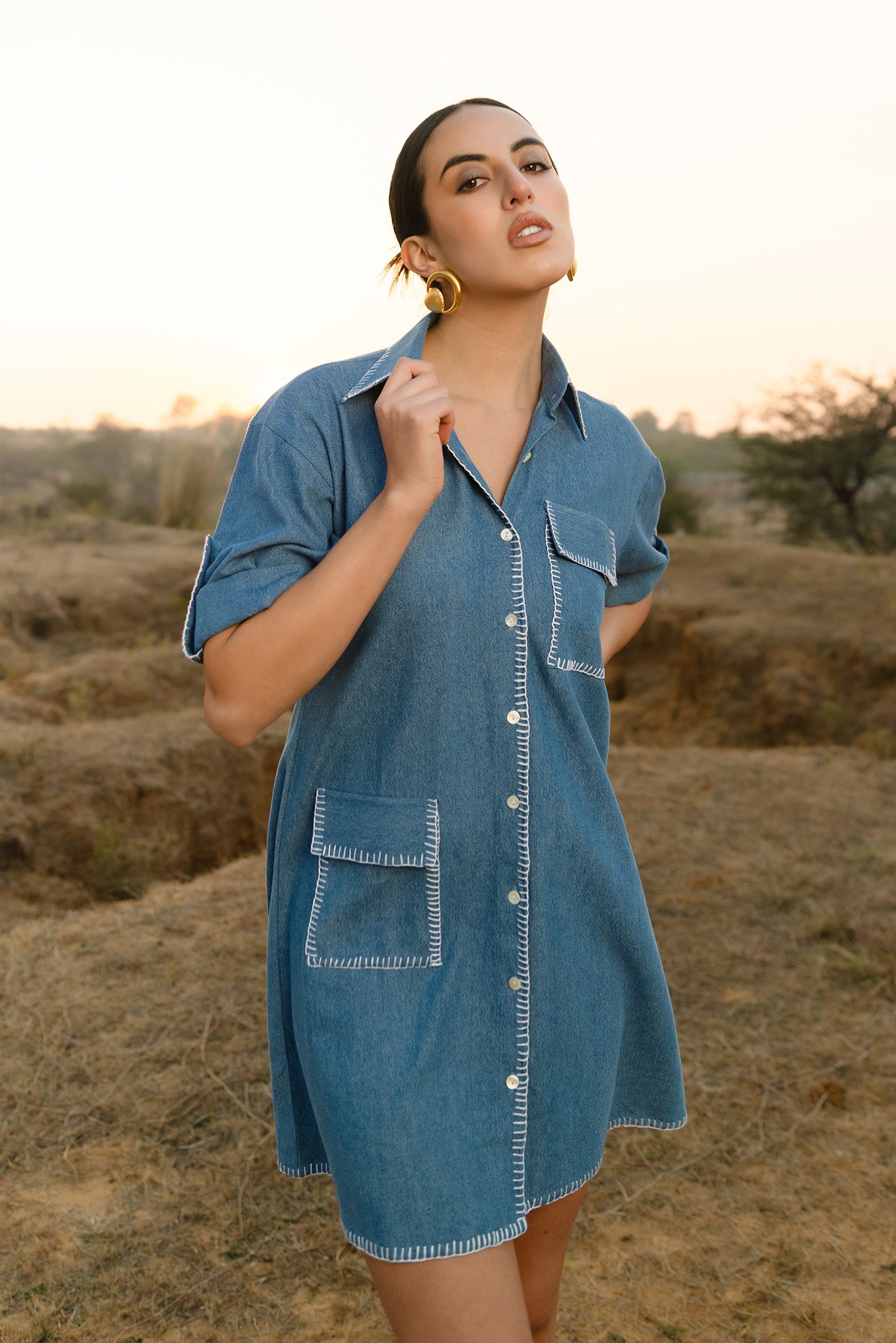 DENIM DRESS WITH WHITE THREAD DETAILING (...