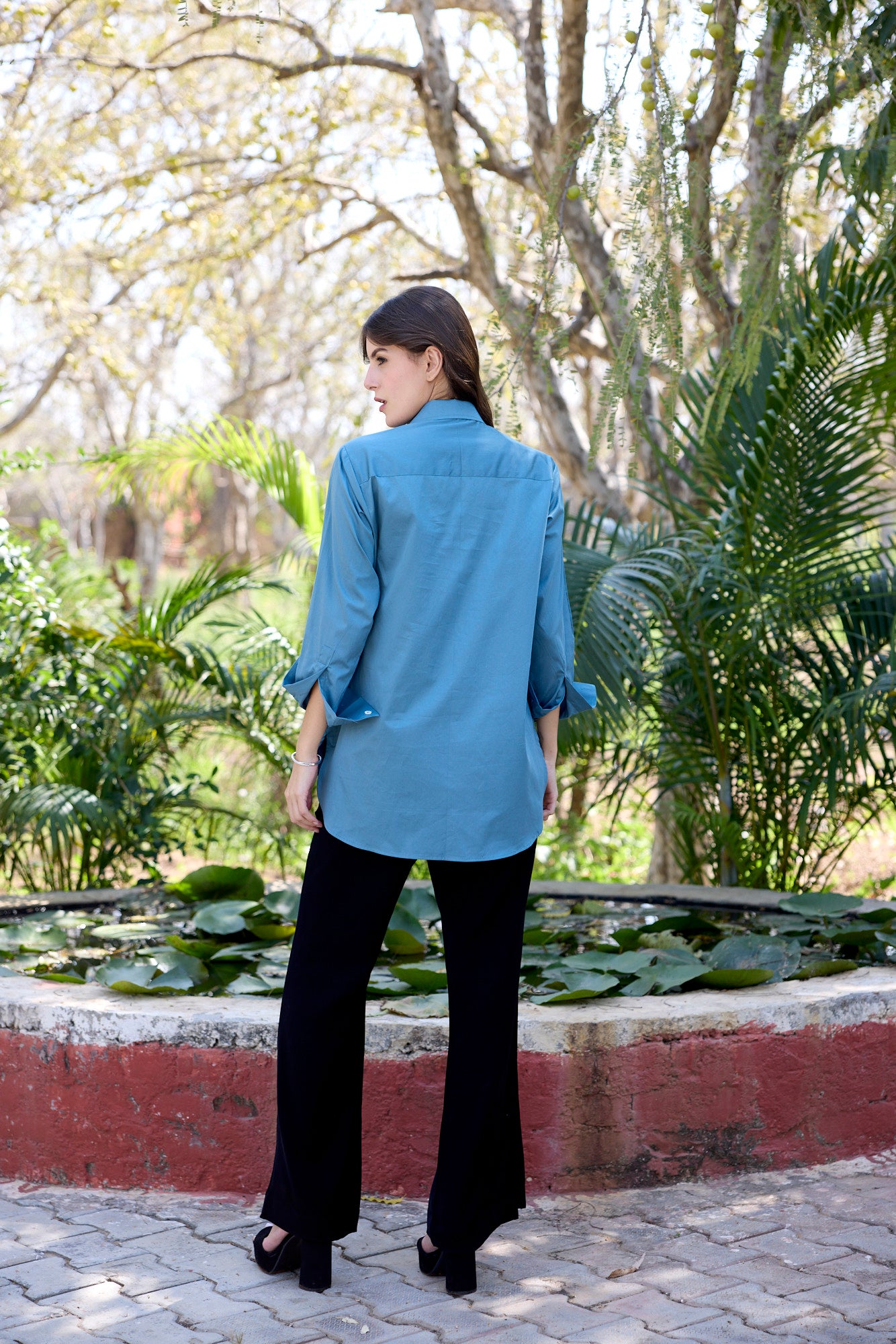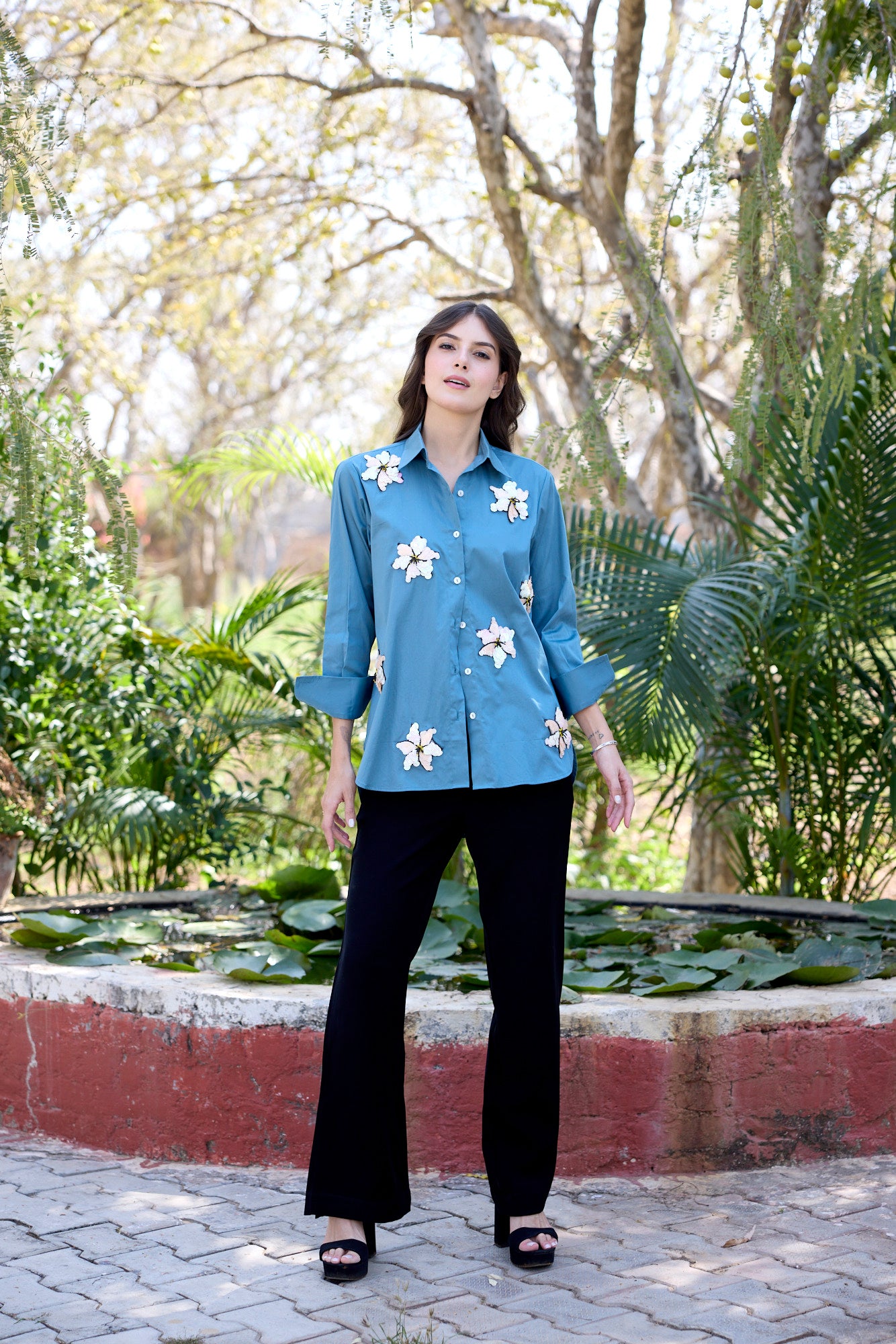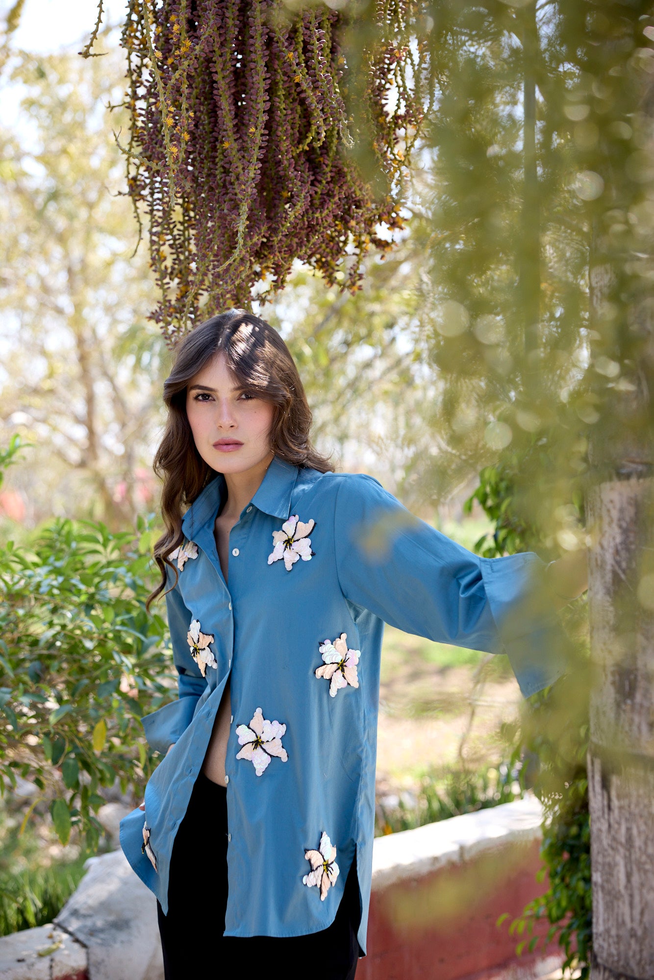 INDIGO BLUE SHIRT ADORNED WITH PEACH AND...