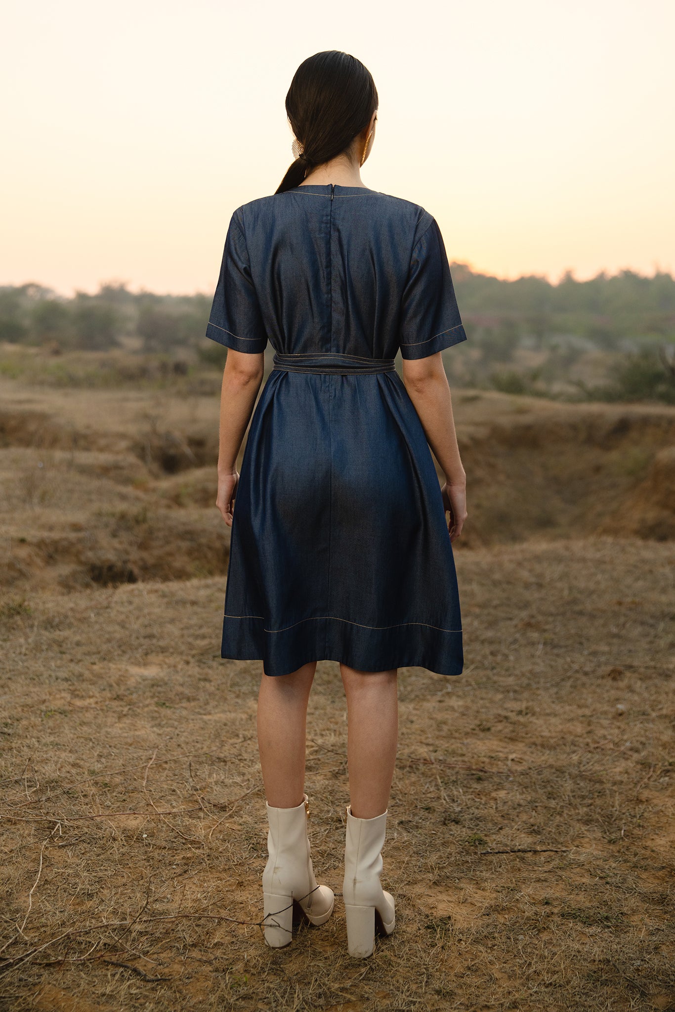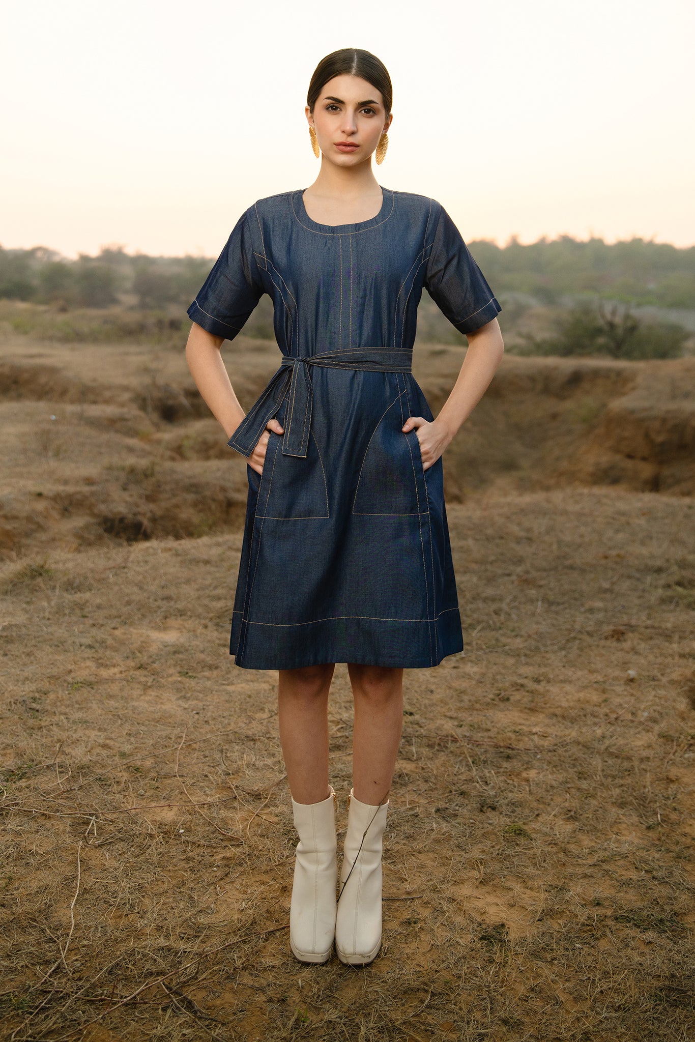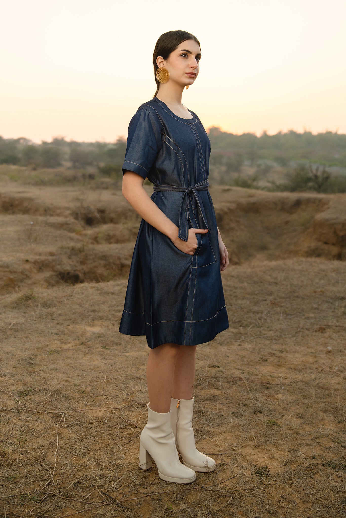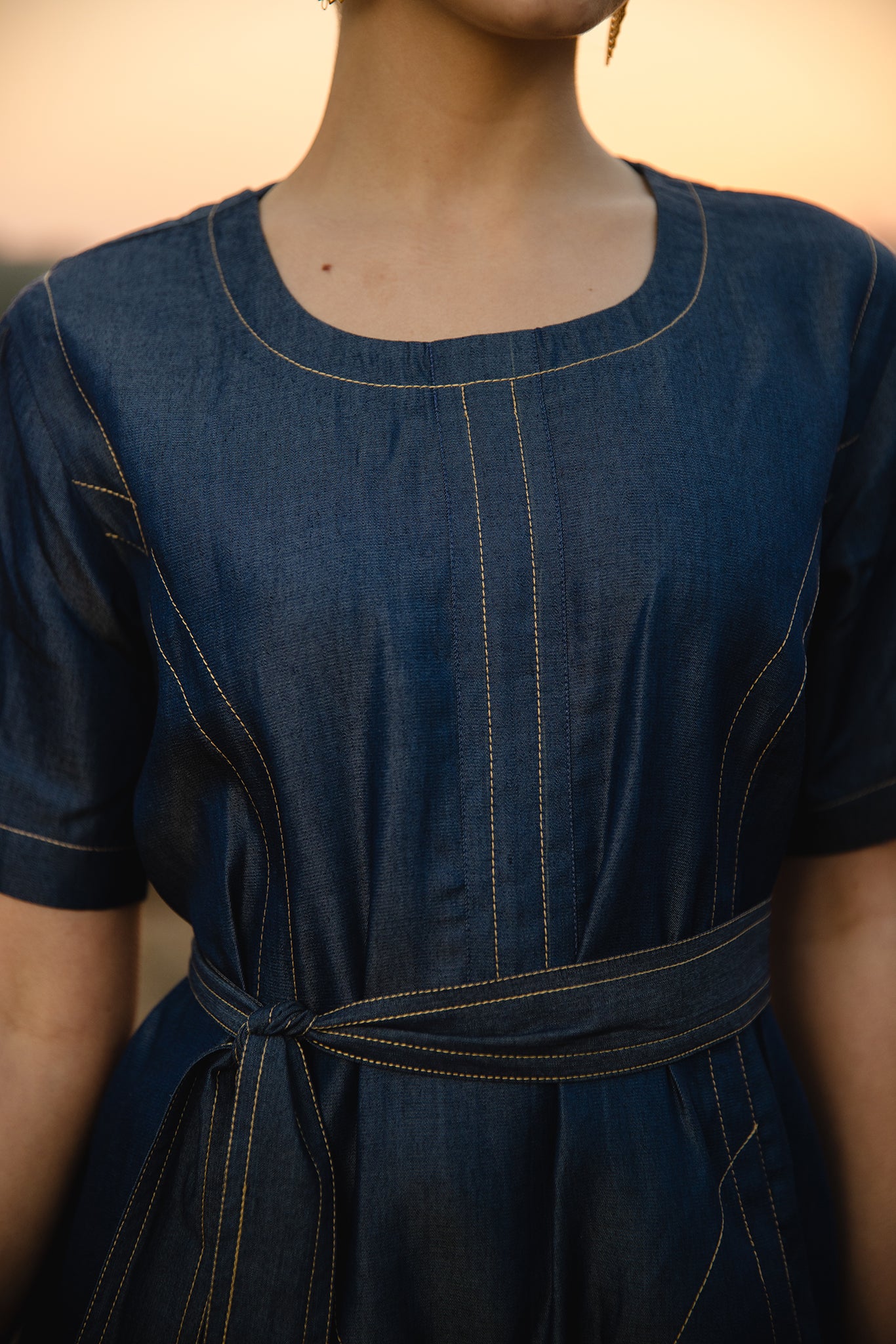 ROUND NECK DENIM DRESS WITH BELT( TOP...