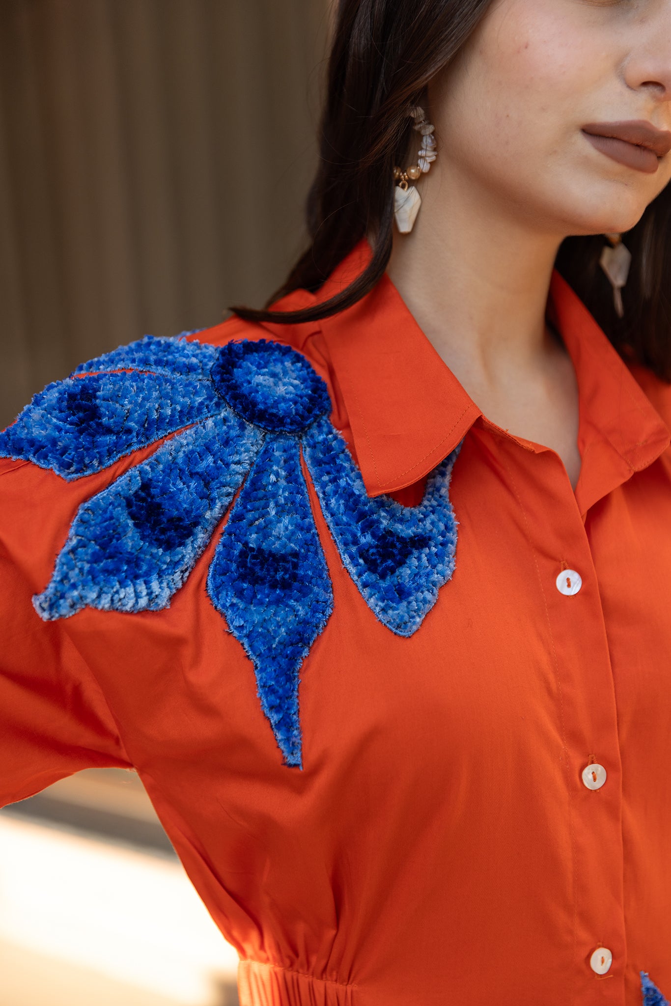 ORANGE SHIRT DRESS WITH BLUE FLOWER