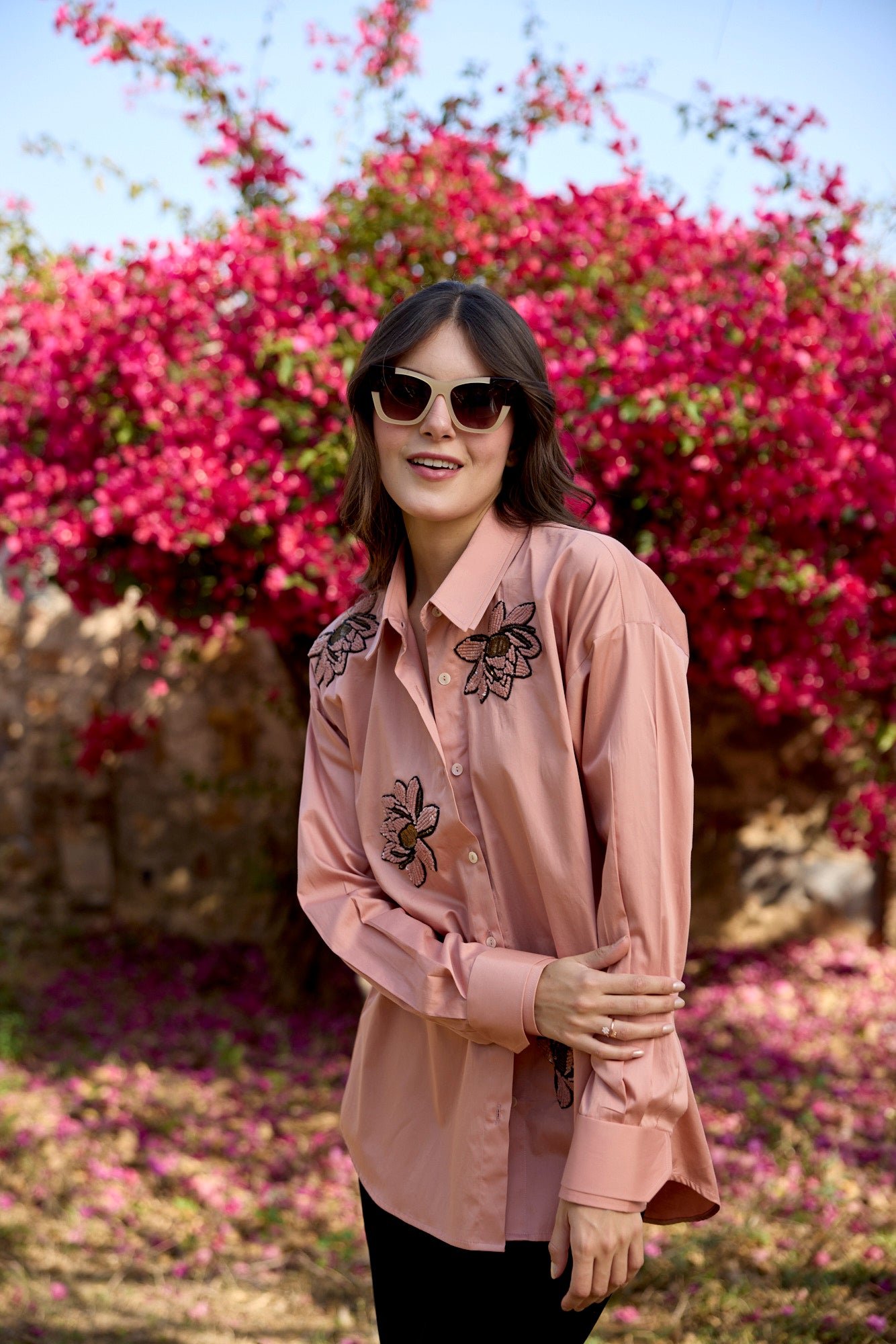 - Shirt is embellished with sequin lotus design patches.